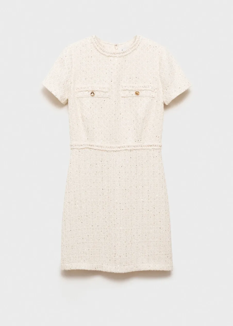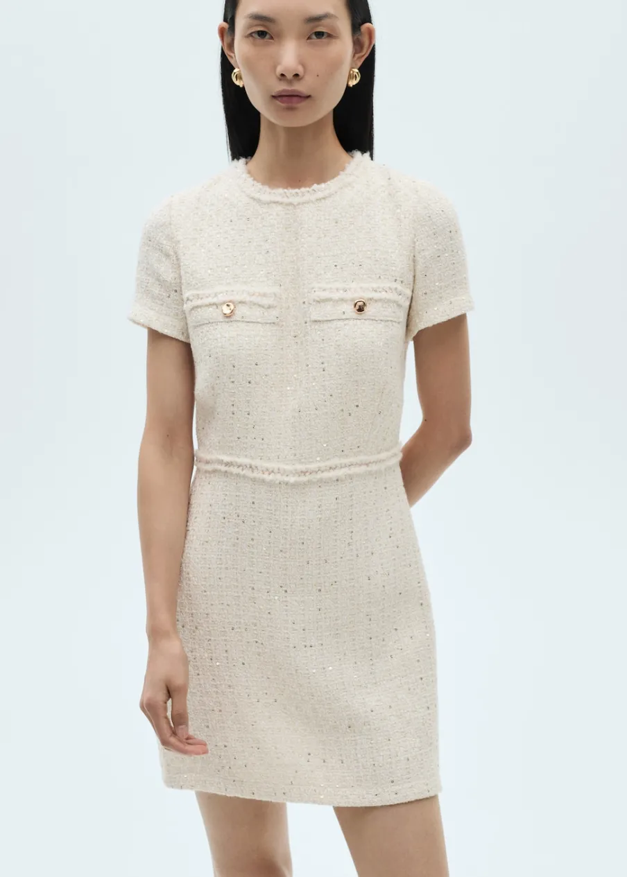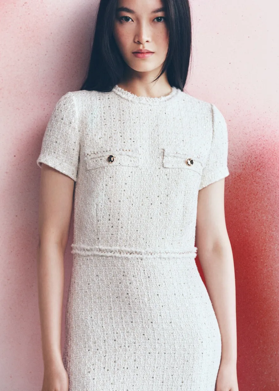 Tkanina tweedowa. Model prosty. Krótki krój. Okrągły dekolt. Krótki rękaw. Dwie wpuszczane kieszenie z patkami na piersi. Zapięcie z tyłu na suwak. Szew w talii. Wewnętrzna podszewka.