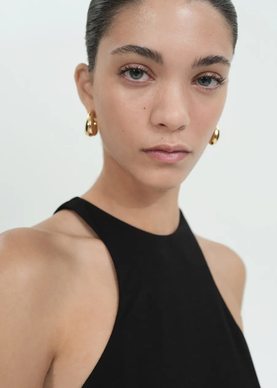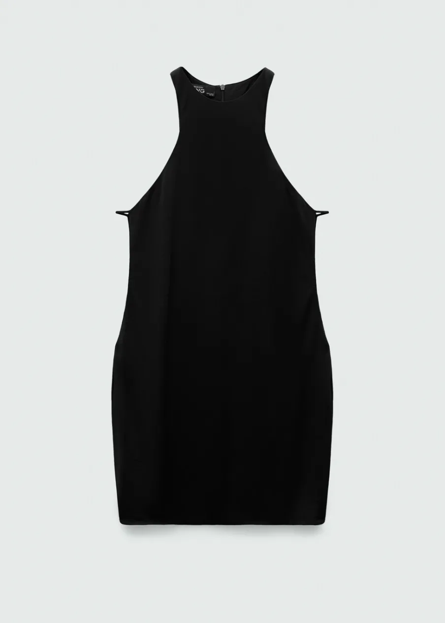 Lejąca tkanina. Krótki krój. Okrągły dekolt. Dekolt w stylu halter. Bez rękawów. Zapięcie z tyłu na kryty suwak. Rozcięcia po bokach. Paski po bokach. Modelka ma 177 cm wzrostu i nosi rozmiar S/36. Kolekcja wizytowa. Kolekcja Selection.
