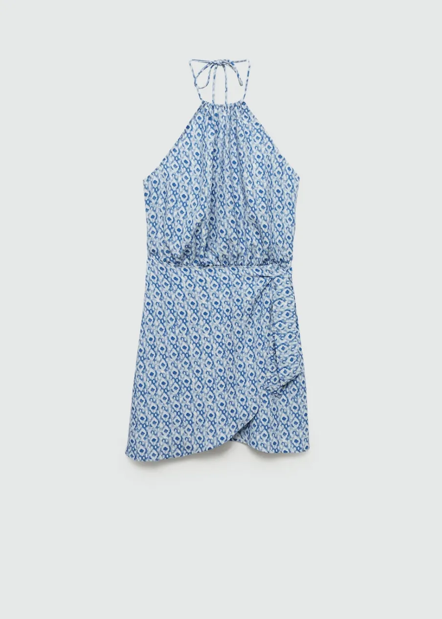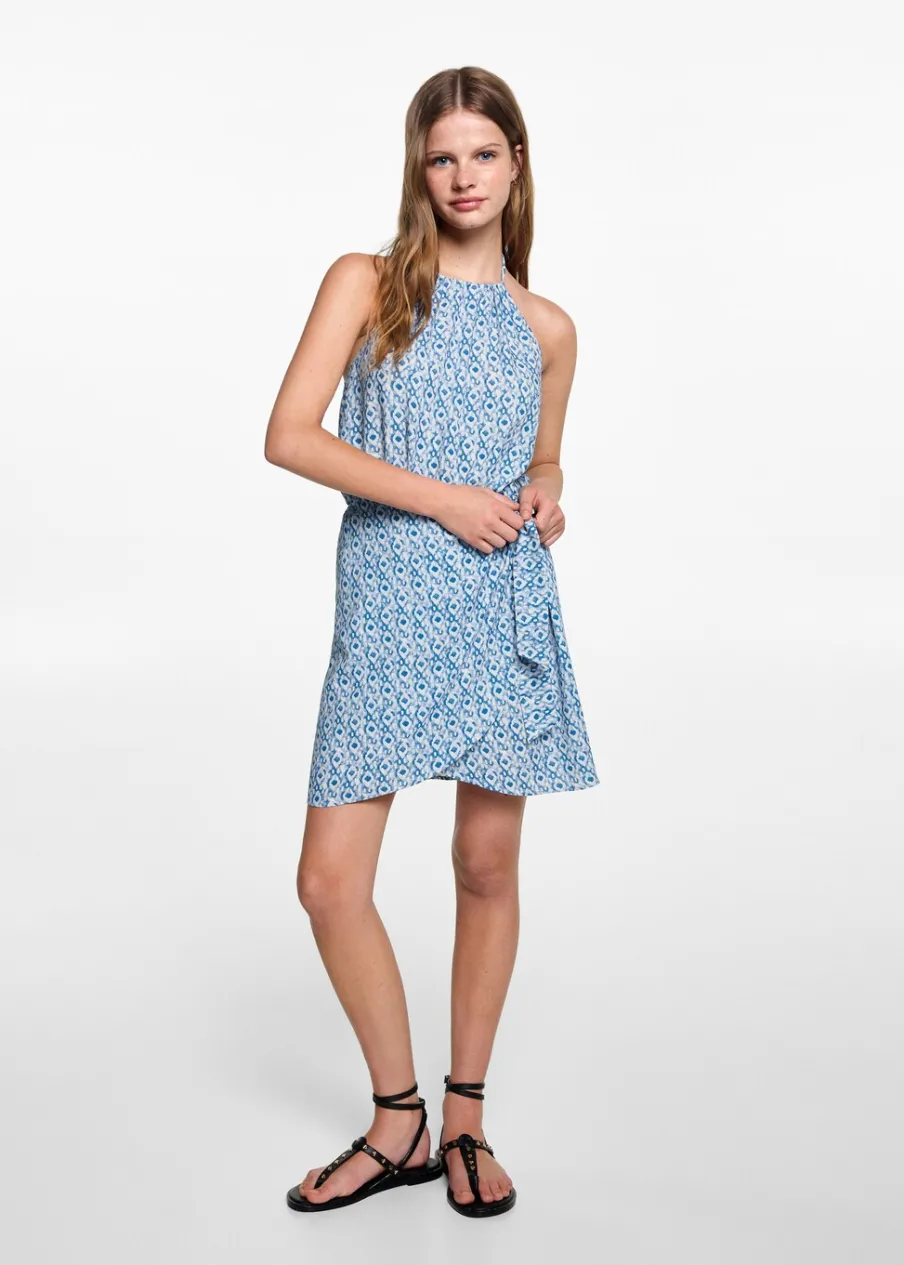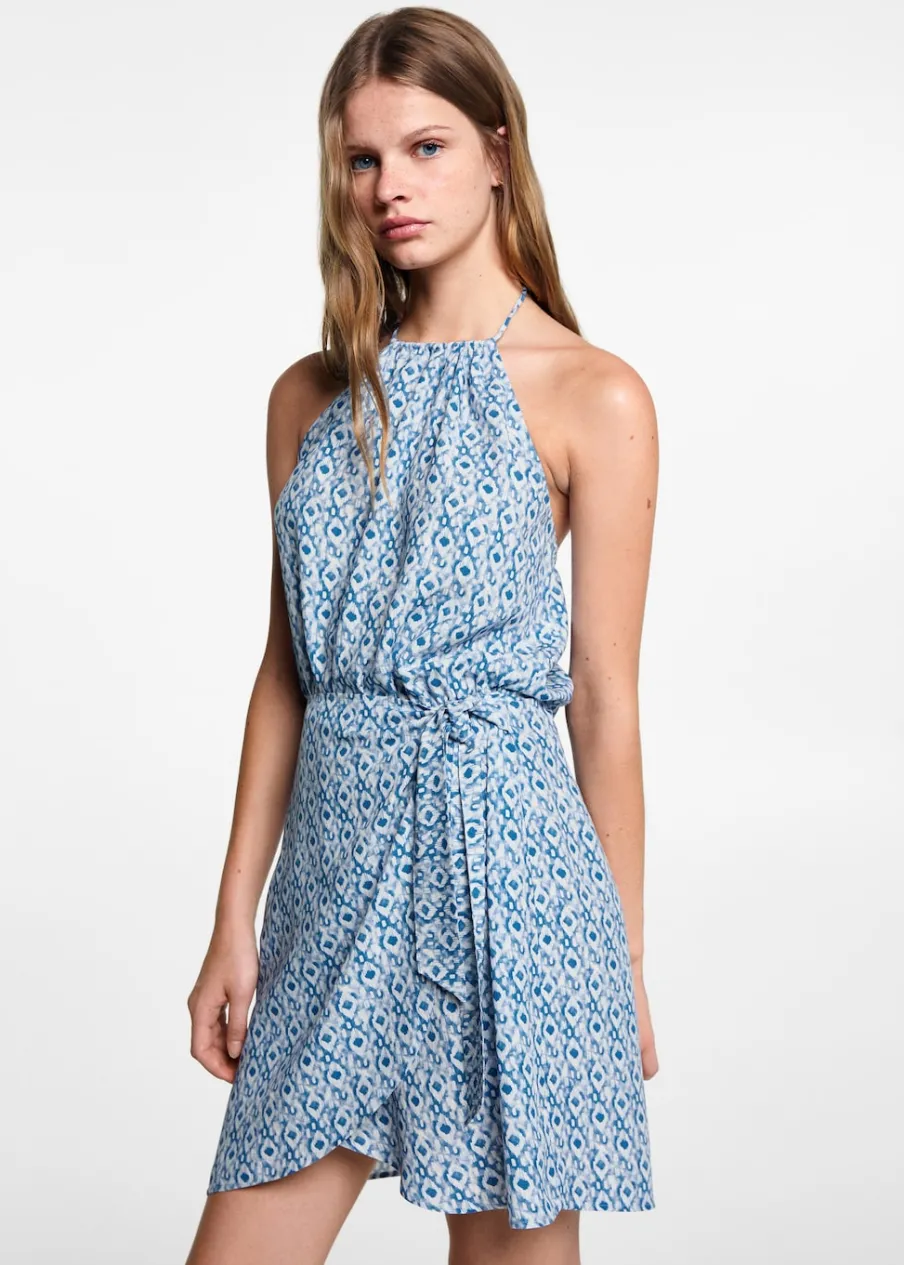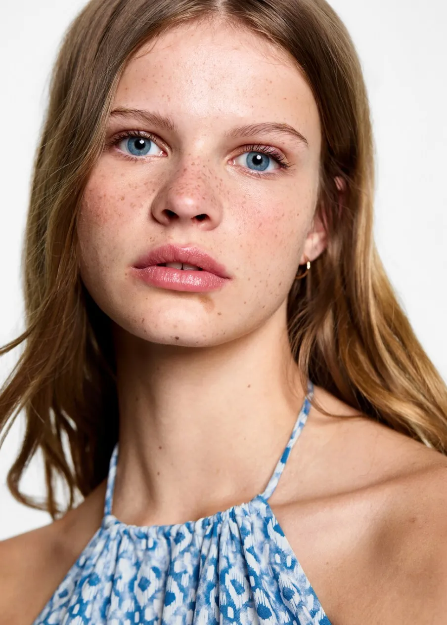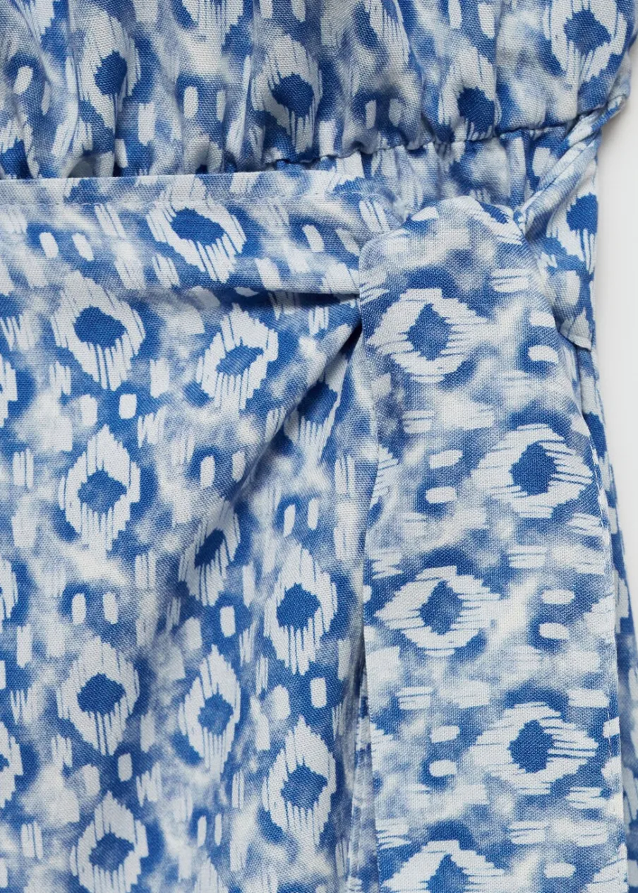 Krótki krój. Model prosty. Plecy z wycięciem. Golf. Cienkie paski skrzyżowane z tyłu. Elastyczny pas. Sznurek wiązany na krzyż. Nadruk. Tkanina z wiskozy.