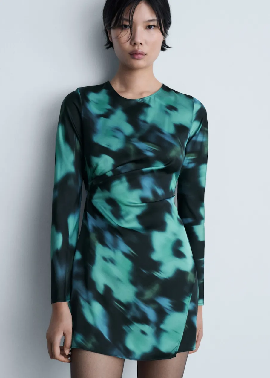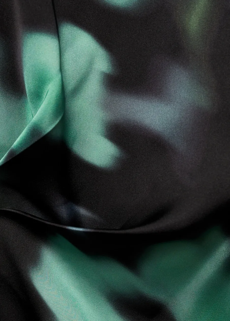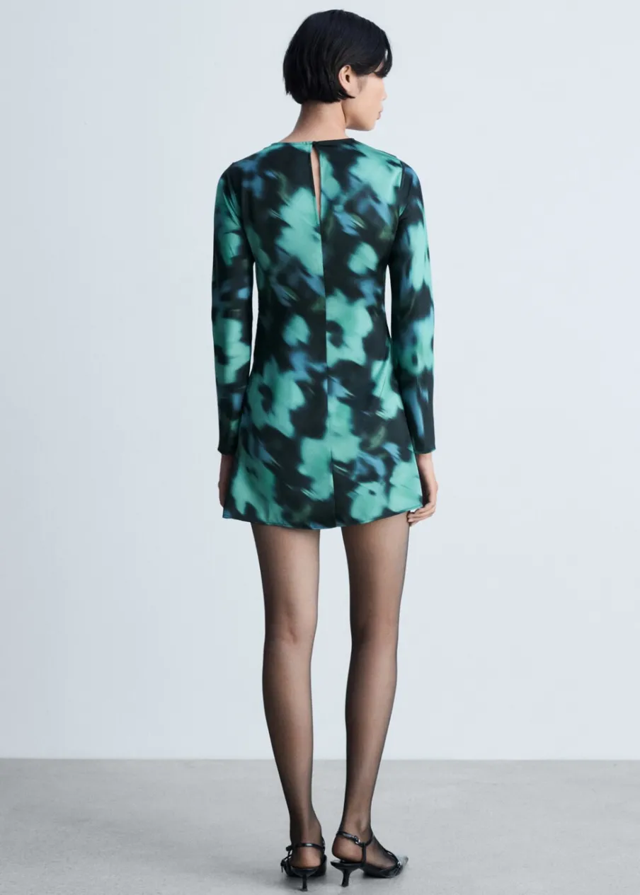 Długi rękaw. Lejąca tkanina. Krótki krój. Model wcięty. Nadruk. Prosty dekolt. Zapięcie na guzik z tyłu.
