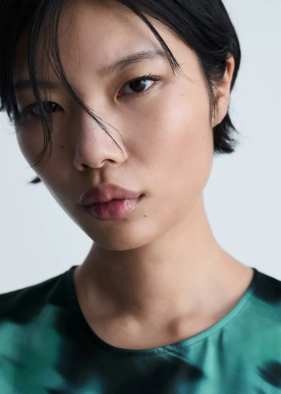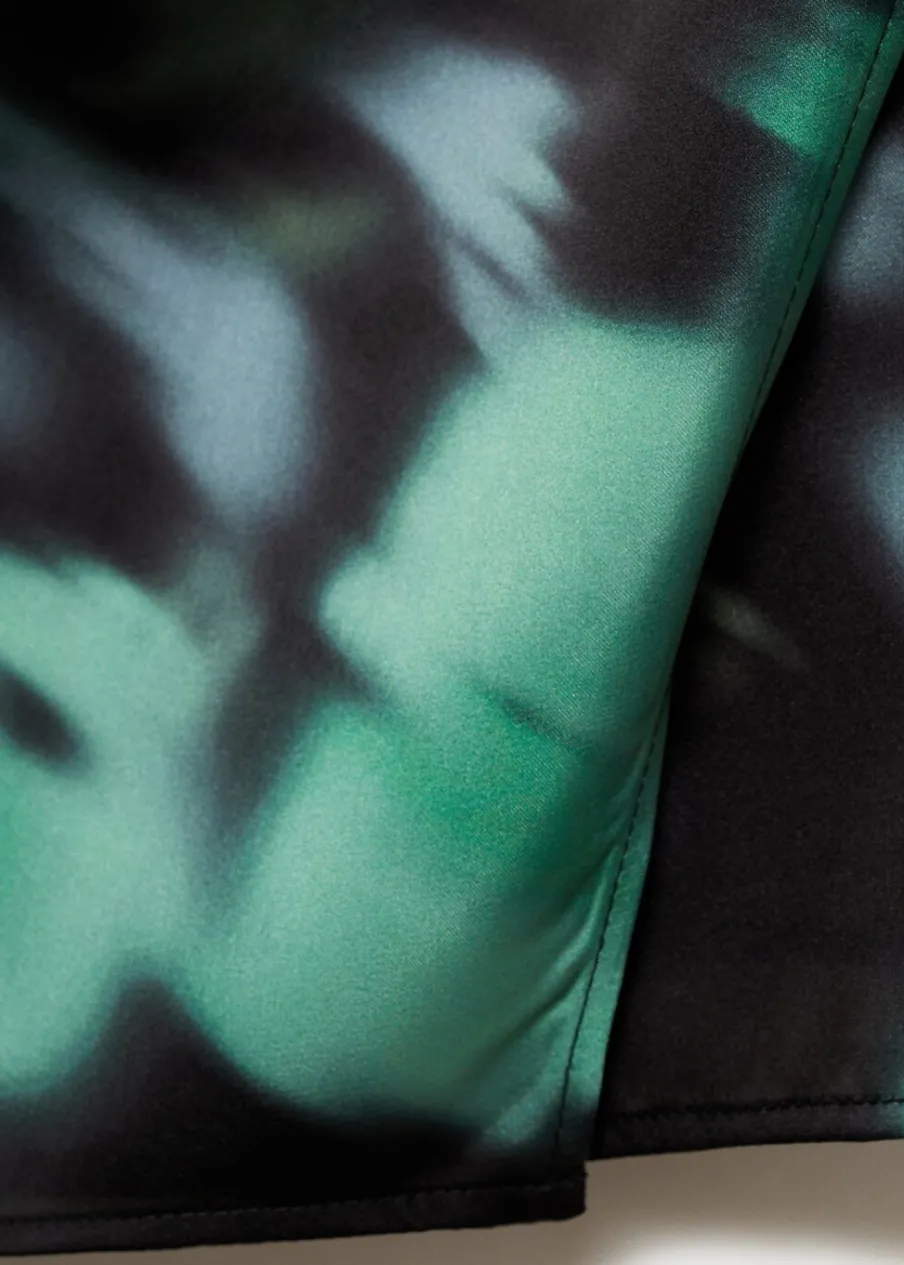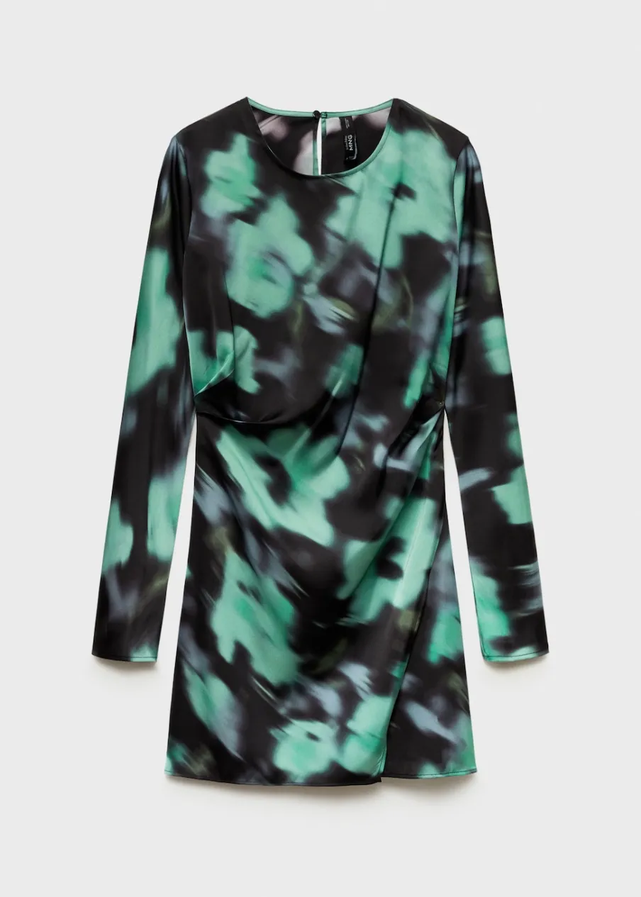 Długi rękaw. Lejąca tkanina. Krótki krój. Model wcięty. Nadruk. Prosty dekolt. Zapięcie na guzik z tyłu.