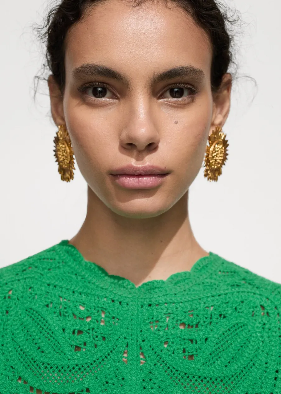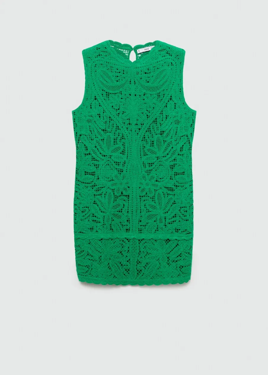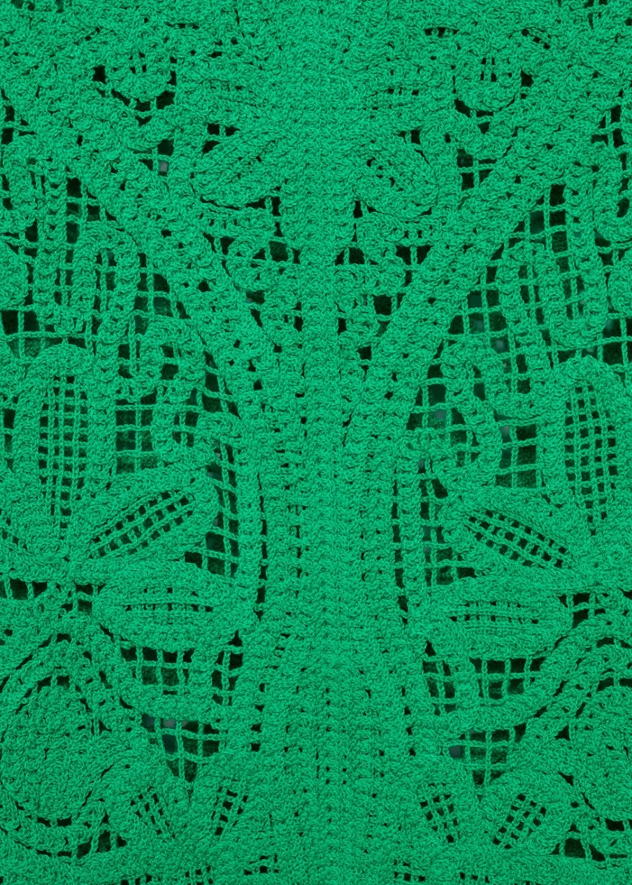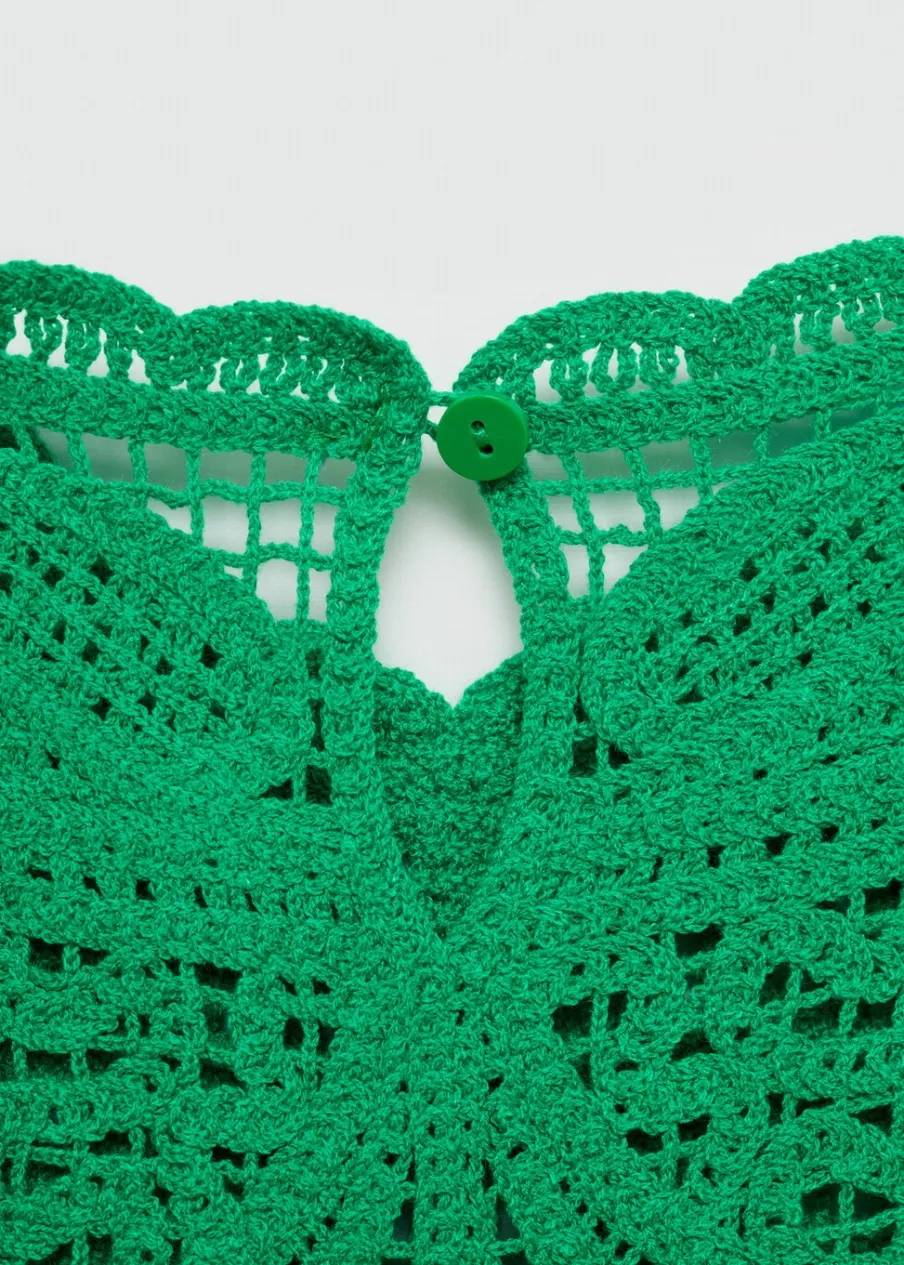 Tkanina z grubej dzianiny. Model prosty. Krótki krój. Okrągły dekolt. Bez rękawów. Zapięcie na guzik pod szyją. Sezon festiwalowy. Szydełkowa tkanina.