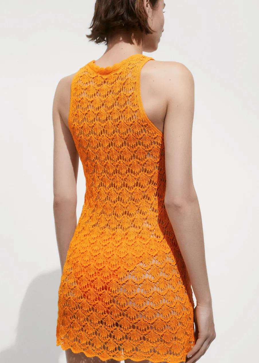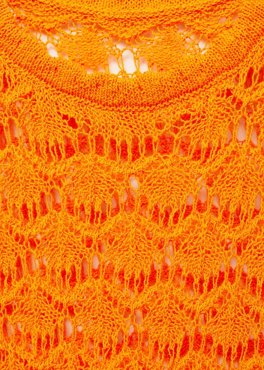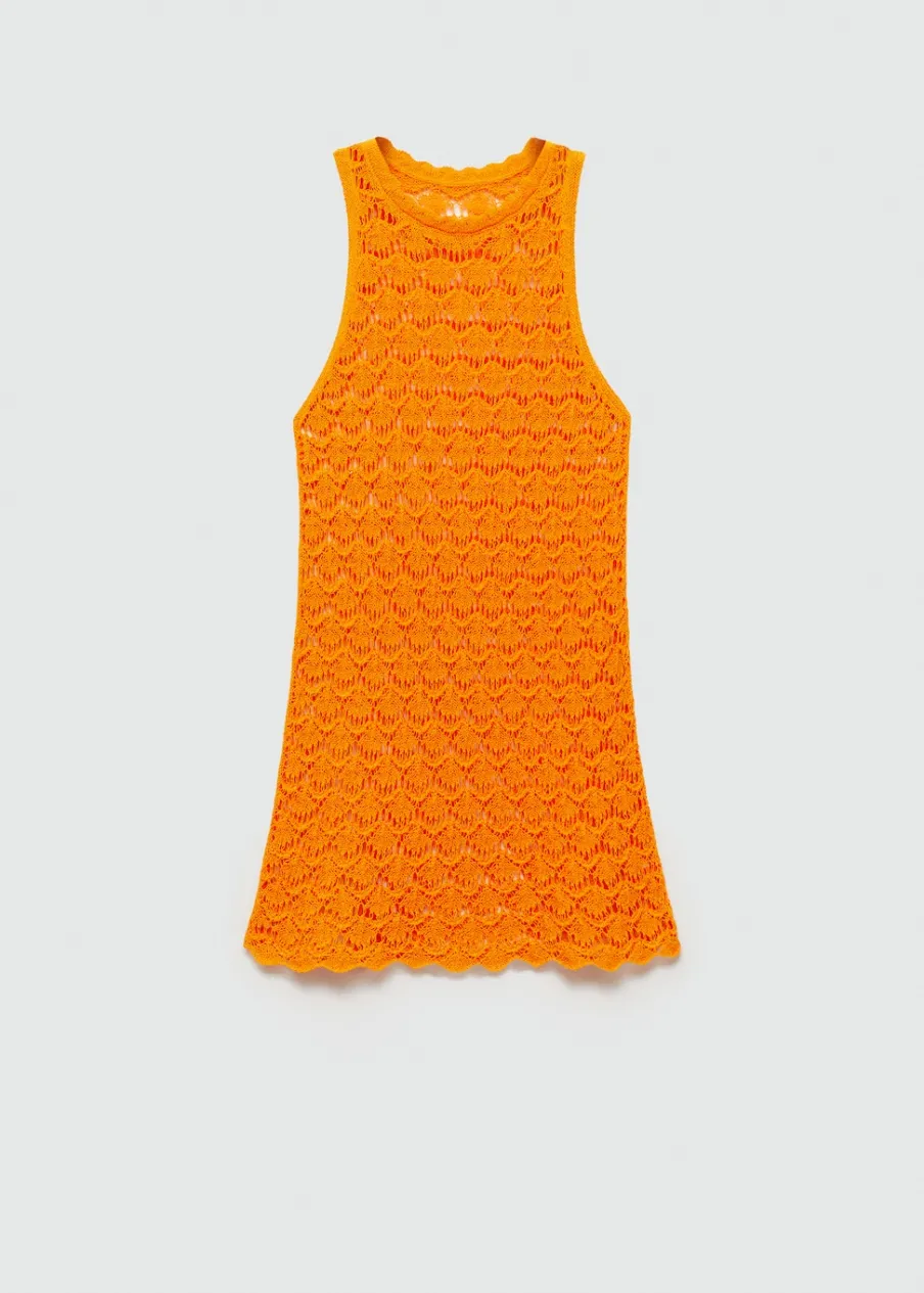 Tkanina mieszanka bawełny. Dzianina średniej grubości. Model prosty. Krótki krój. Okrągły dekolt. Bez rękawów. Szerokie ramiączka. Bez zapięcia. Szydełkowa tkanina.