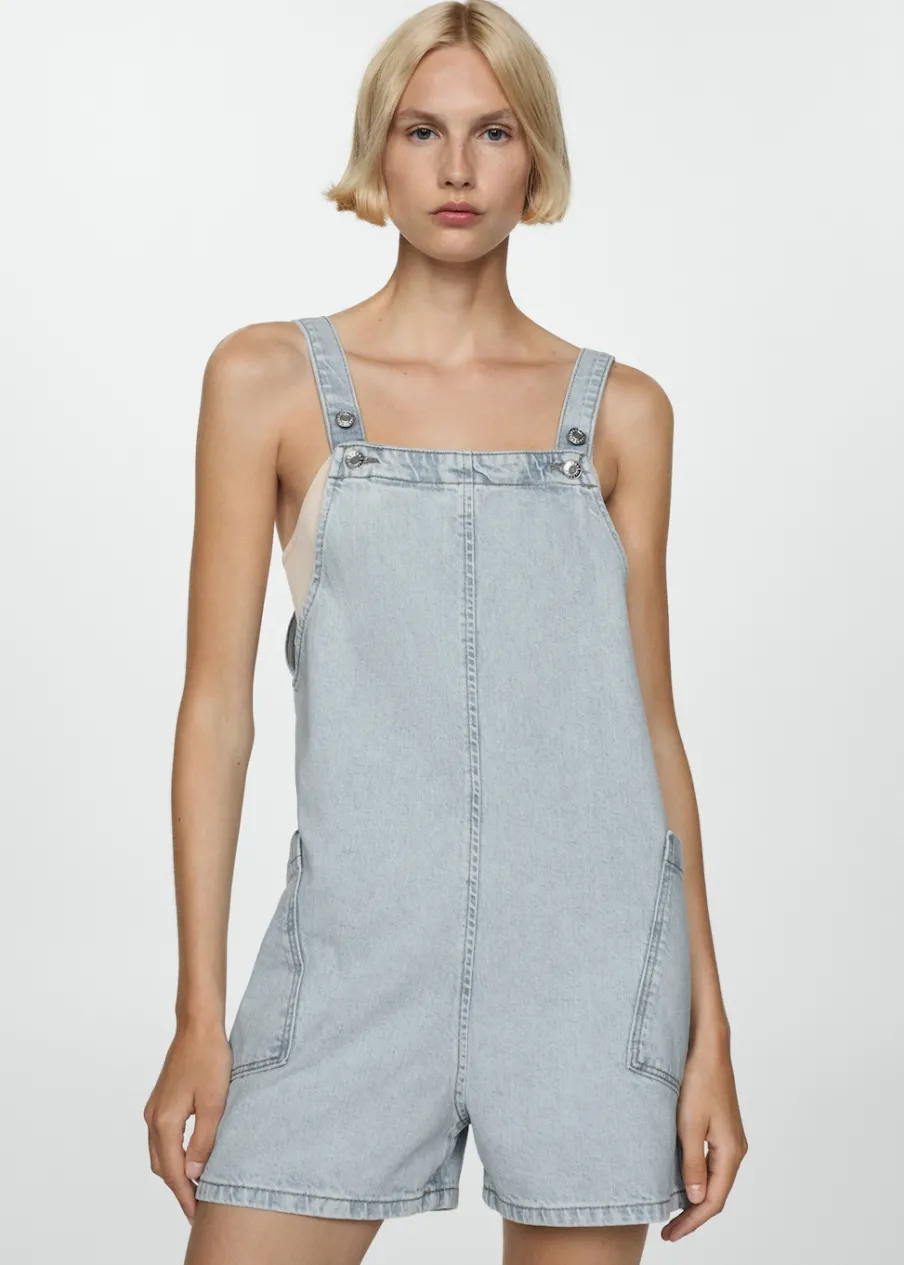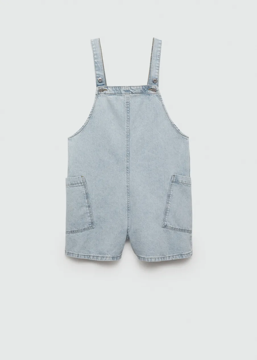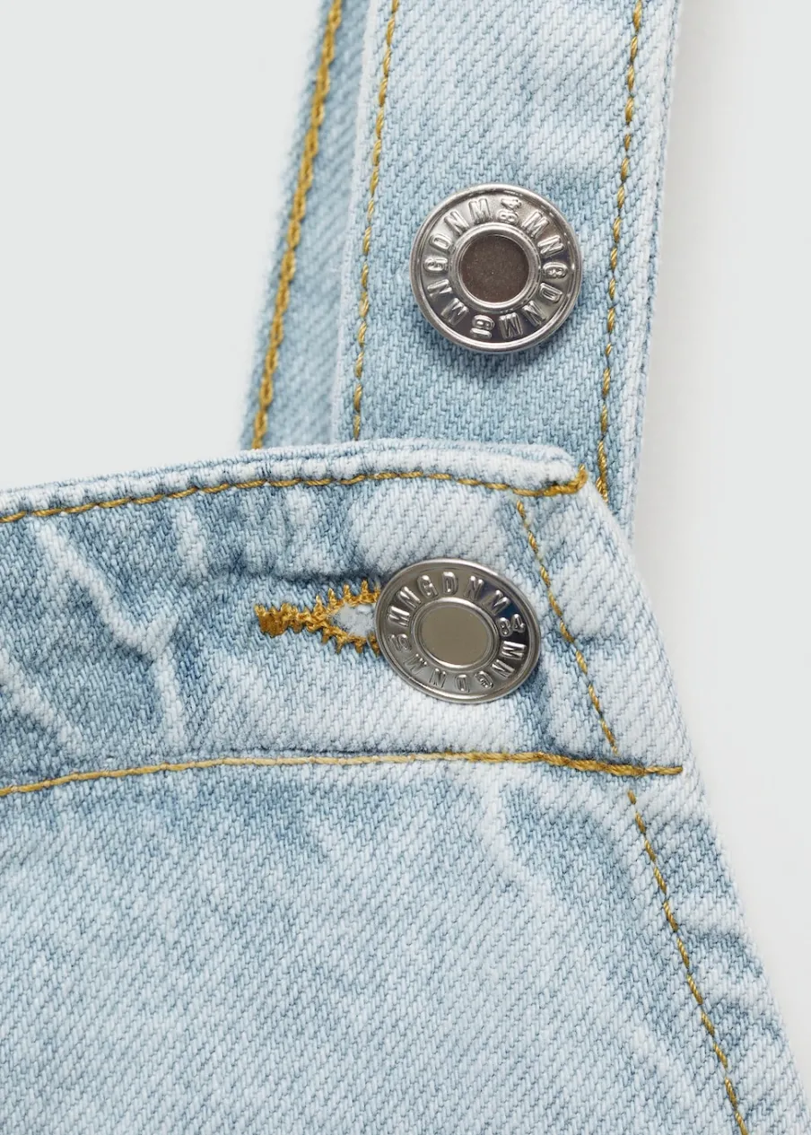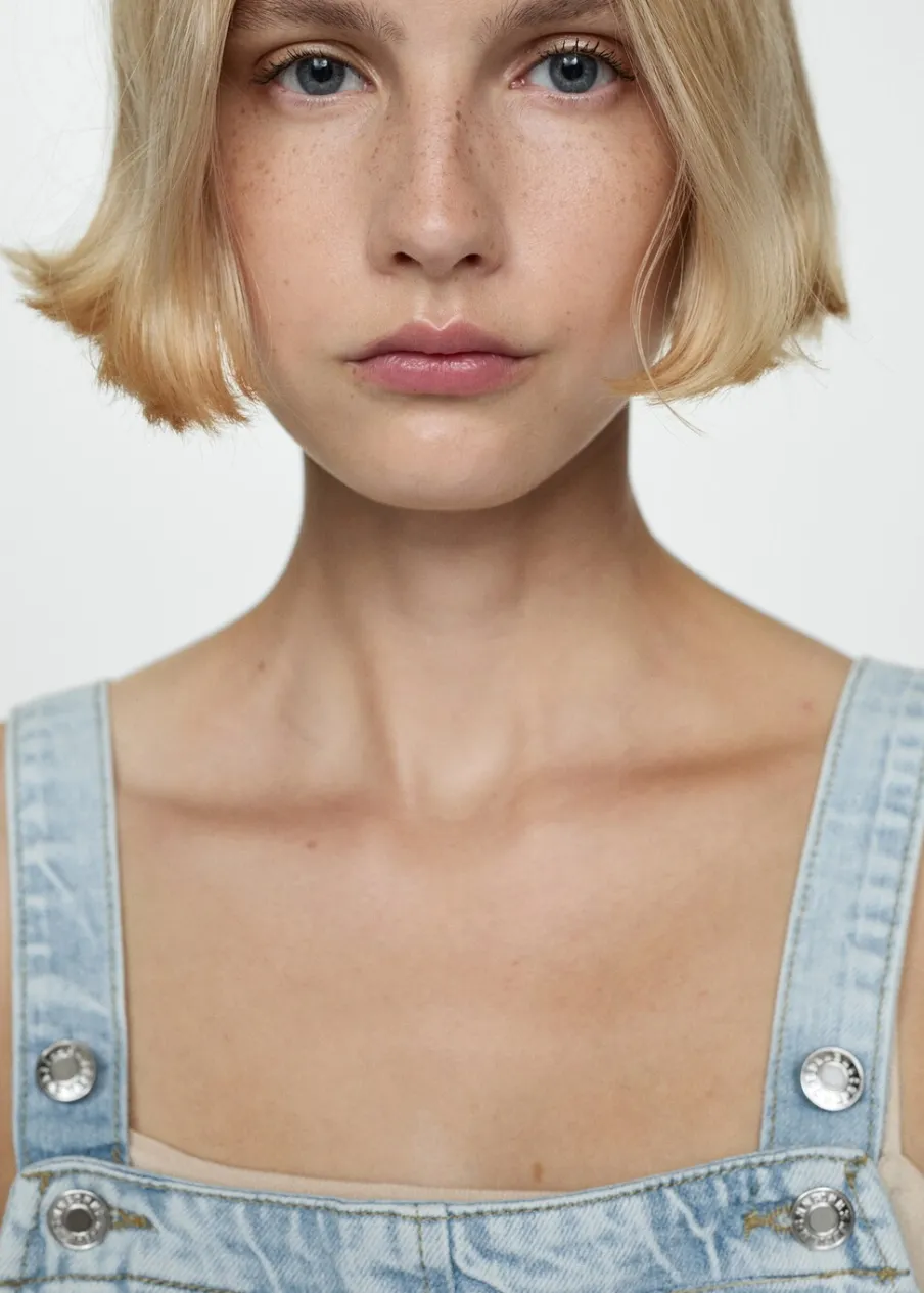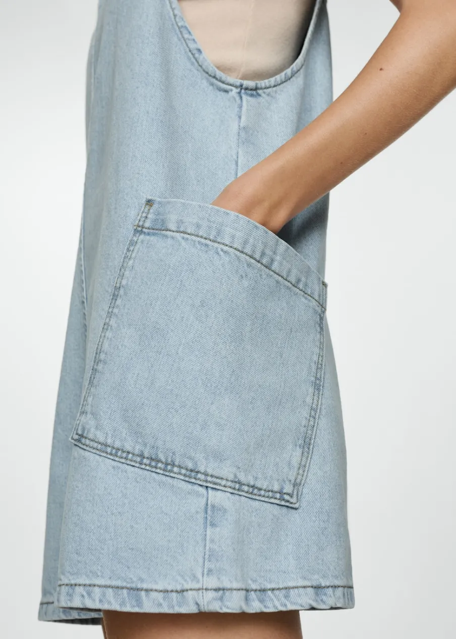 Tkanina bawełniana w dżinsowym stylu. Krótki krój. Model prosty. Kwadratowy dekolt. Bez rękawów. Regulowane ramiączka. Dwie kieszenie nakładane z przodu. Ozdobne szwy. Tkanina z 100% bawełny.