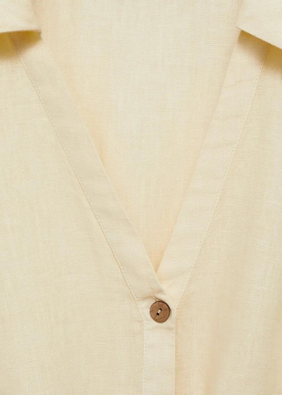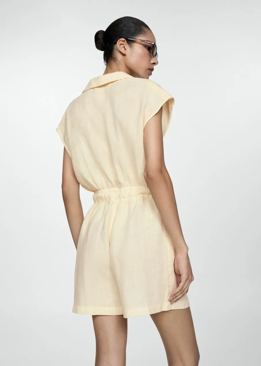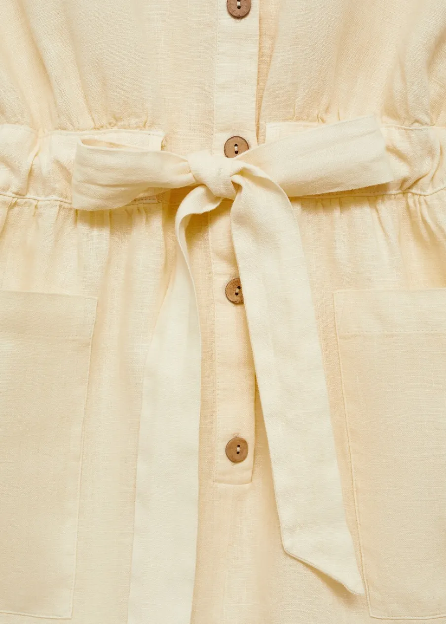 Tkanina z 100% lnu. Krótki krój. Model prosty. Koszulowy kołnierz. Krótki rękaw. Dwie kieszenie nakładane z przodu. Elastyczny pas z wiązanym zapięciem. Zapięcie na guziki z przodu.