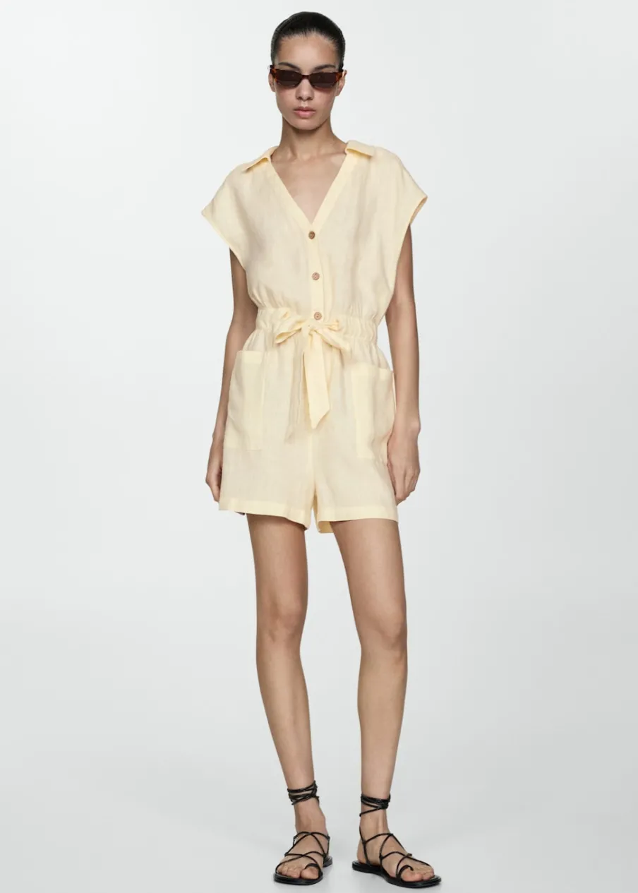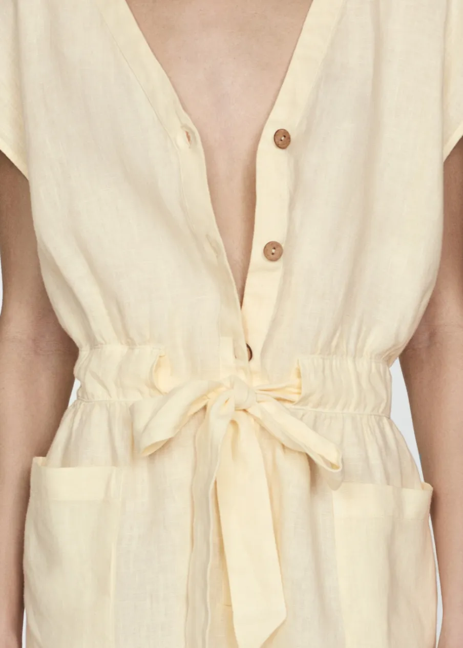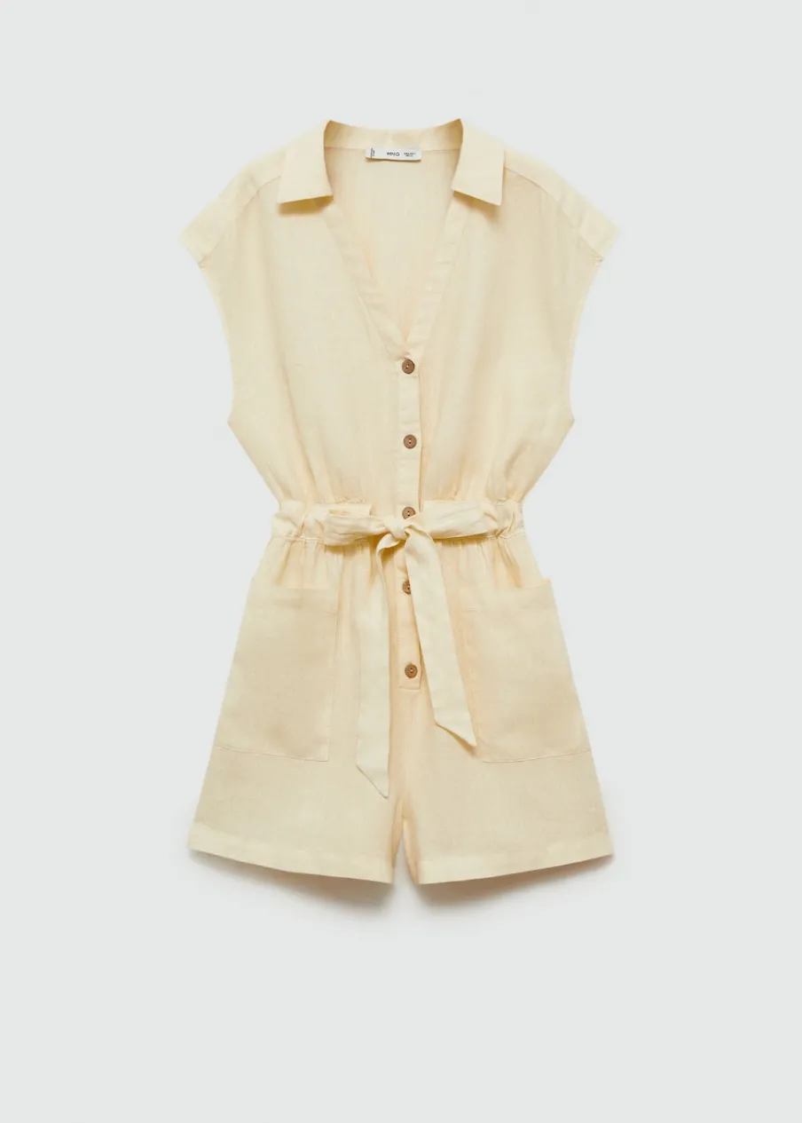 Tkanina z 100% lnu. Krótki krój. Model prosty. Koszulowy kołnierz. Krótki rękaw. Dwie kieszenie nakładane z przodu. Elastyczny pas z wiązanym zapięciem. Zapięcie na guziki z przodu.