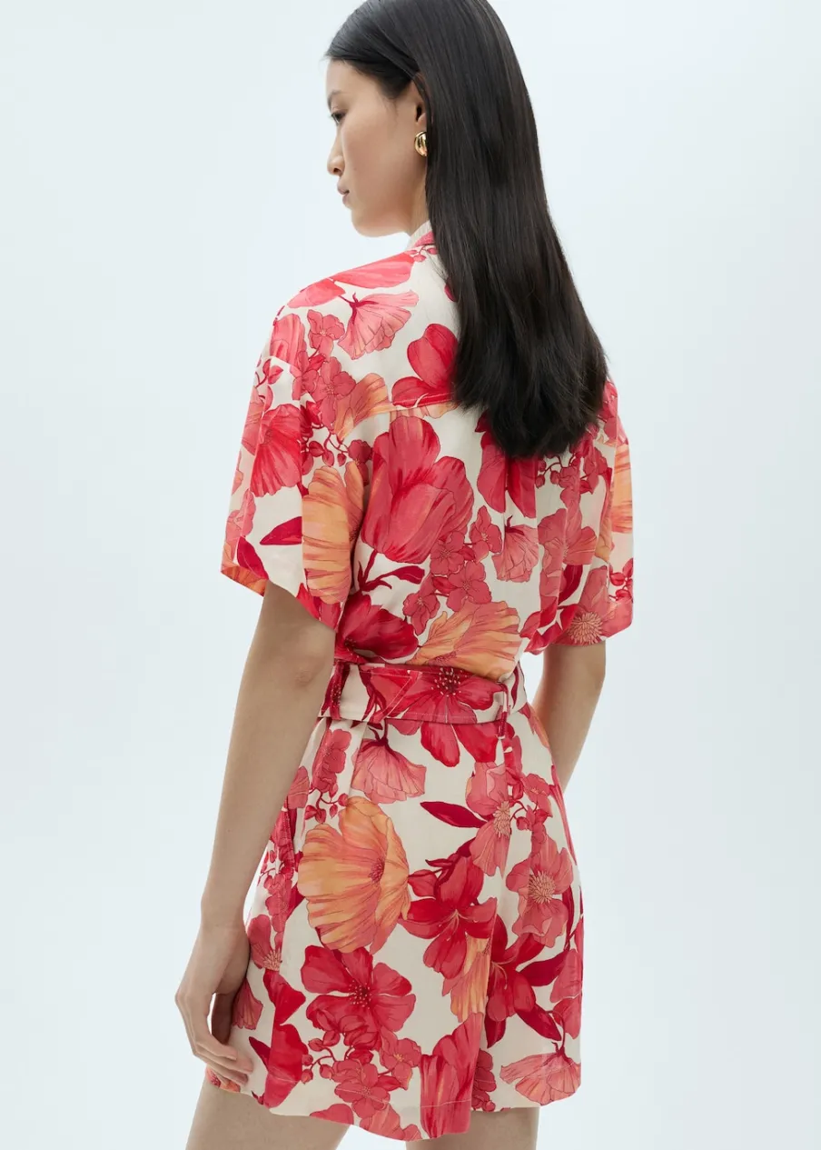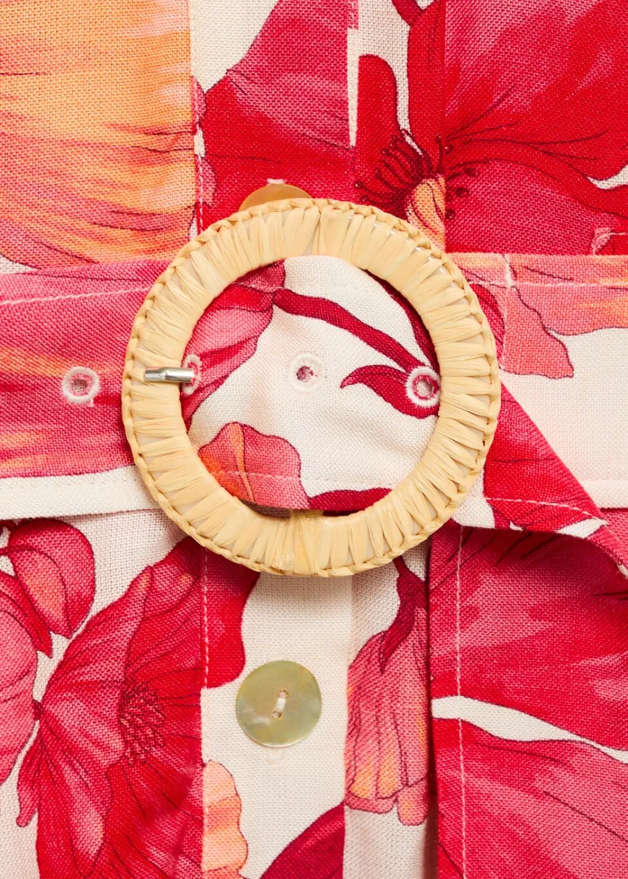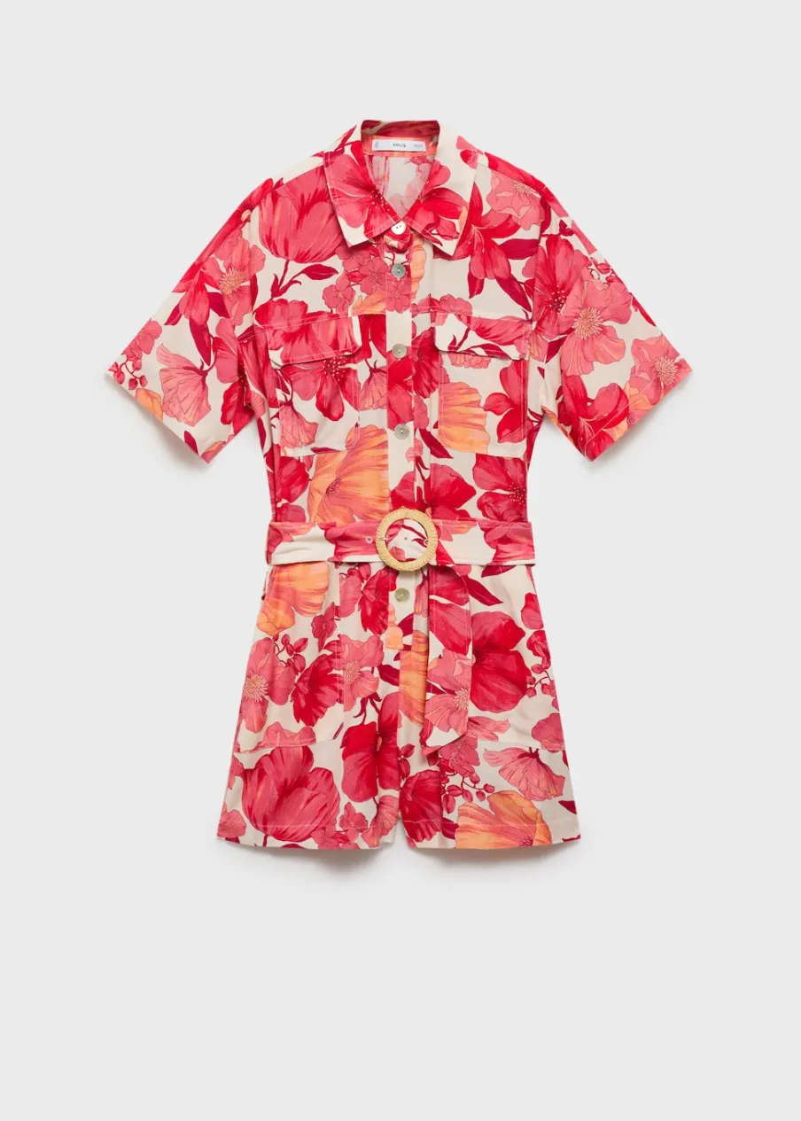 Model prosty. Cienka tkanina. Krótki krój. Koszulowy kołnierz. Krótki rękaw. Dwie kieszenie boczne. Dwie kieszenie naszyte na piersi. Zapięcie z przodu na guziki. Pasek zapinany na klamrę. Szlufki.