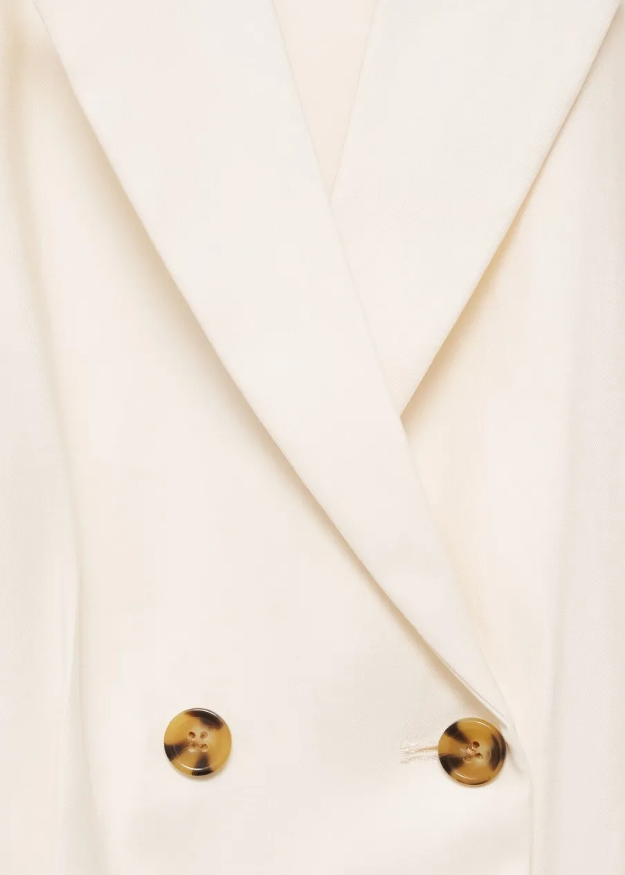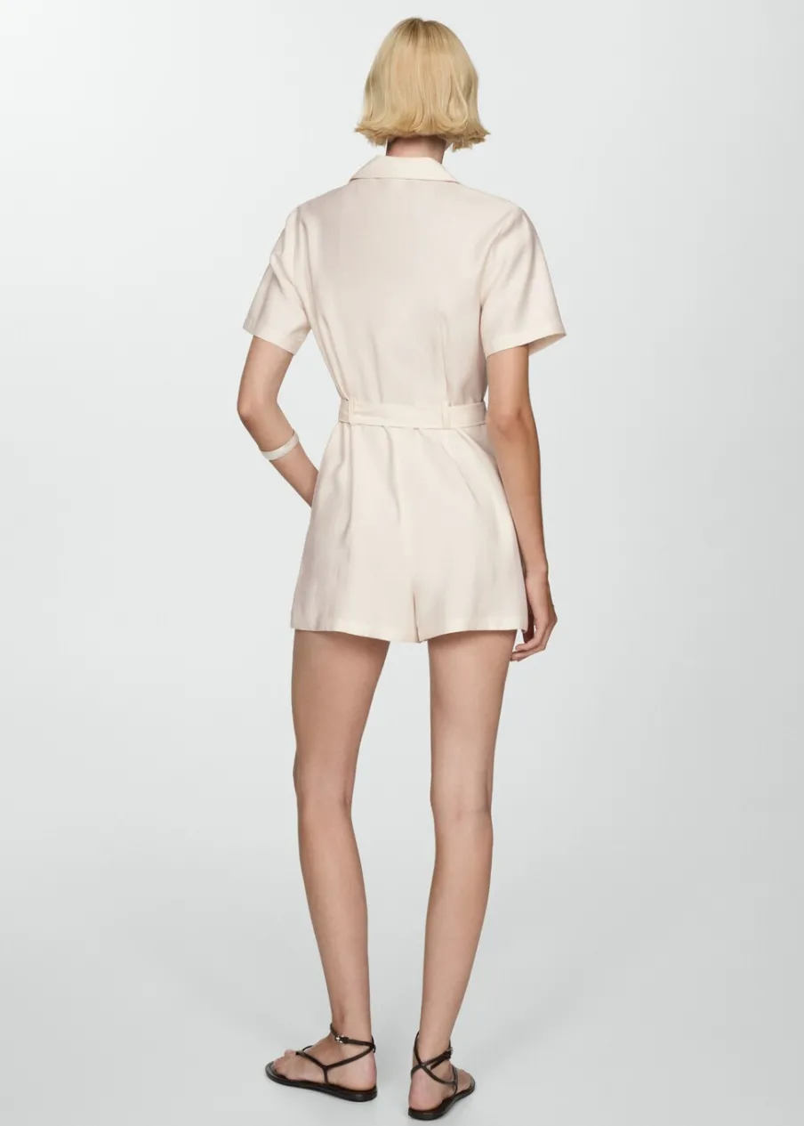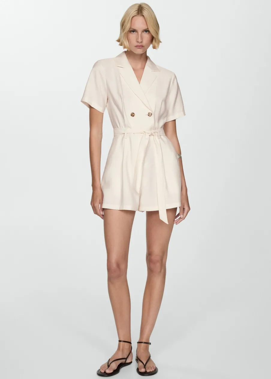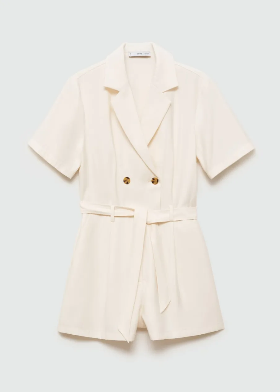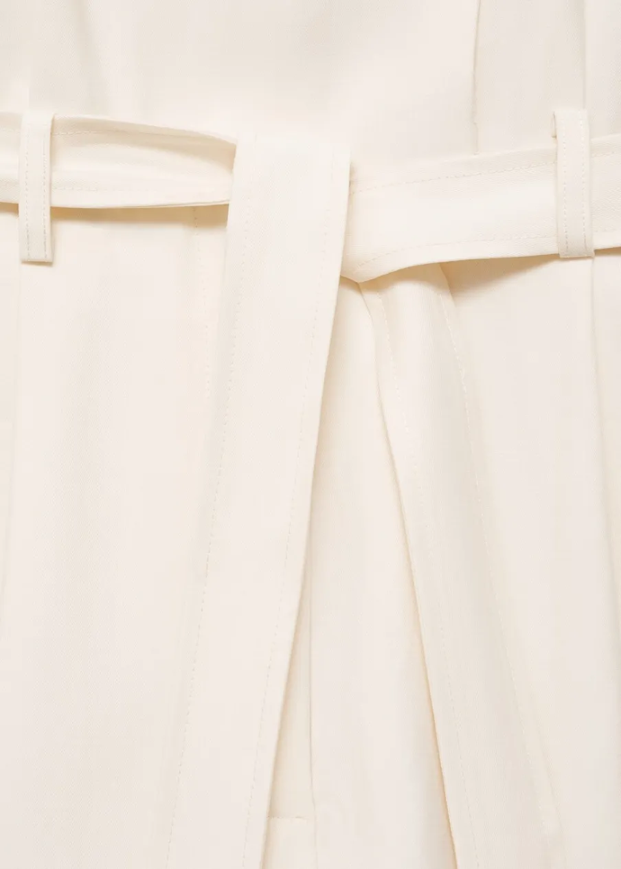 Lejąca tkanina. Krótki krój. Model prosty. Kołnierz z klapami. Klapy z nacięciem. Krótki rękaw. Dwie kieszenie boczne. Szlufki. Guziki z imitacji szylkretu. Regulowane wiązanie. Wewnętrzna podszewka. Zapięcie na guziki z przodu.