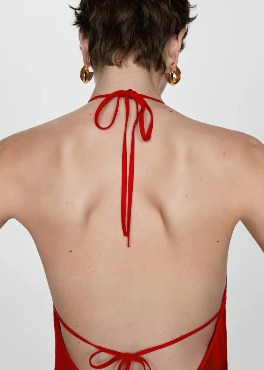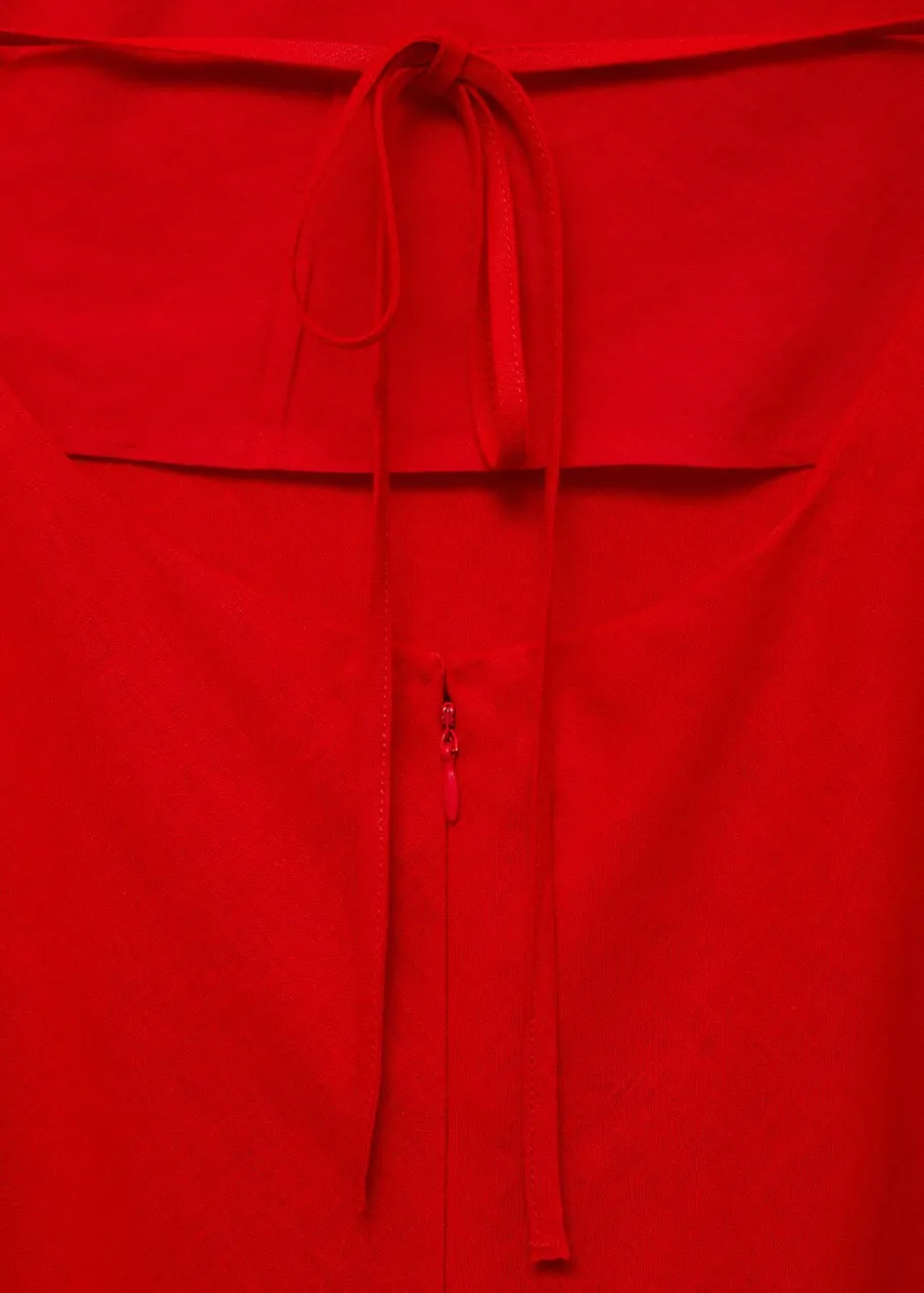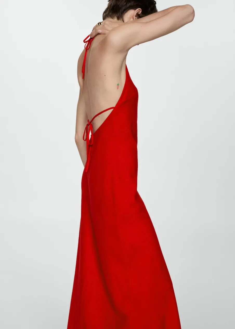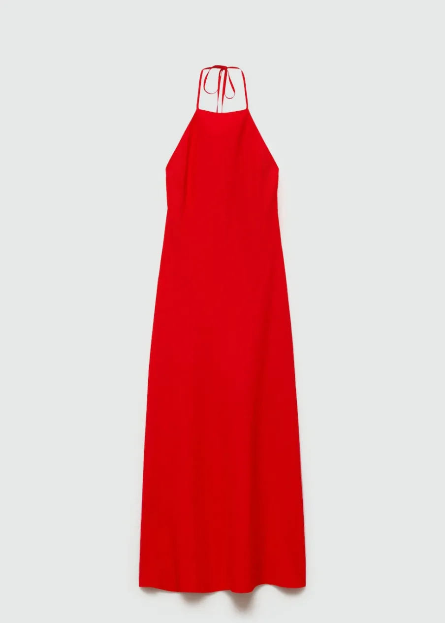 Tkanina z mieszanki lnu. Model prosty. Model długi. Dekolt w stylu halter. Plecy z wycięciem. Bez rękawów. Cienkie ramiączka. Wiązanie przy szyi i na plecach.