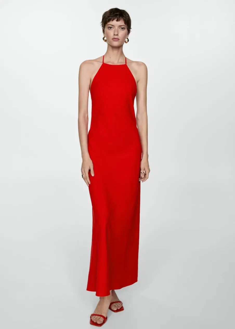OpisTkanina z mieszanki lnu. Model prosty. Model długi. Dekolt w stylu halter. Plecy z wycięciem. Bez rękawów. Cienk…