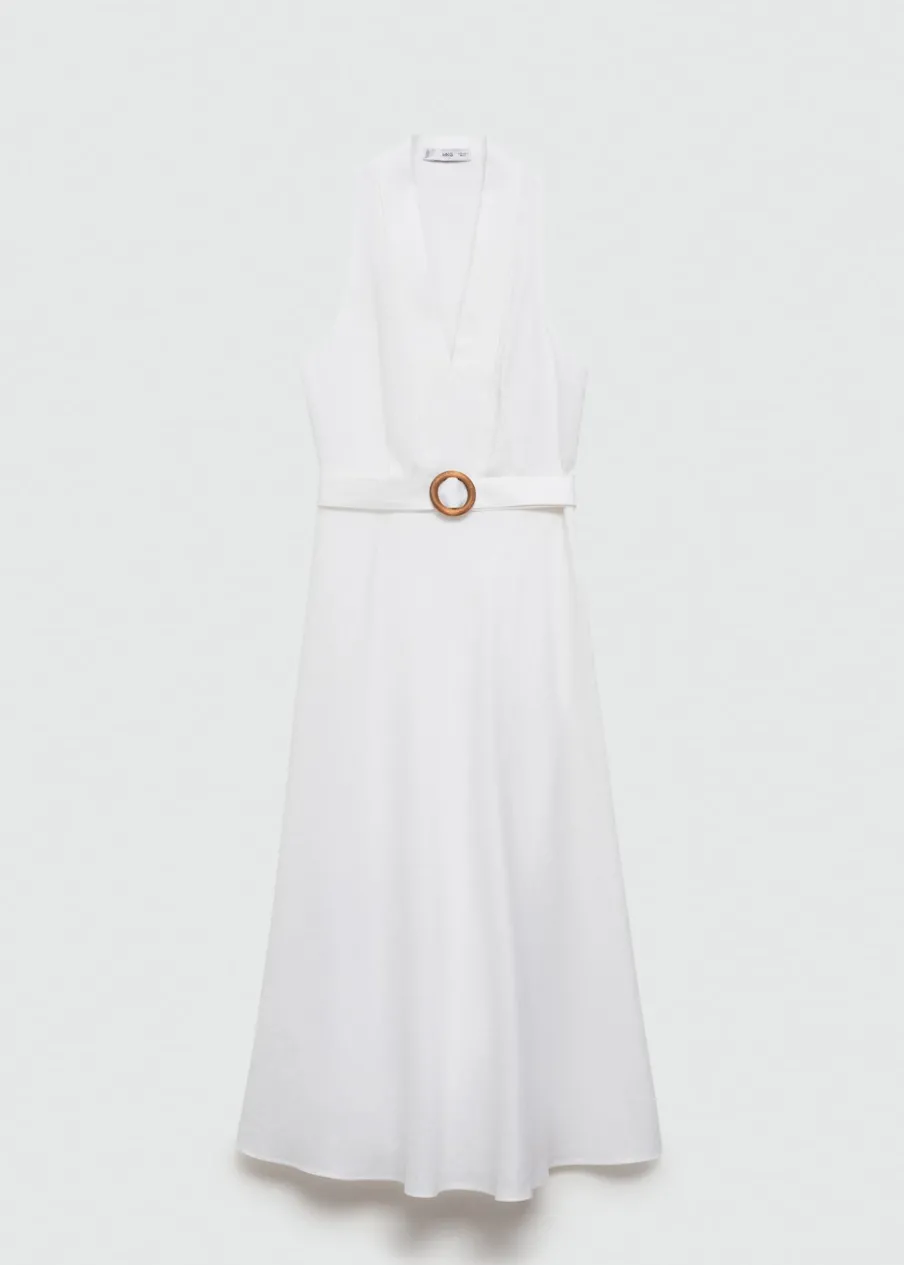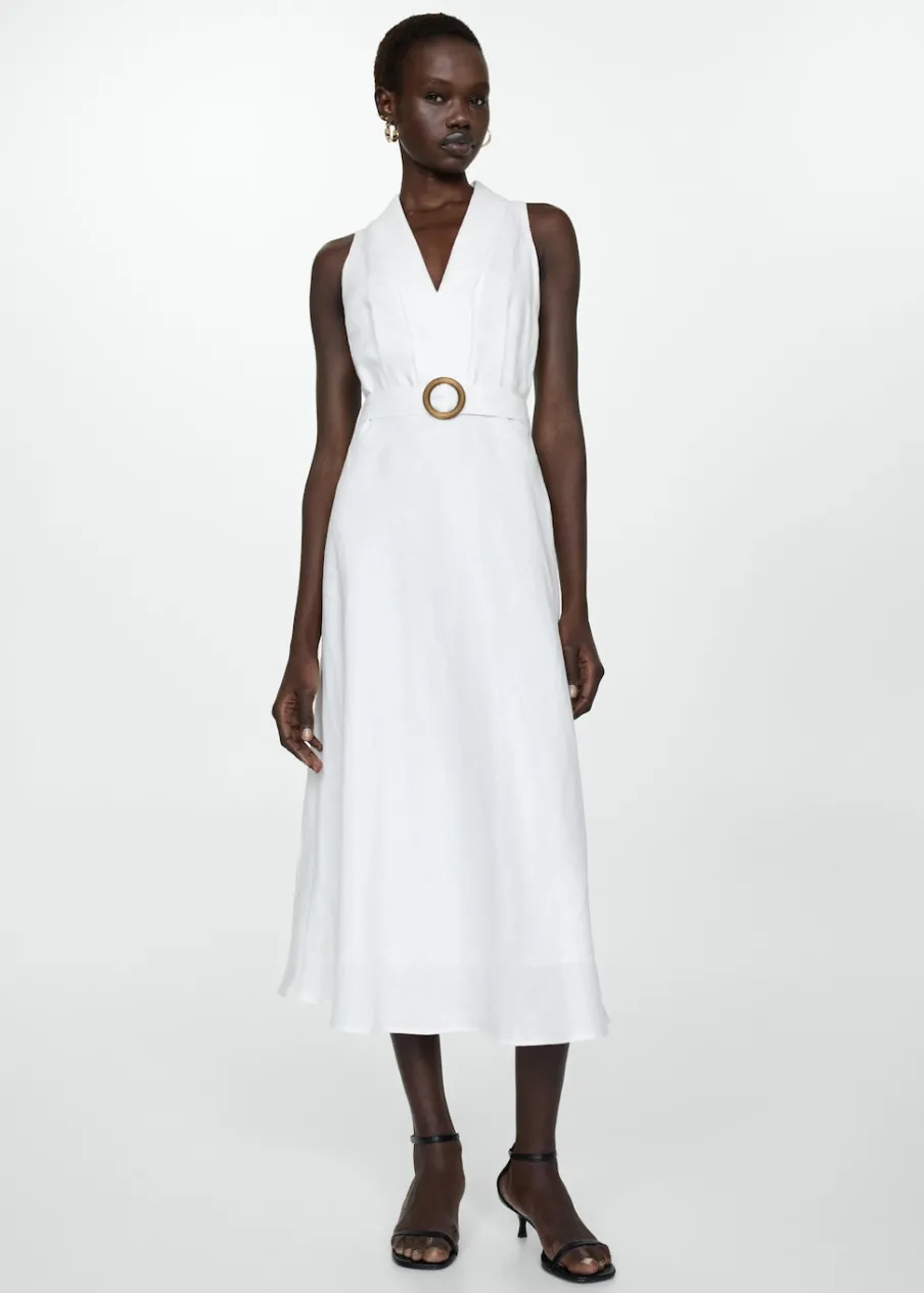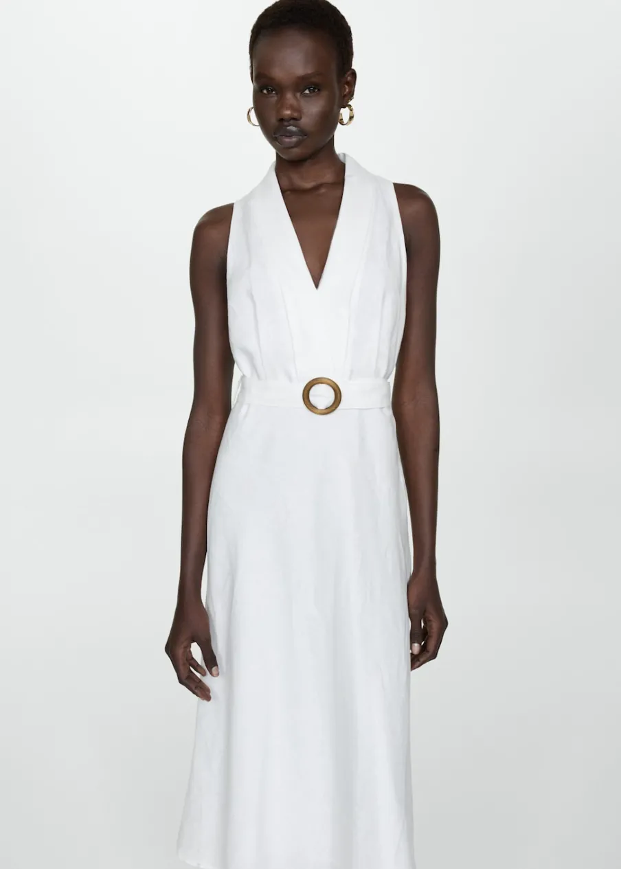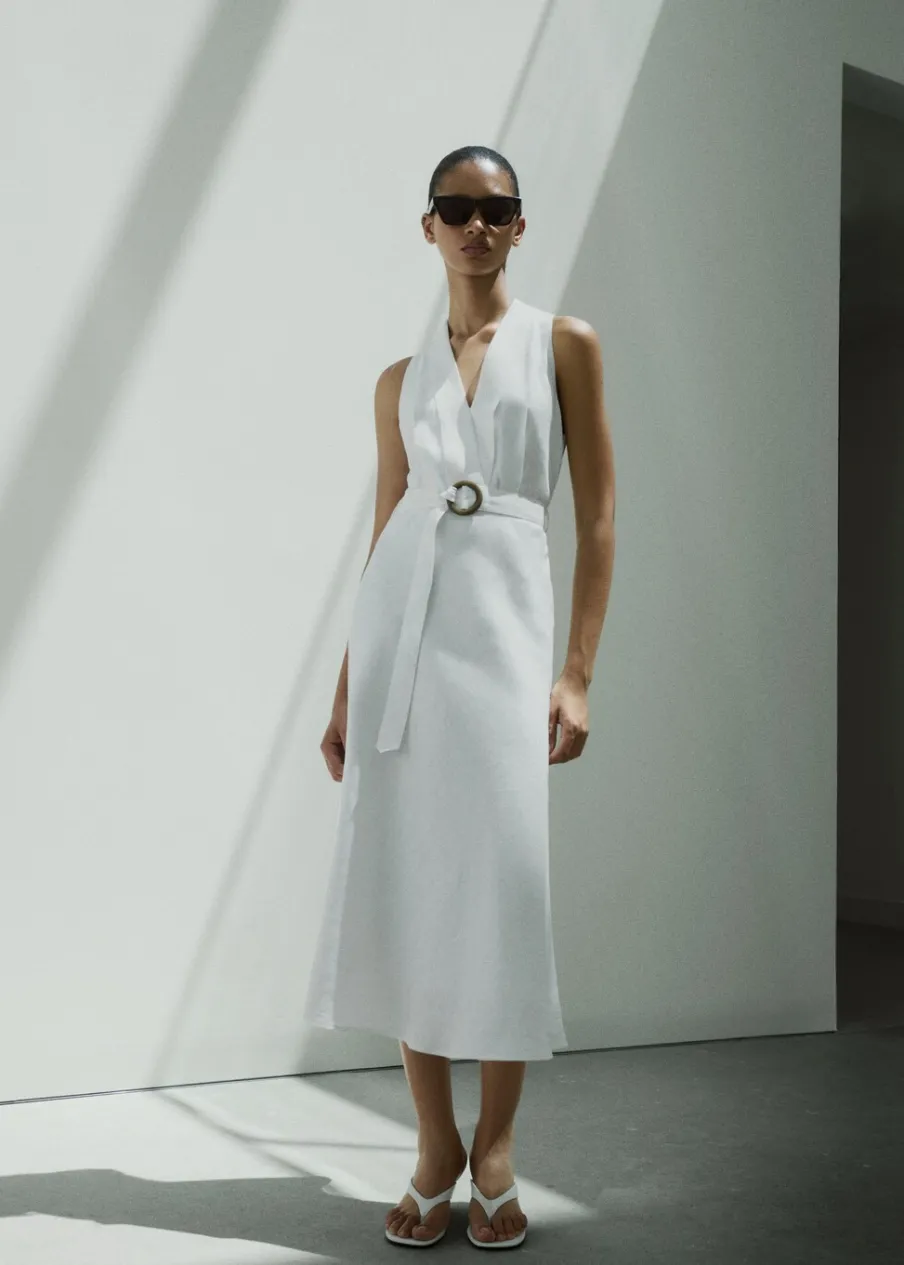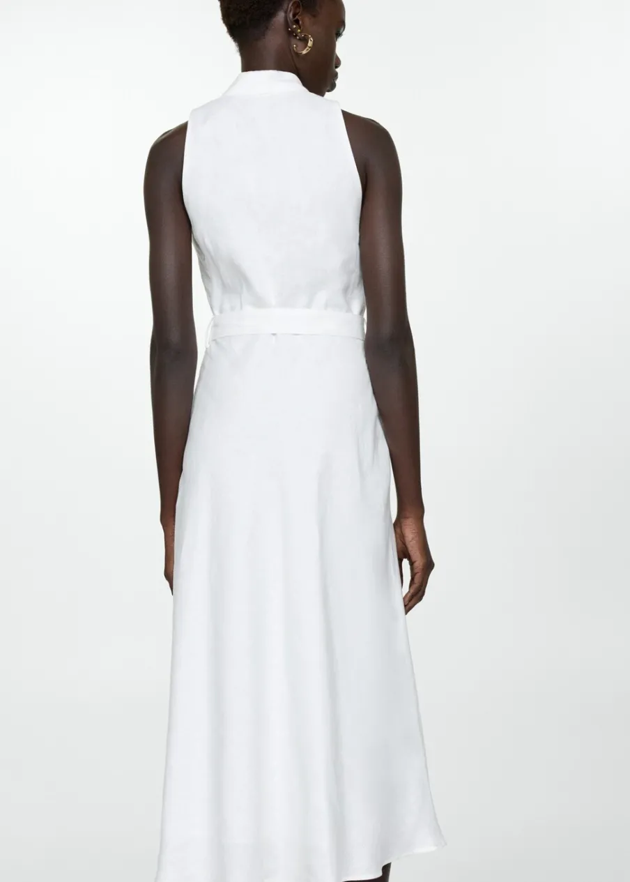 Tkanina z 100% lnu. Model evasé. Model długi. Zakładany dekolt. Bez rękawów. Szlufki. Zapięcie z boku. Kryte zapięcie na zamek z boku. Dekoracyjny pasek. Wewnętrzna podszewka.
