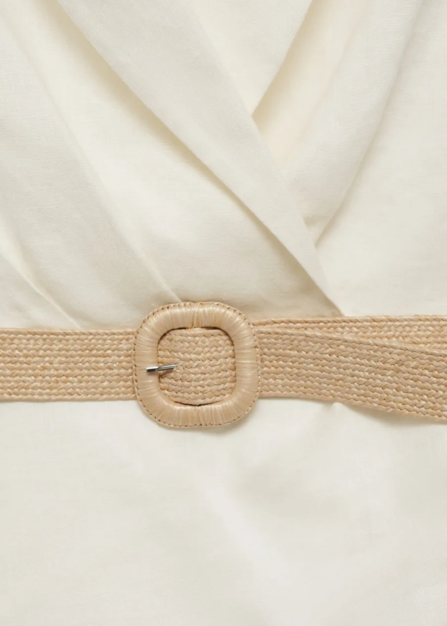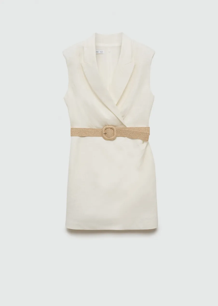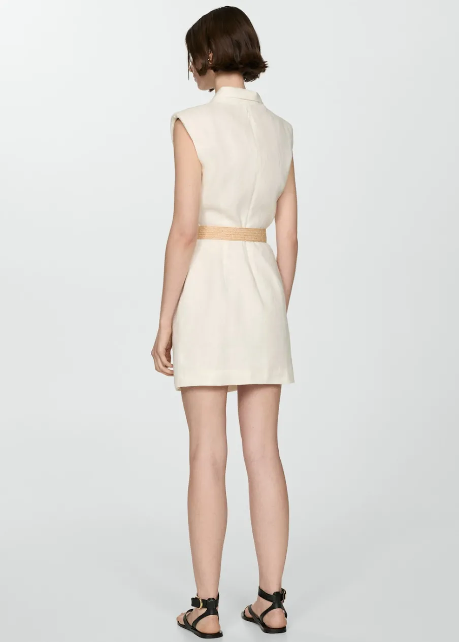 Tkanina z 100% lnu. Krótki krój. Model prosty. Dekolt w szpic z kołnierzykiem. Zakładany dekolt. Bez rękawów. Zapięcie z tyłu na suwak. Dekoracyjny pasek. Wewnętrzna podszewka.