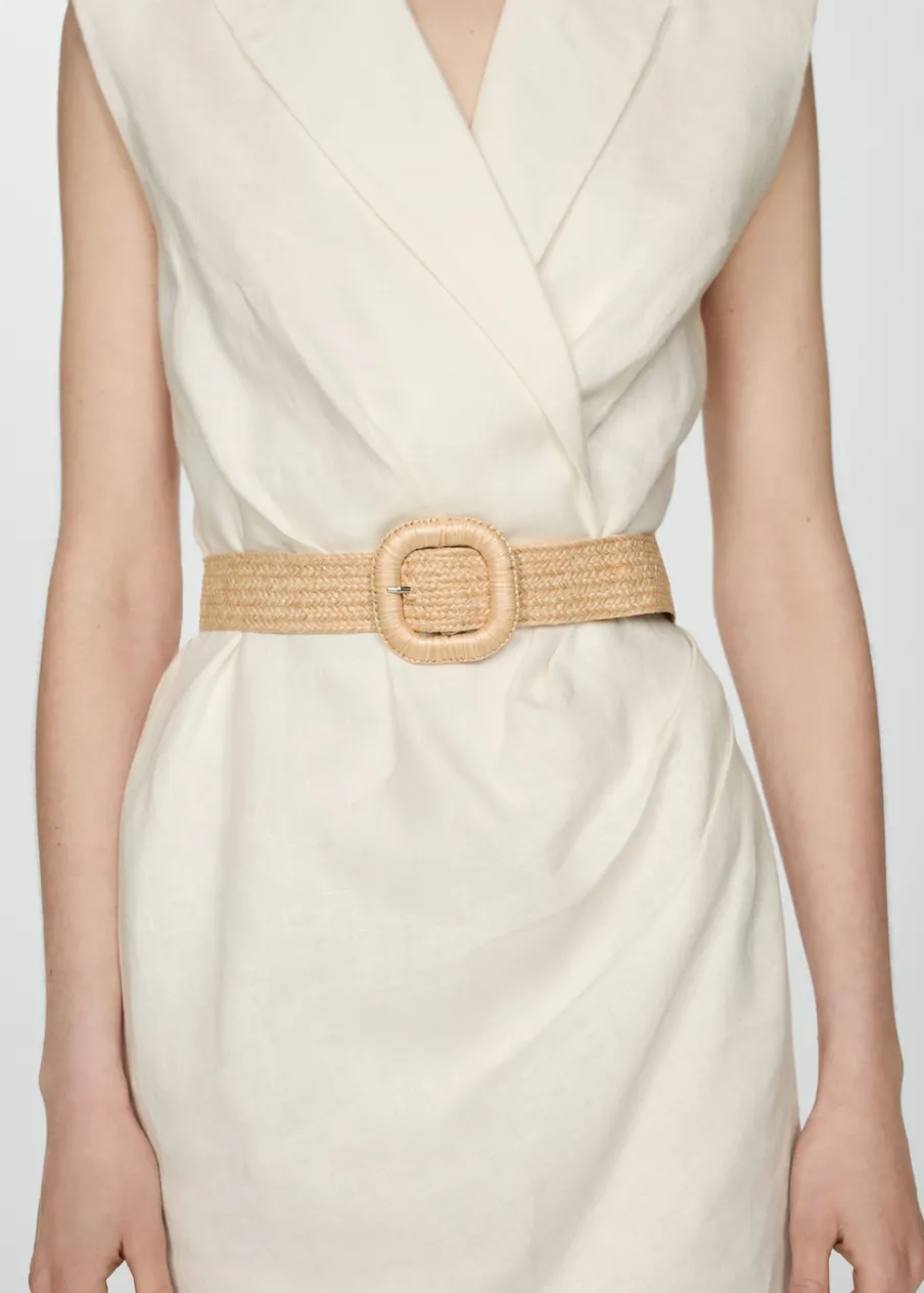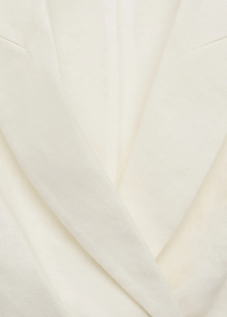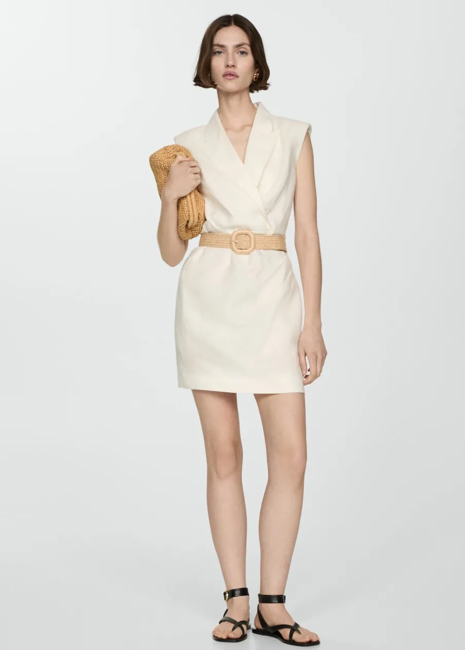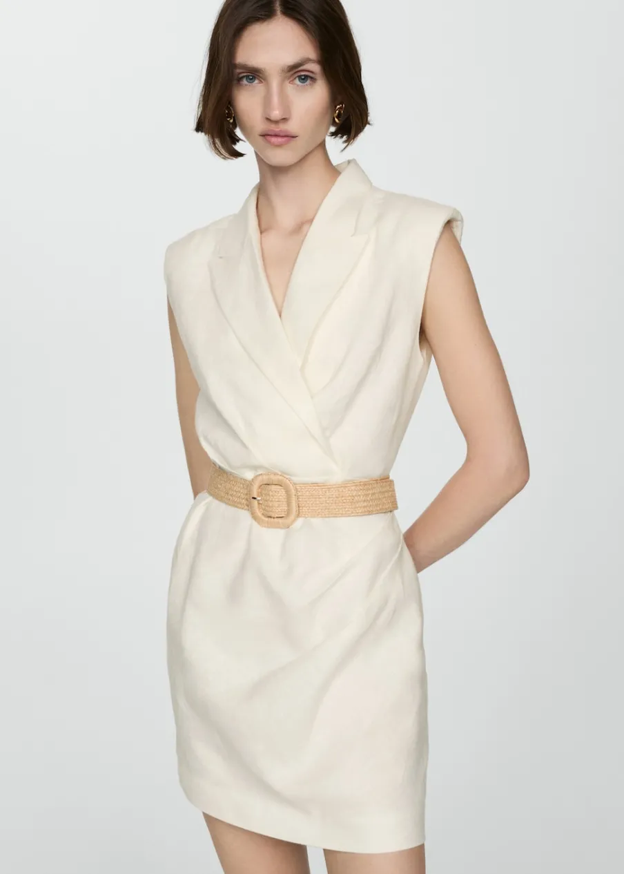 Tkanina z 100% lnu. Krótki krój. Model prosty. Dekolt w szpic z kołnierzykiem. Zakładany dekolt. Bez rękawów. Zapięcie z tyłu na suwak. Dekoracyjny pasek. Wewnętrzna podszewka.