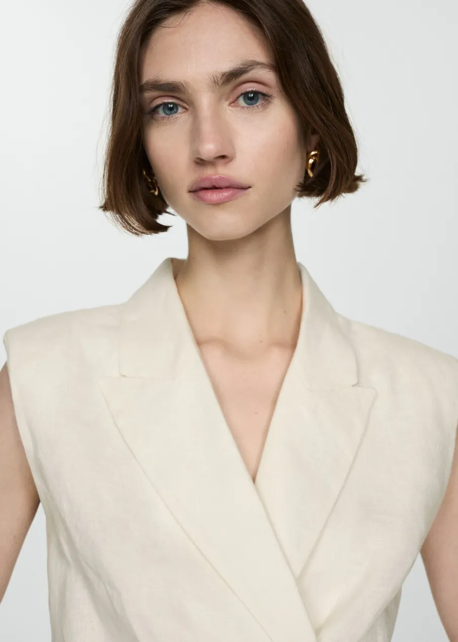 OpisTkanina z 100% lnu. Krótki krój. Model prosty. Dekolt w szpic z kołnierzykiem. Zakładany dekolt. Bez rękawów. …