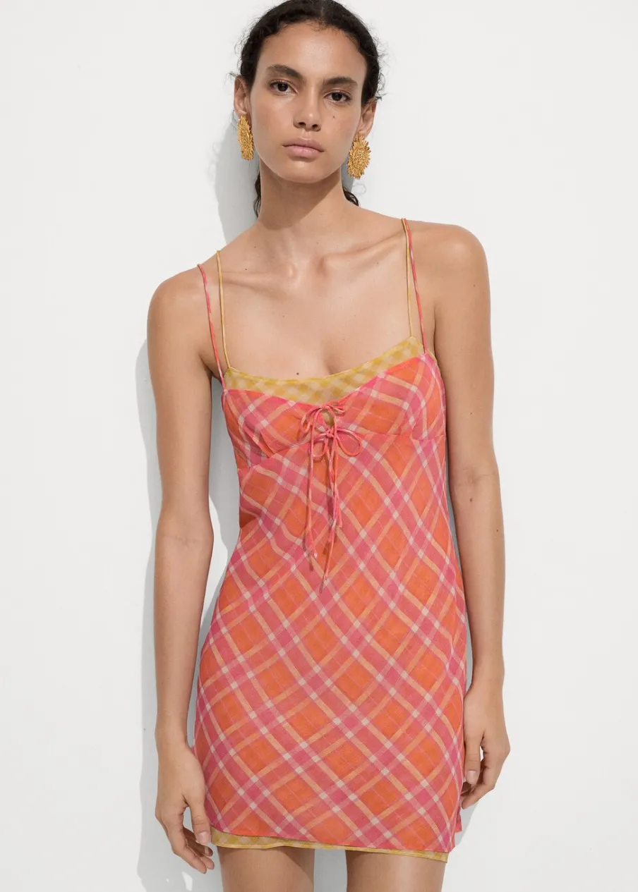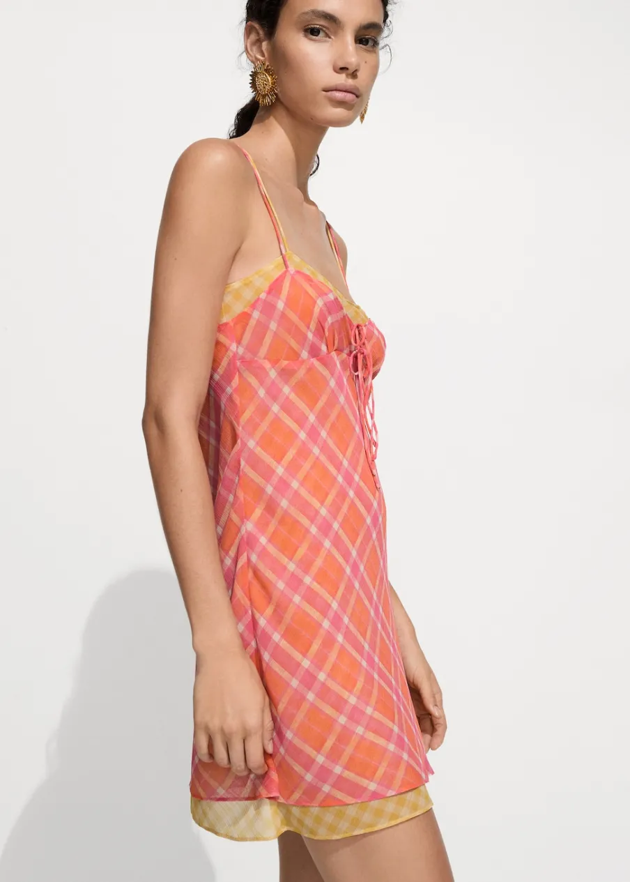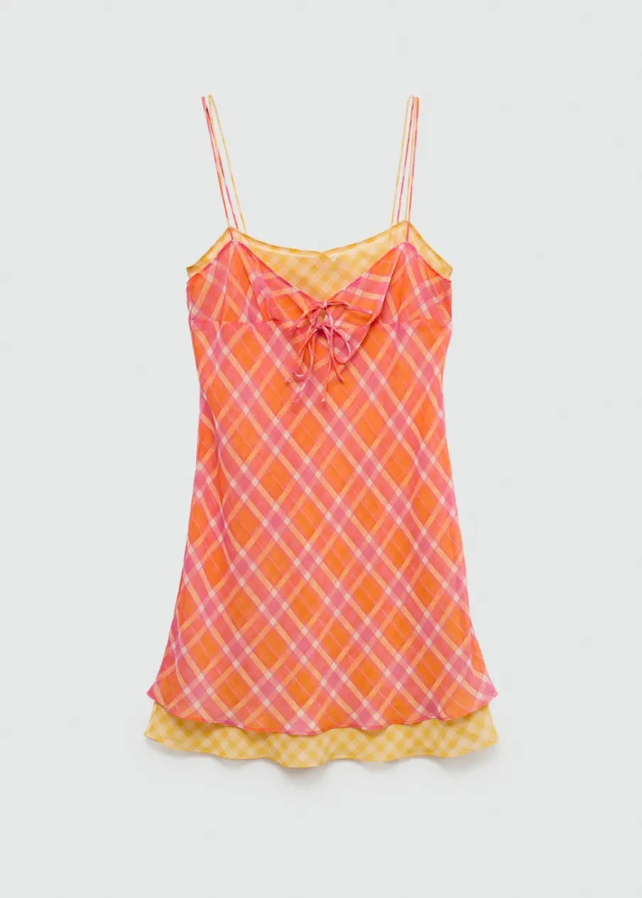 Lejąca tkanina. Krótki krój. Model prosty. Model łączony. Wzór w kratę. Dekolt V. Bez rękawów. Cienkie podwójne ramiączka. Bez zapięcia. Ozdobna kokardka.