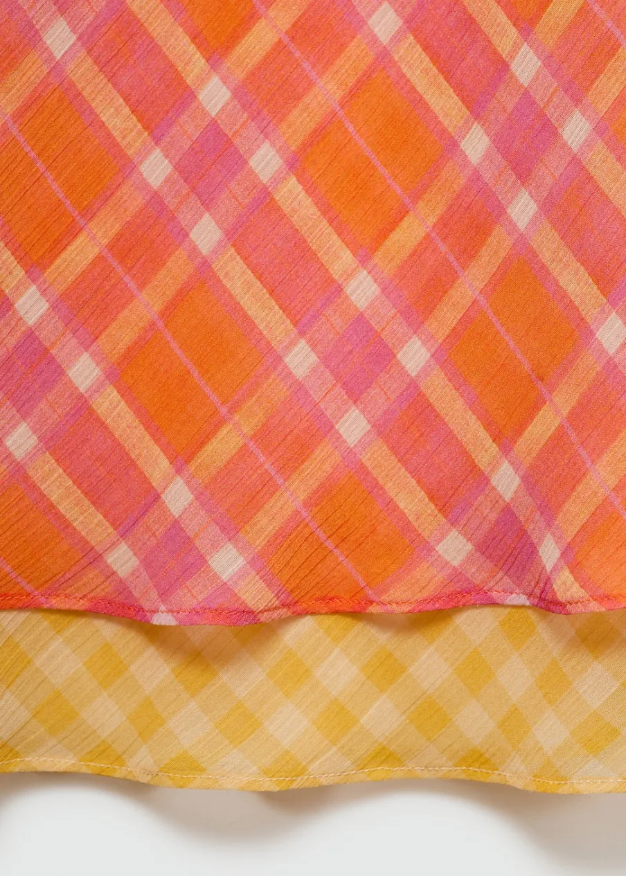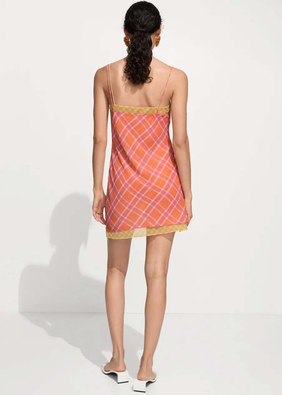 OpisLejąca tkanina. Krótki krój. Model prosty. Model łączony. Wzór w kratę. Dekolt V. Bez rękawów. Cienkie podw…