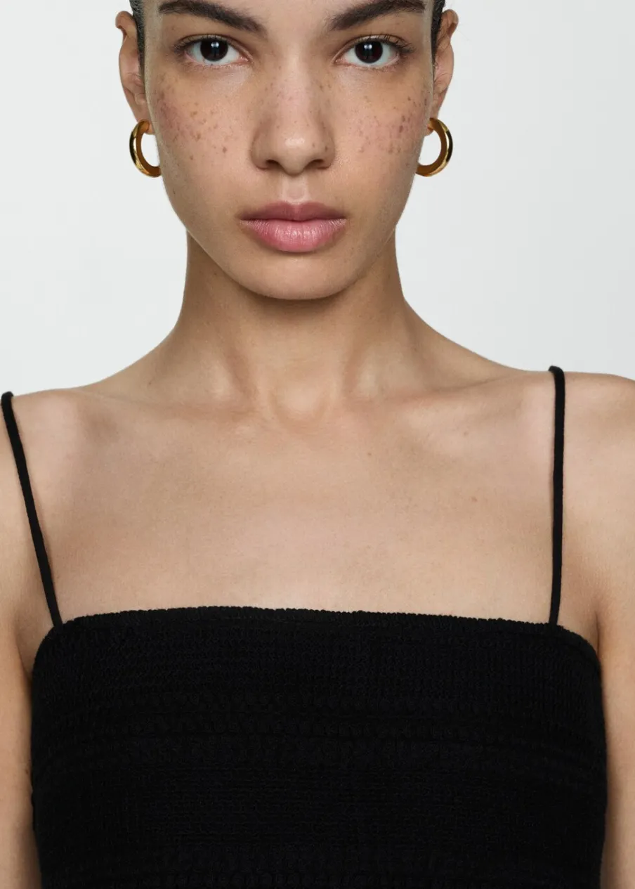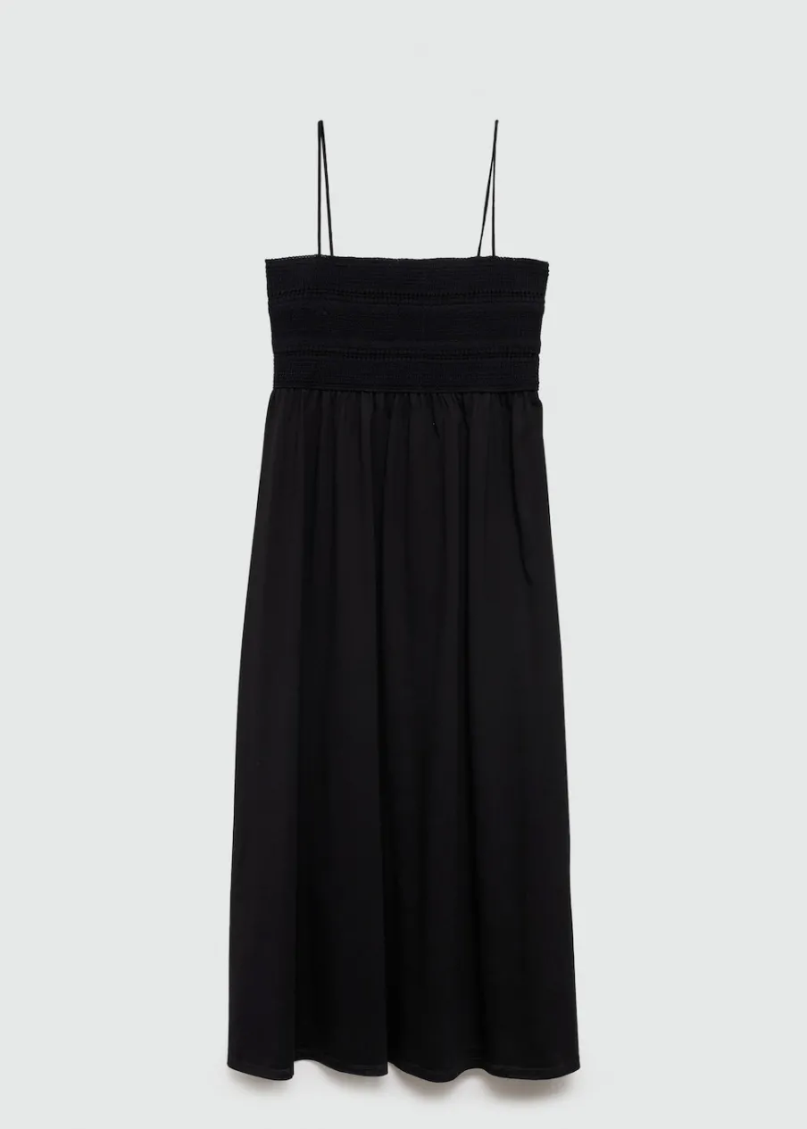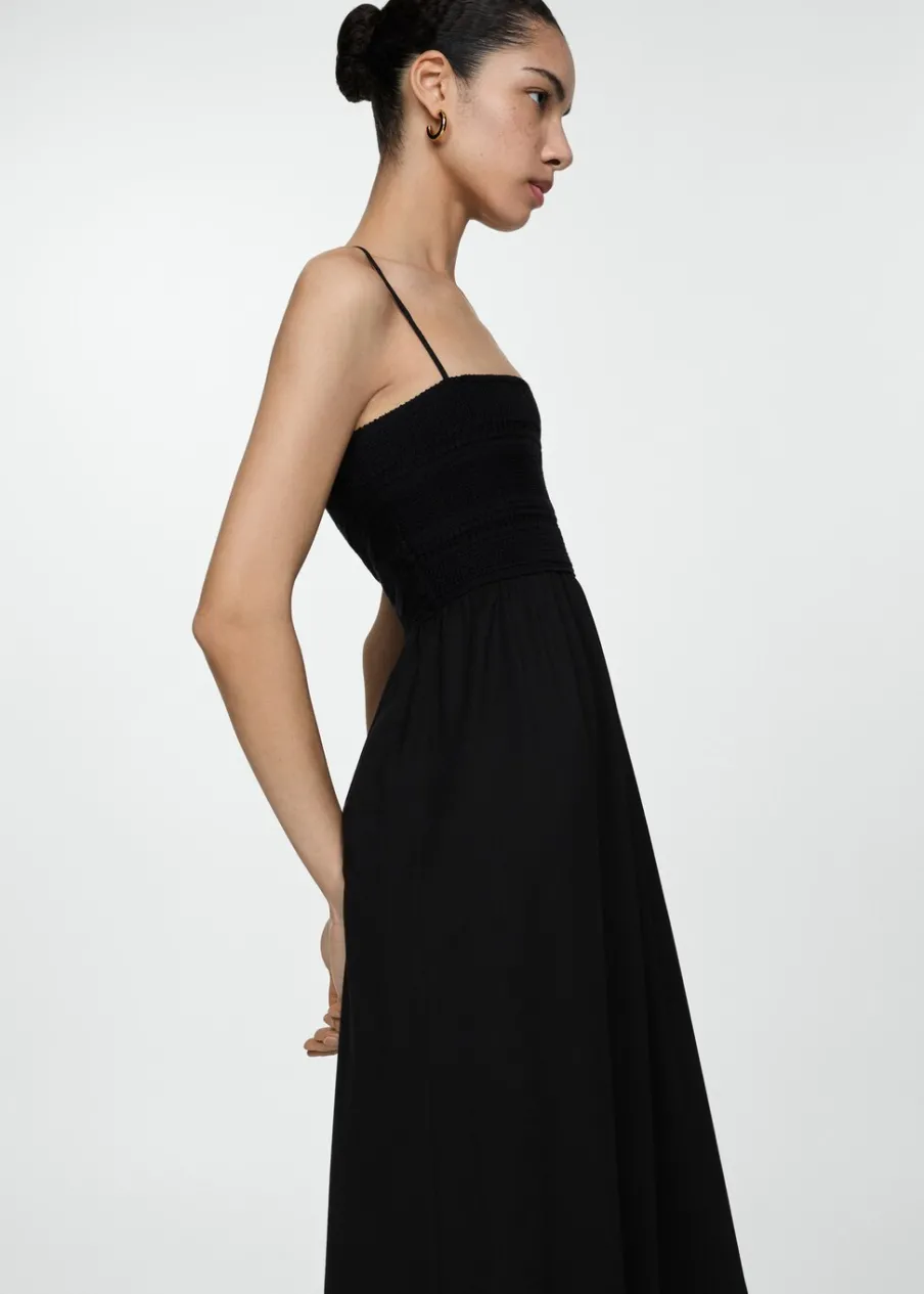 OpisKrój do kolan. Model evasé. Kwadratowy dekolt. Bez rękawów. Cienkie ramiączka. Bez zapięcia. Tkanina z 100% ba…