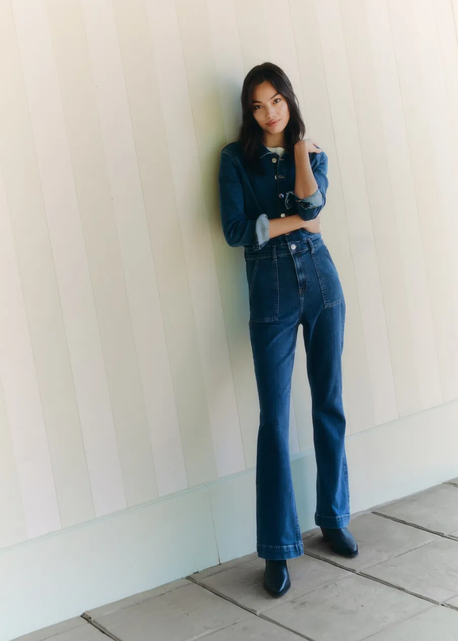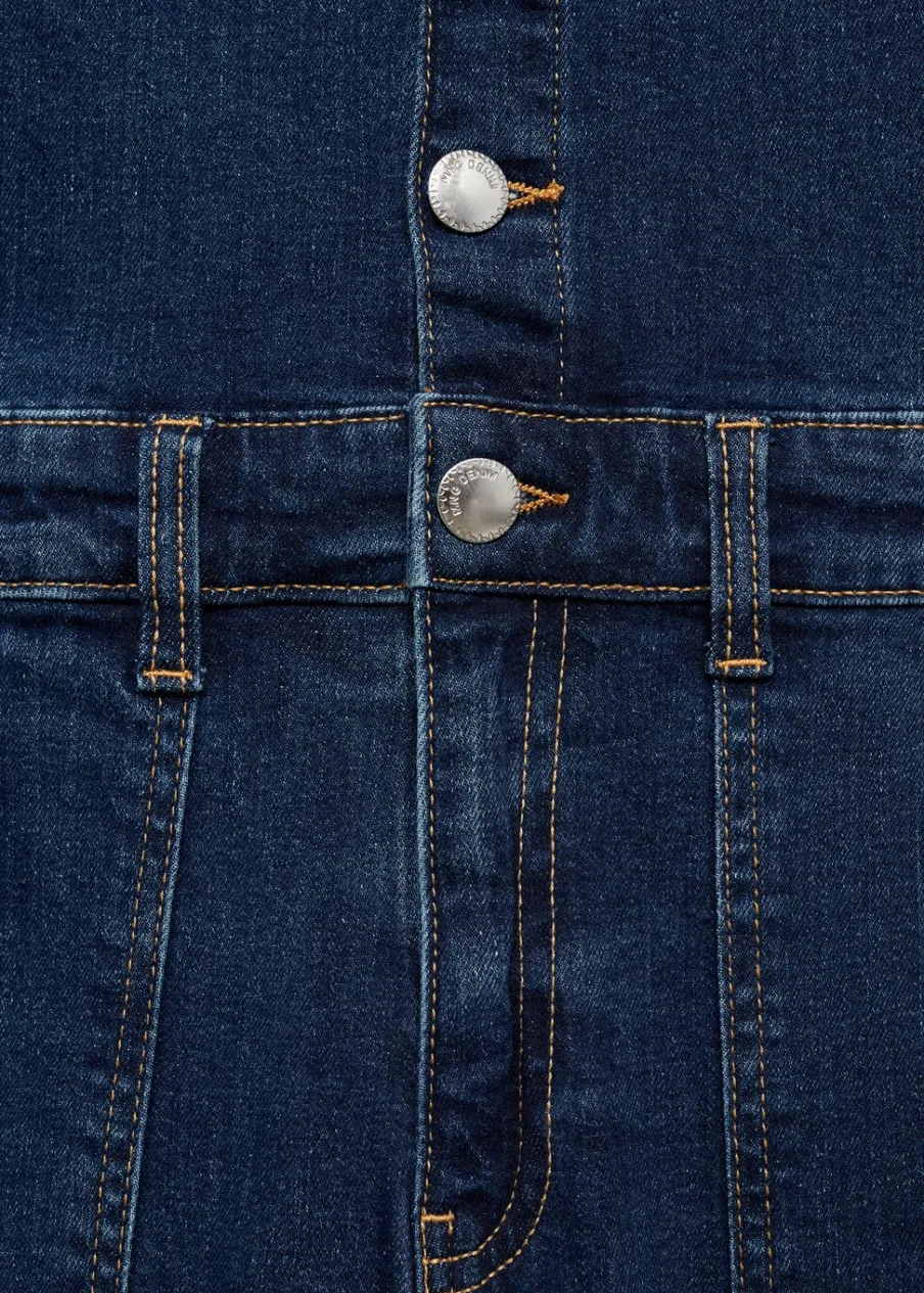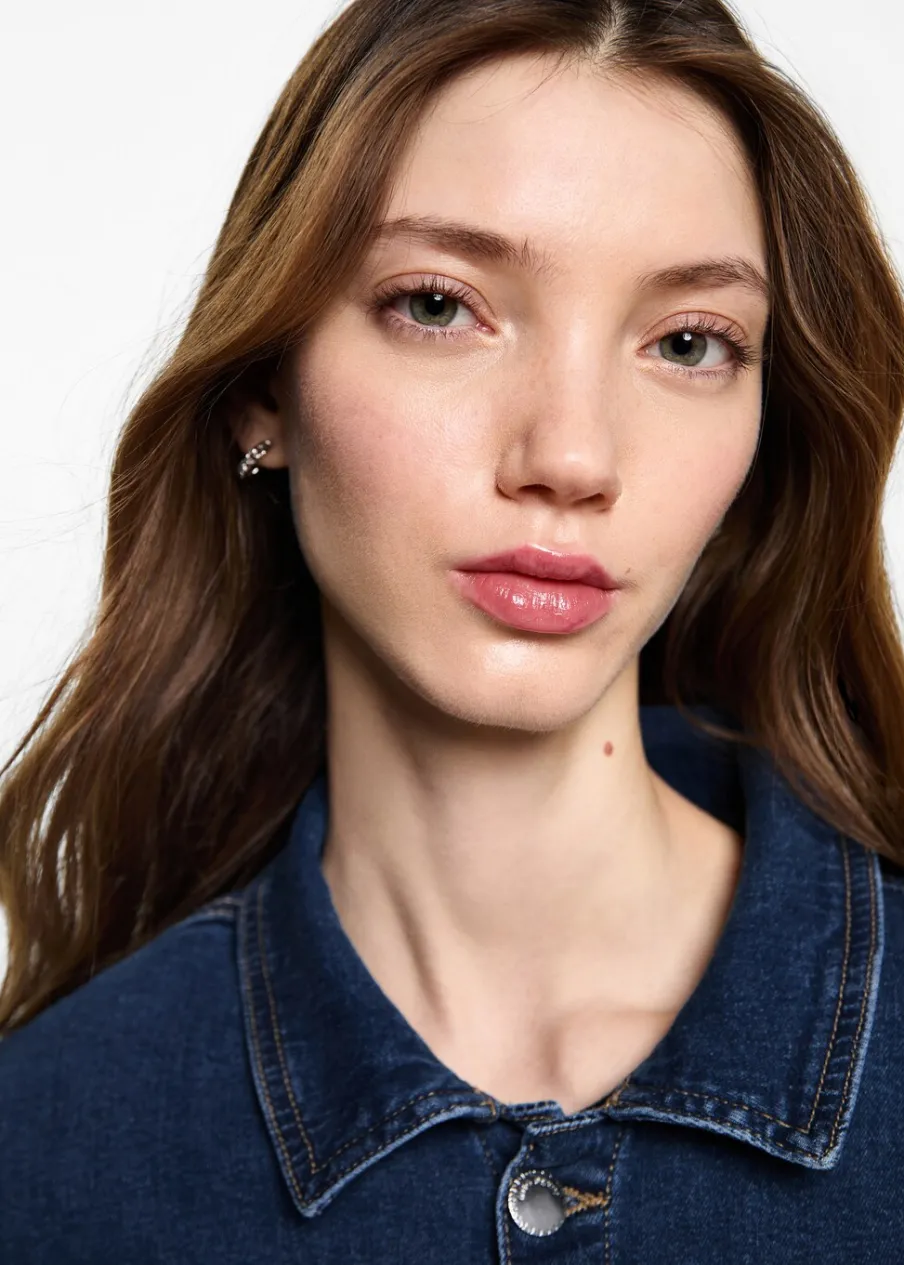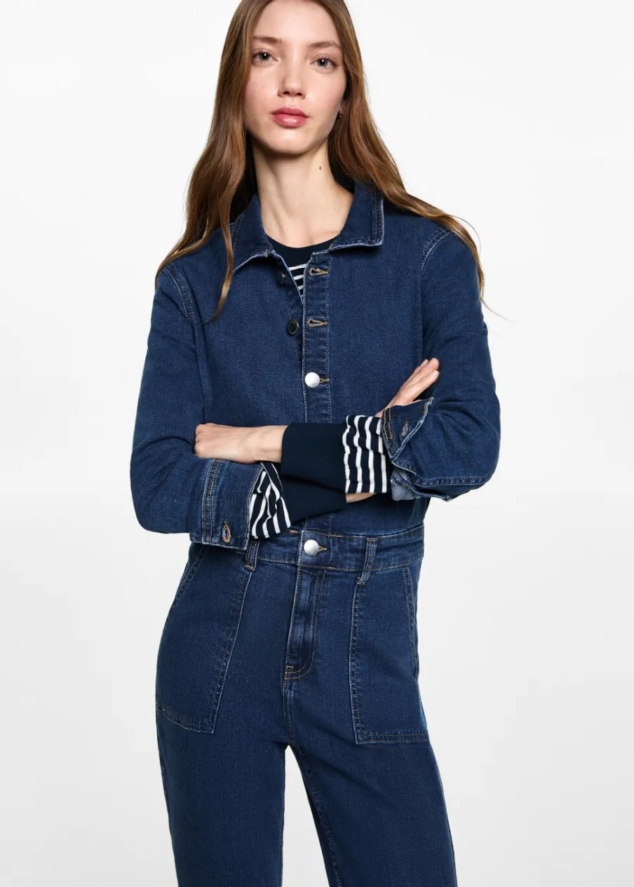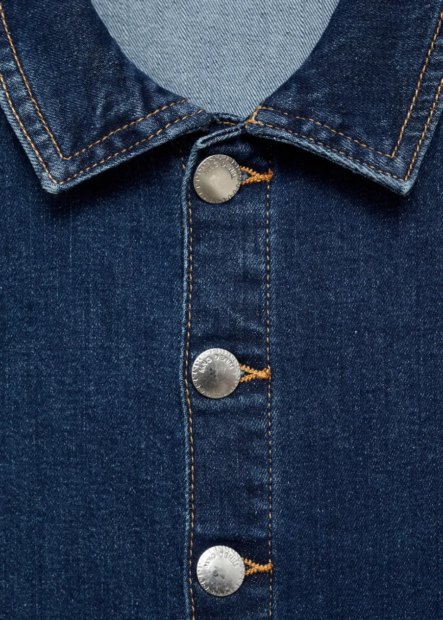 Tkanina denim. Jeansowy styl. Koszulowy kołnierz. Zapięcie z przodu na guziki. Dwie kieszenie z przodu.