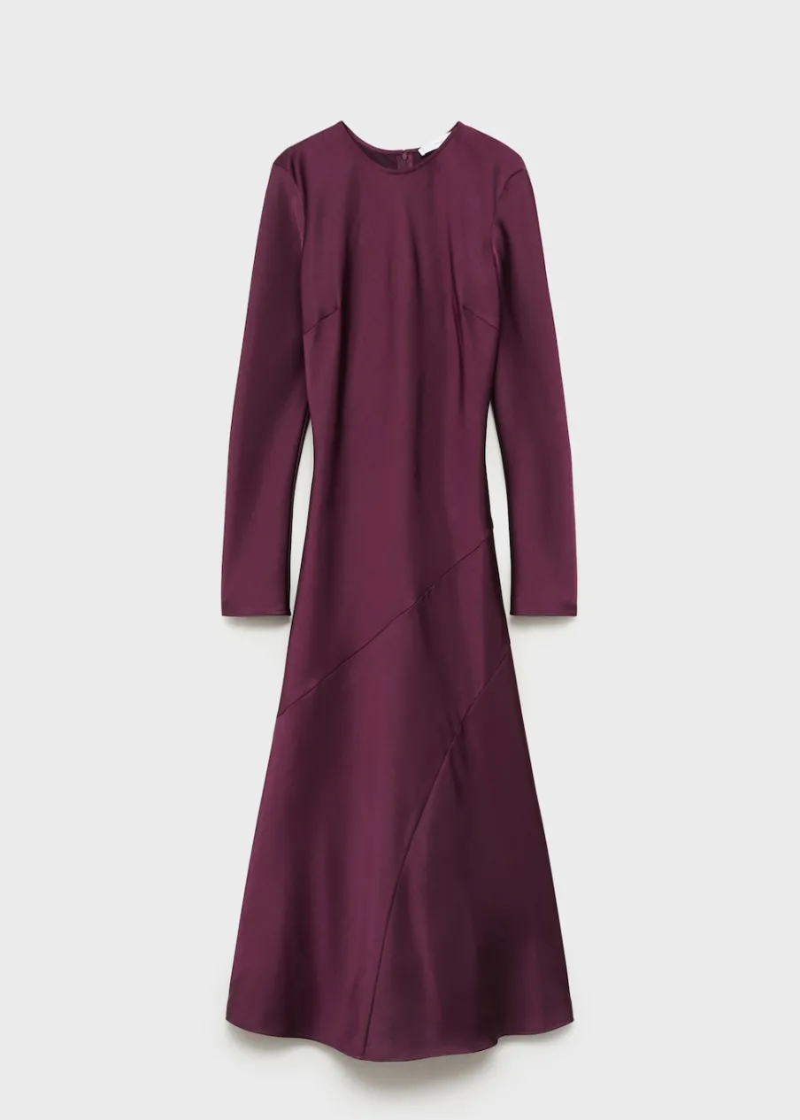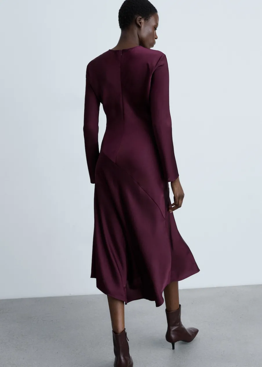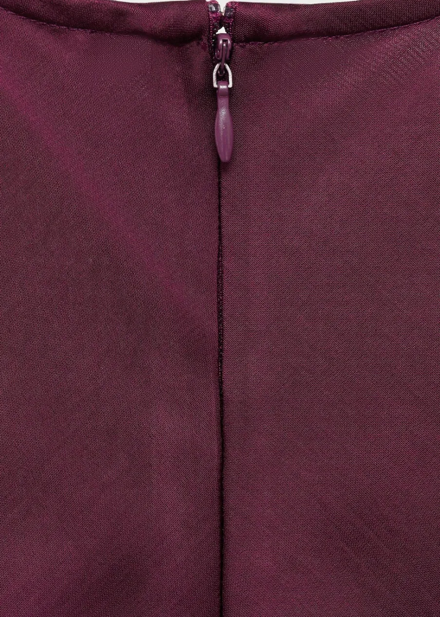Satynowa tkanina. Cienka tkanina. Model evasé. Krój do kolan. Okrągły dekolt. Długi rękaw. Zapięcie z tyłu na suwak. Dekoracyjne szwy. Bez podszewki.