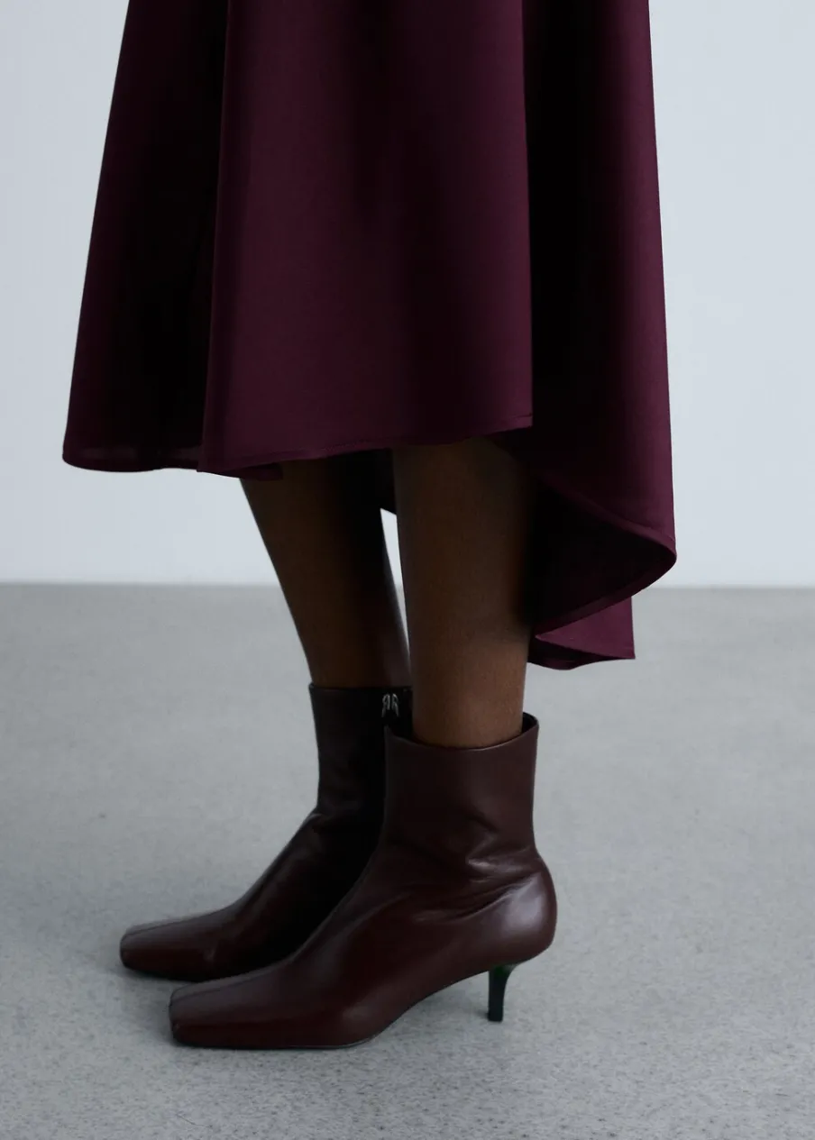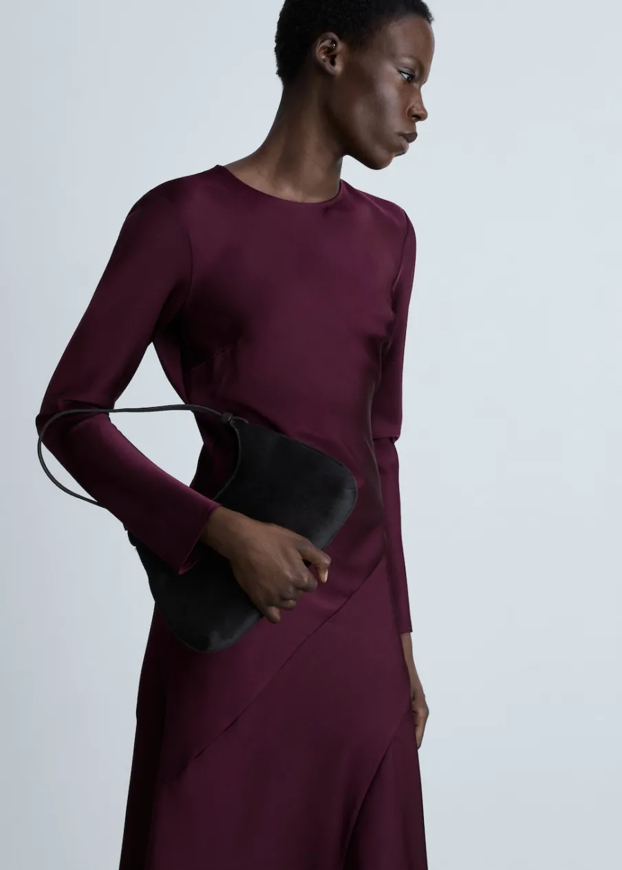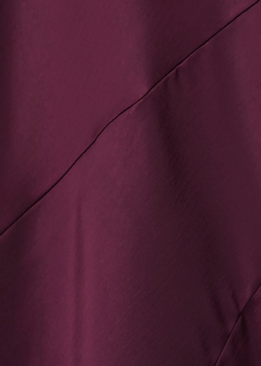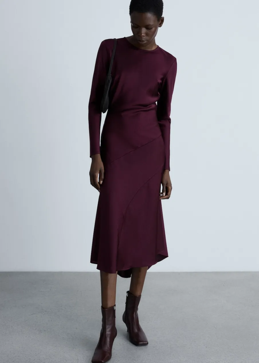 Satynowa tkanina. Cienka tkanina. Model evasé. Krój do kolan. Okrągły dekolt. Długi rękaw. Zapięcie z tyłu na suwak. Dekoracyjne szwy. Bez podszewki.