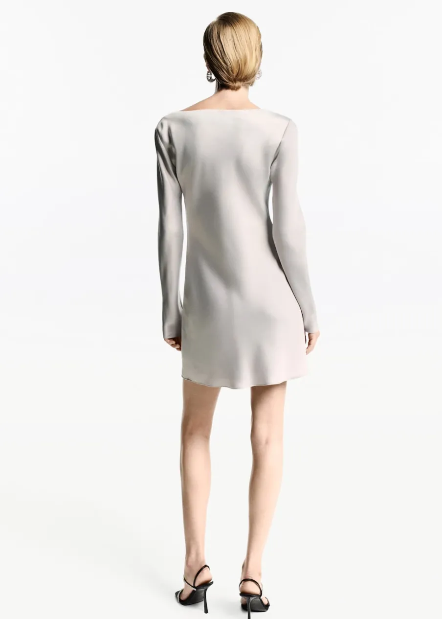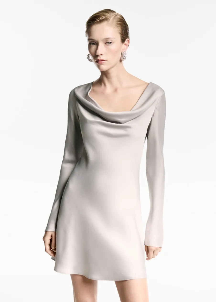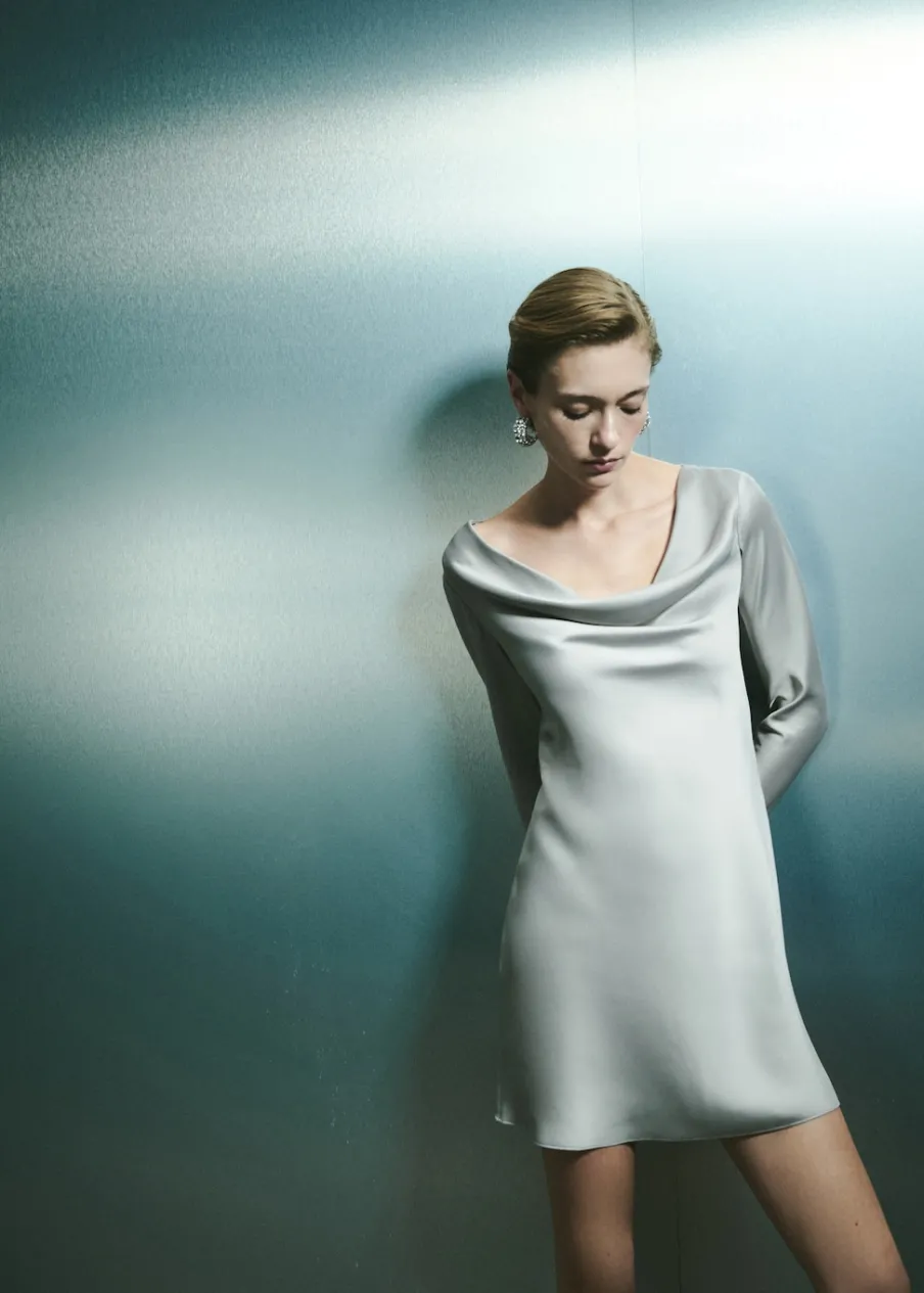 OpisSatynowa tkanina. Model prosty. Krótki krój. Drapowany dekolt. Długi rękaw. Bez zapięcia. Kolekcja wizytowa. Mo…