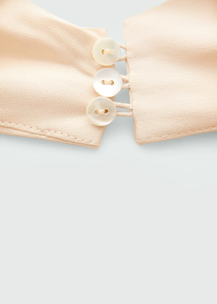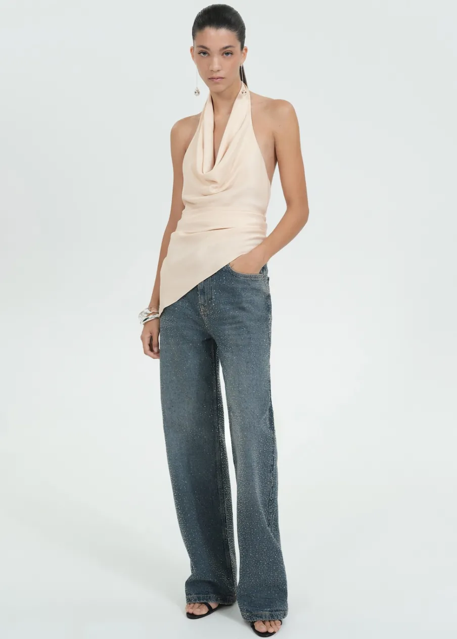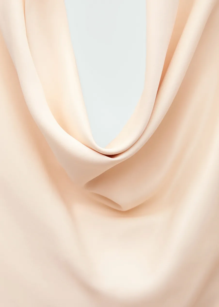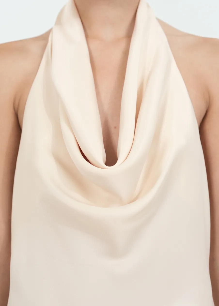 Satynowa tkanina. Lejąca tkanina. Model prosty. Krótki krój. Drapowany dekolt. Bez rękawów. Plecy z wycięciem. Zapięcie na guziki przy szyi. Modelka ma 177 cm wzrostu i nosi rozmiar S/36. Kolekcja wizytowa. Kolekcja Selection.