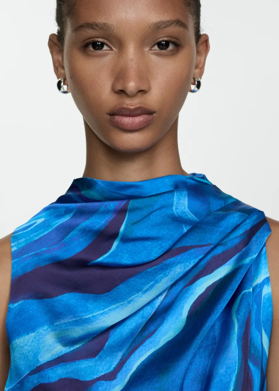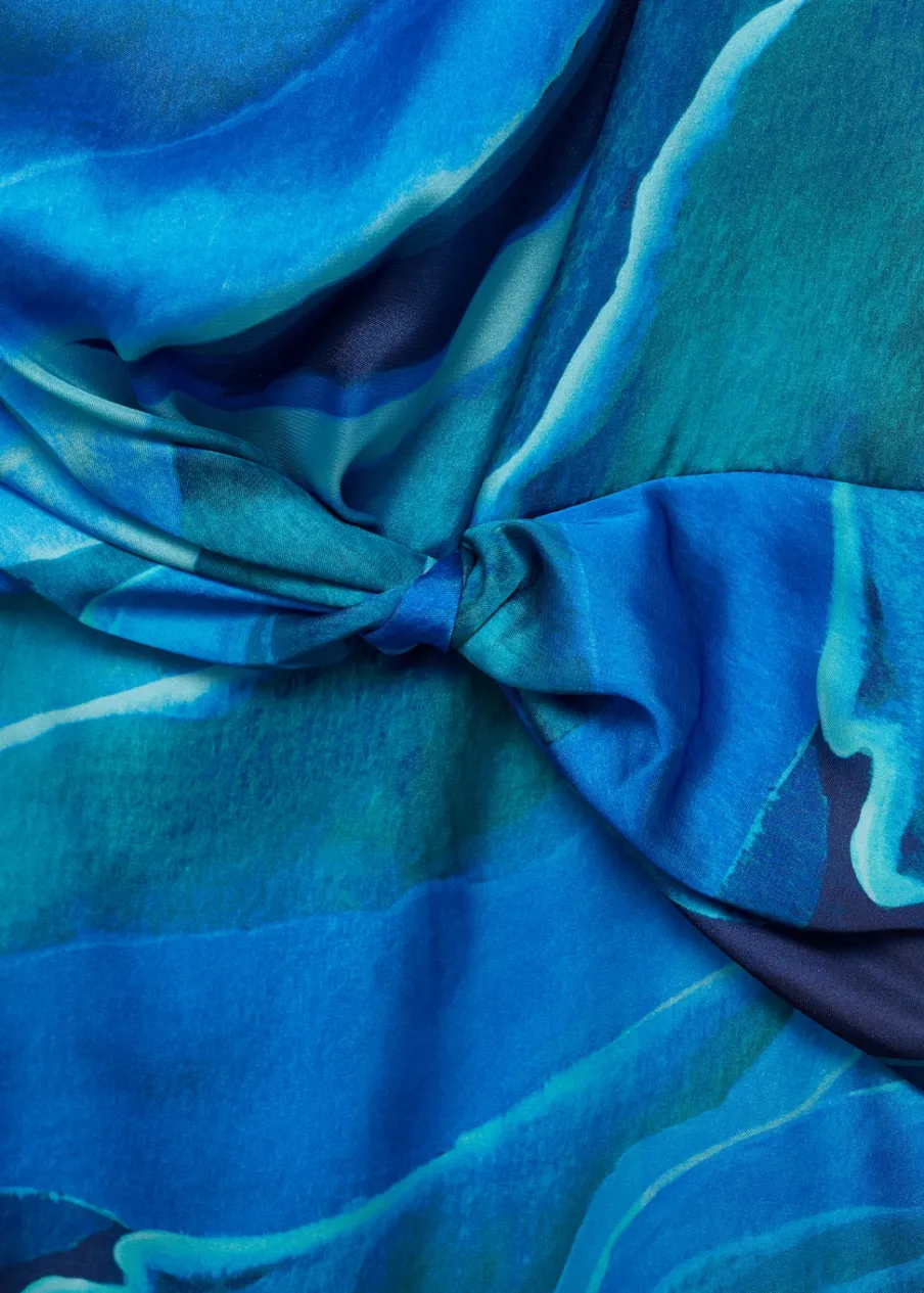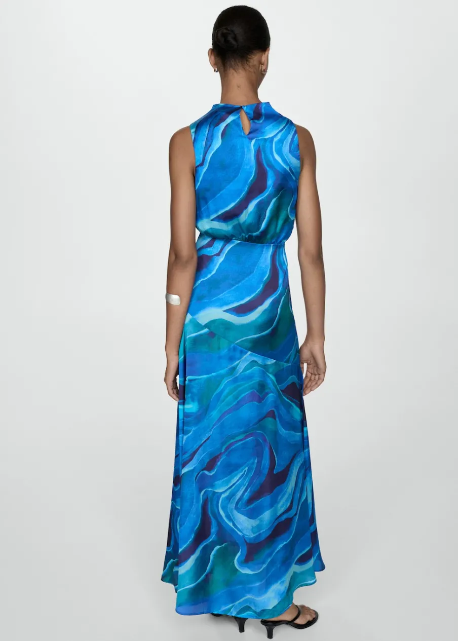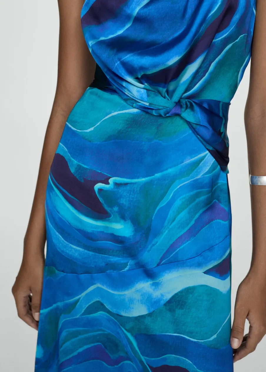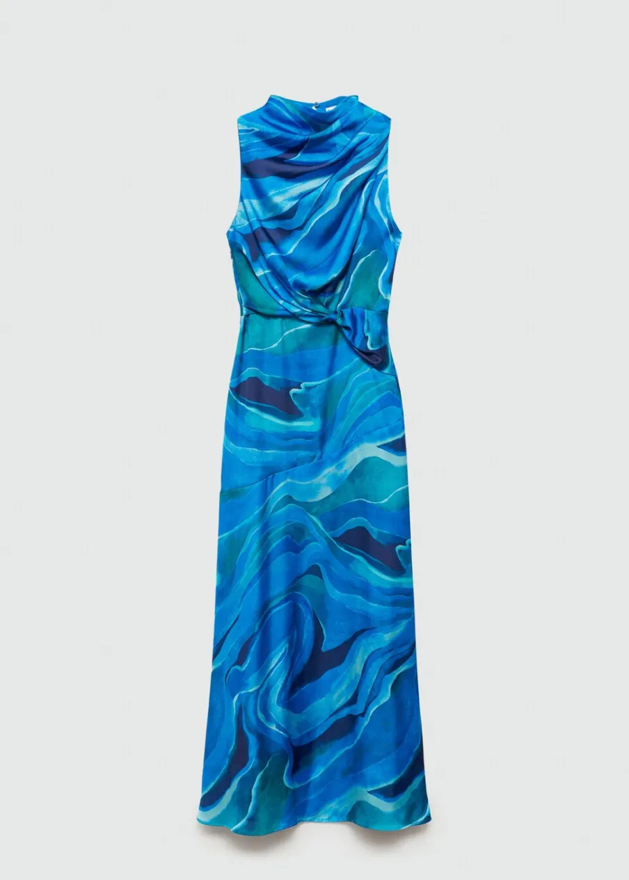 Satynowa tkanina. Lejąca tkanina. Model długi. Model evasé. Golf. Drapowany dekolt. Bez rękawów. Zapięcie z tyłu na kryty suwak. Ozdobny węzeł. Kolekcja wizytowa. Nadruk.