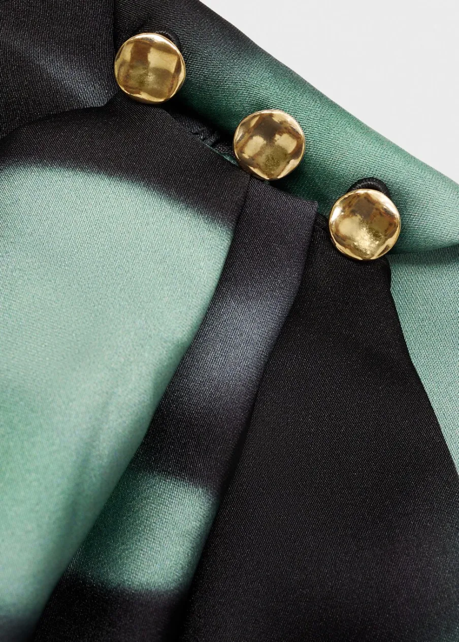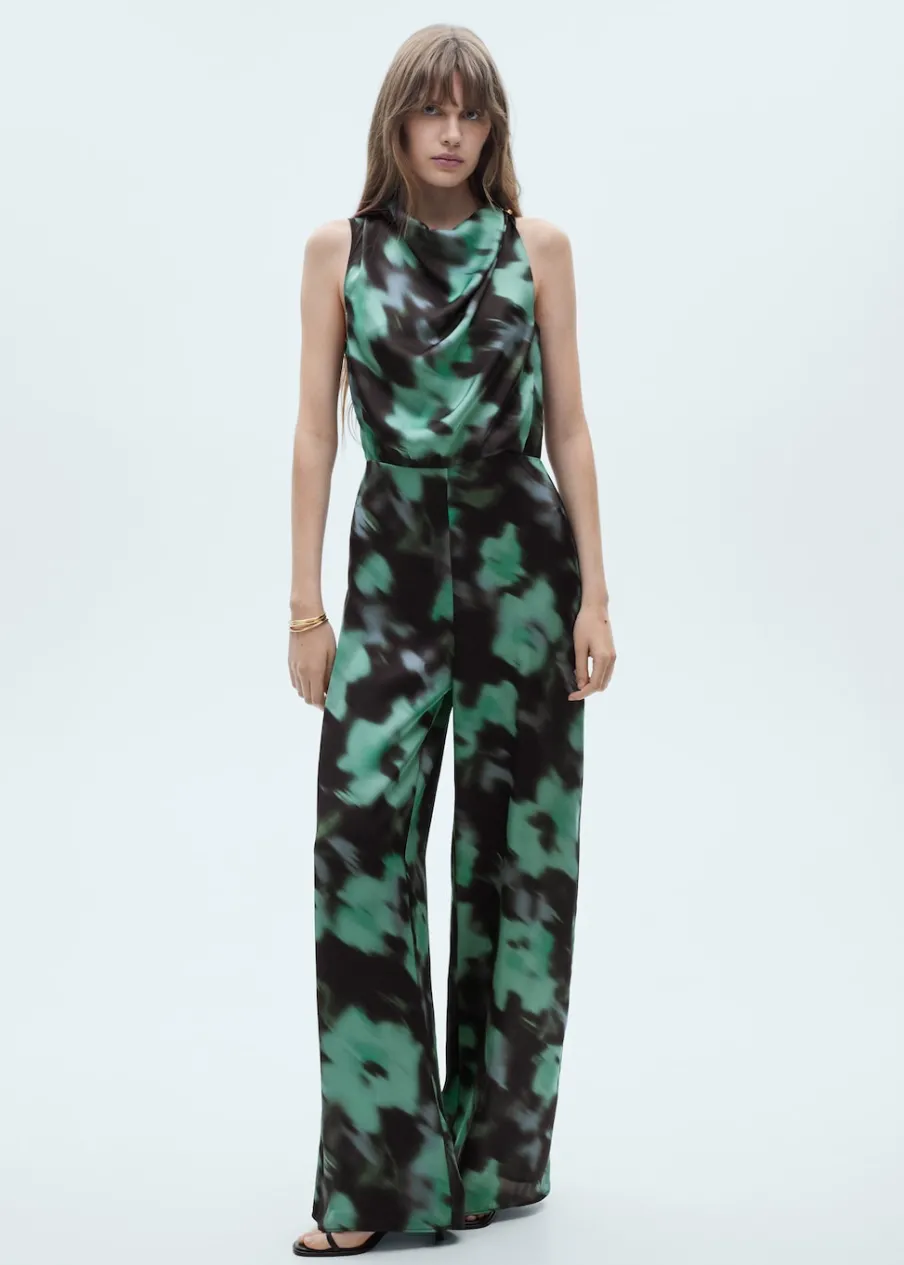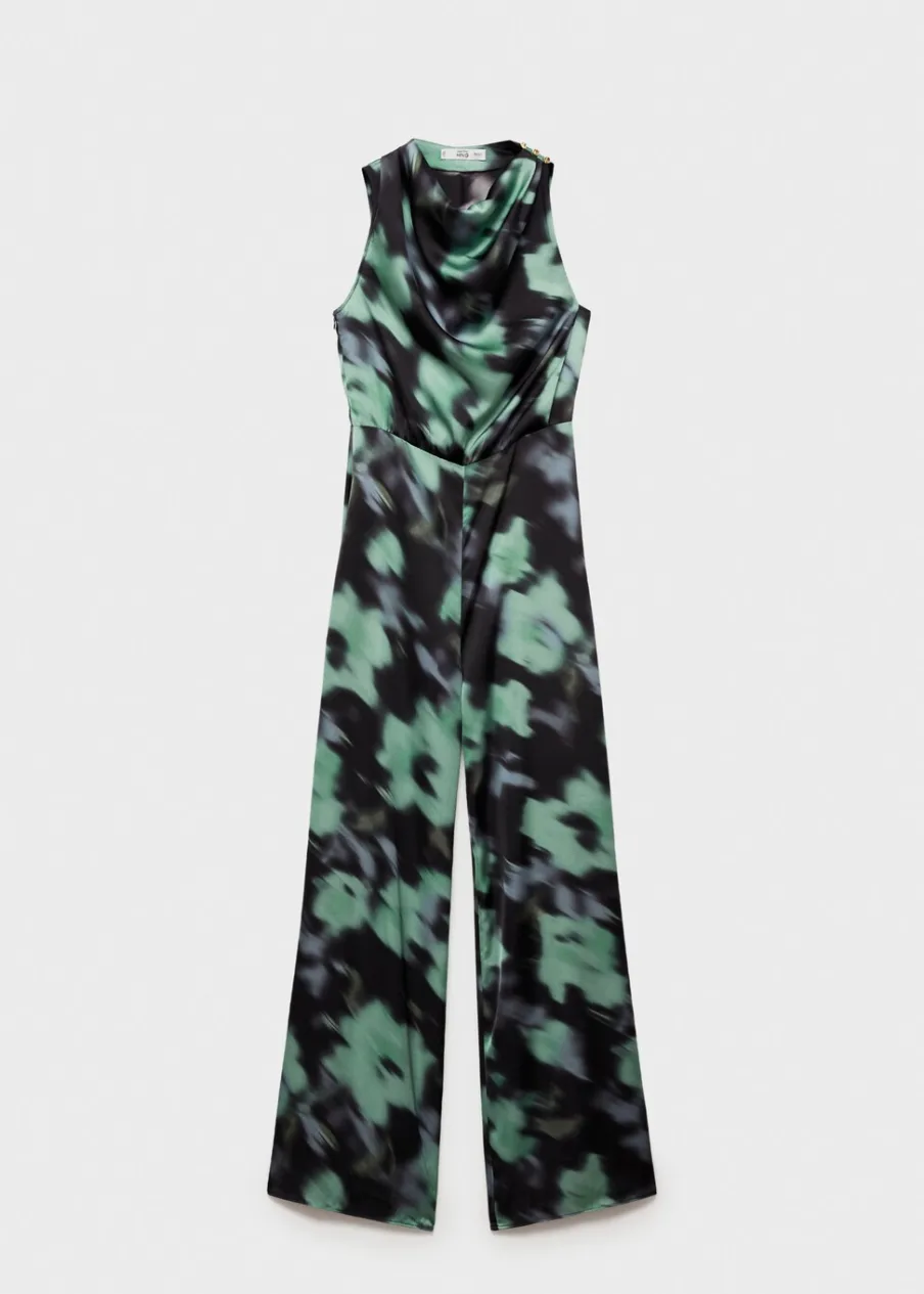 Lejąca tkanina. Satynowa tkanina. Kwiatowy wzór. Model długi. Fason wideleg. Drapowany dekolt. Bez rękawów. Zapięcie na guziki na ramieniu. Kolekcja wizytowa. Modelka ma 178 cm wzrostu i nosi rozmiar S/36.