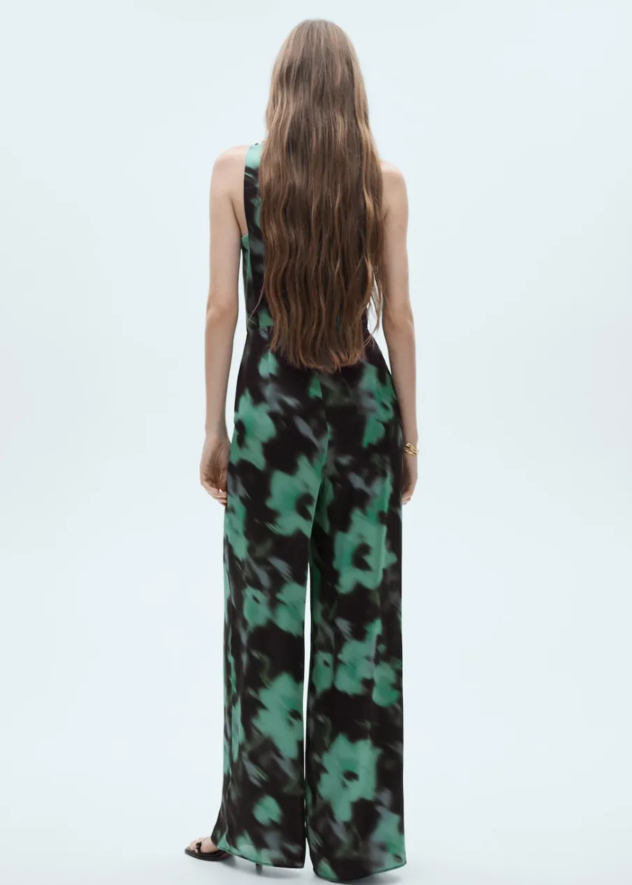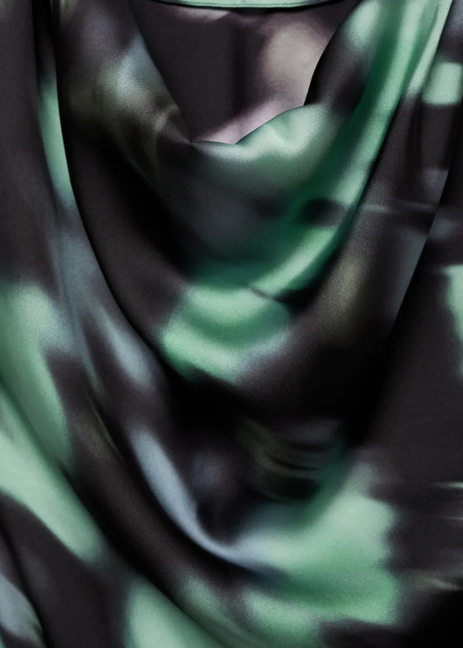 OpisLejąca tkanina. Satynowa tkanina. Kwiatowy wzór. Model długi. Fason wideleg. Drapowany dekolt. Bez rękawów. Zap…