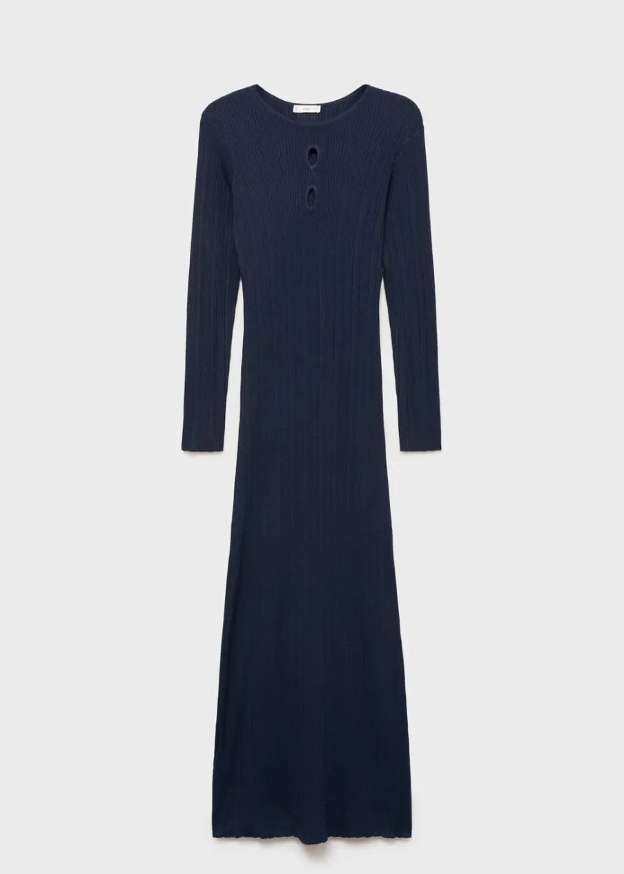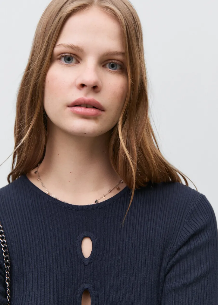Model długi. Ściągaczowa dzianina. Model wcięty. Ażurowy detal. Długi rękaw. Okrągły dekolt. Bez zapięcia.