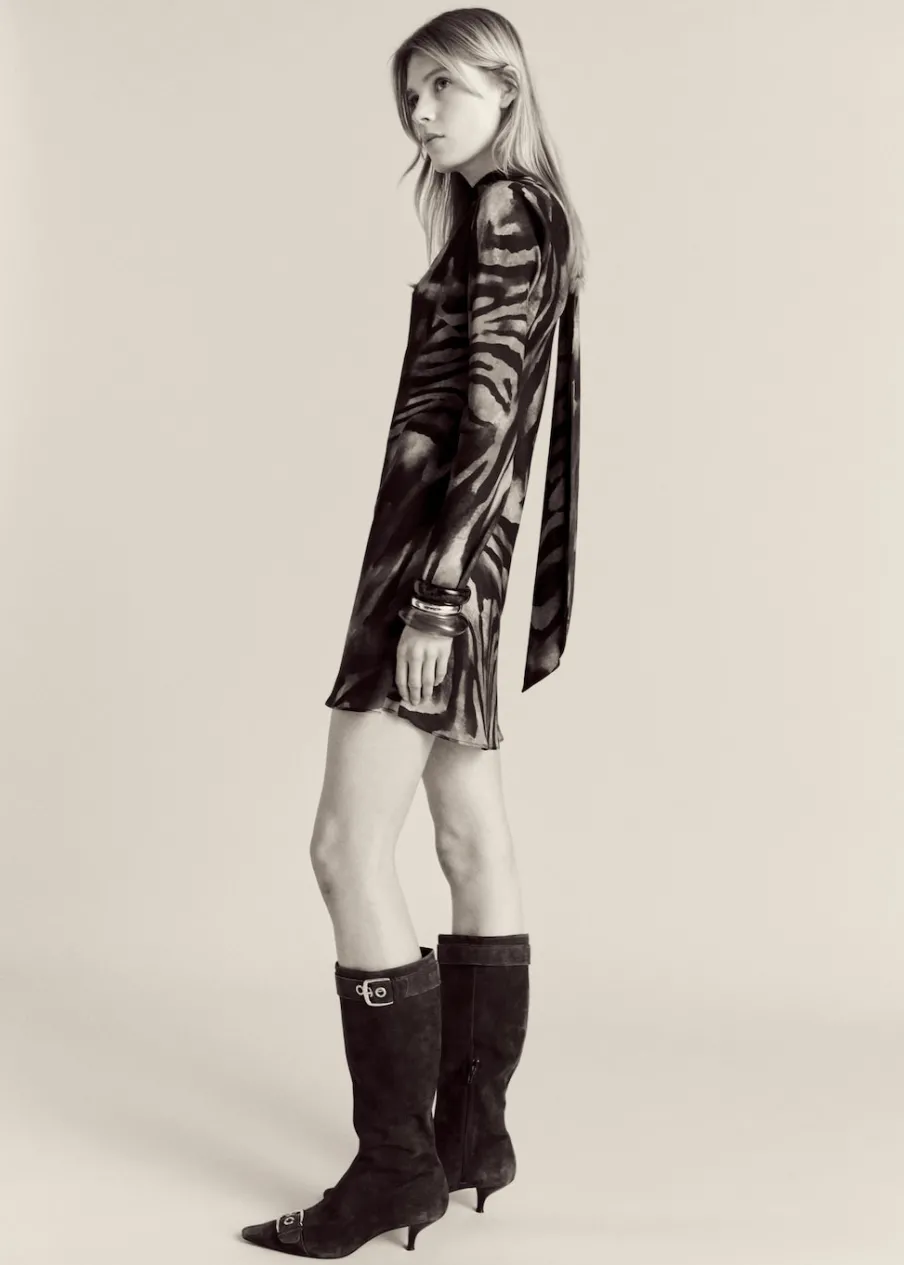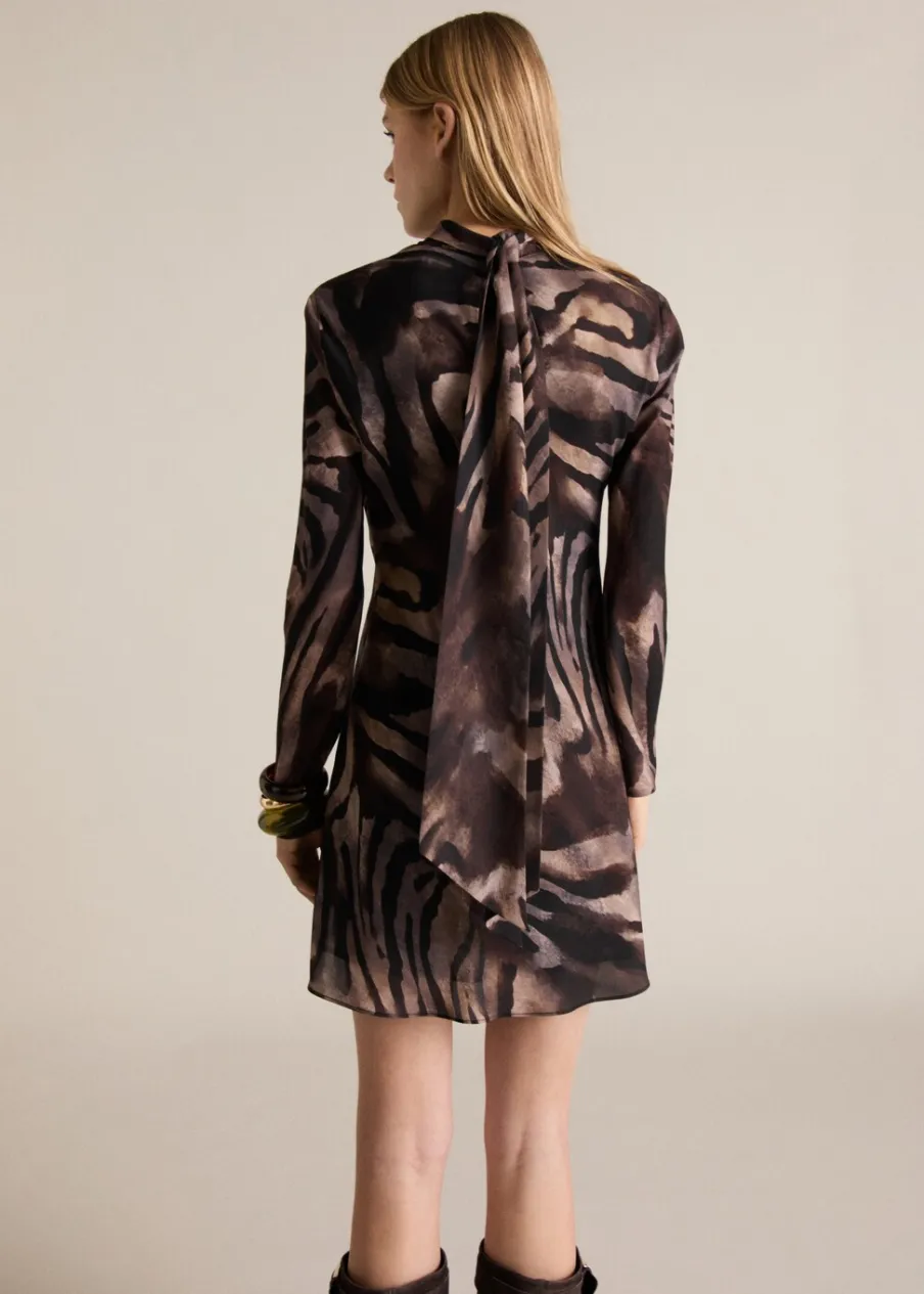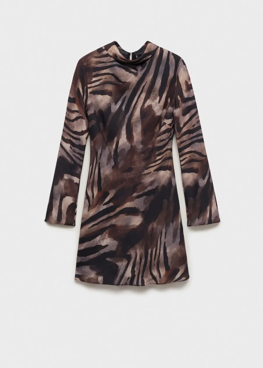 Lejąca tkanina z satynowym wykończeniem. Krótki krój. Model evasé. Zwierzęcy wzór. Wzór w zebrę. Drapowany dekolt. Długi rękaw. Zapięcie z tyłu na suwak. Wewnętrzna podszewka. Dostępne w Plus Size.