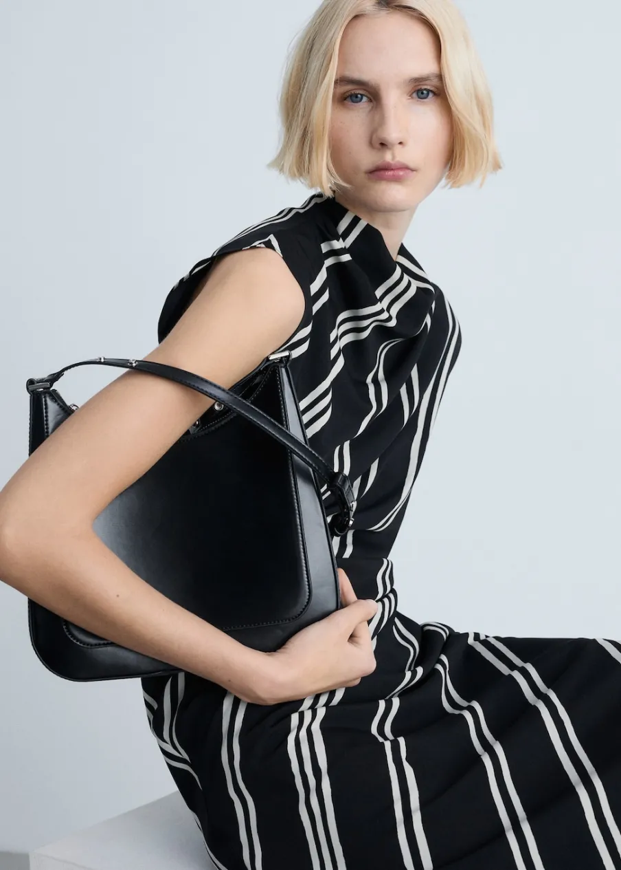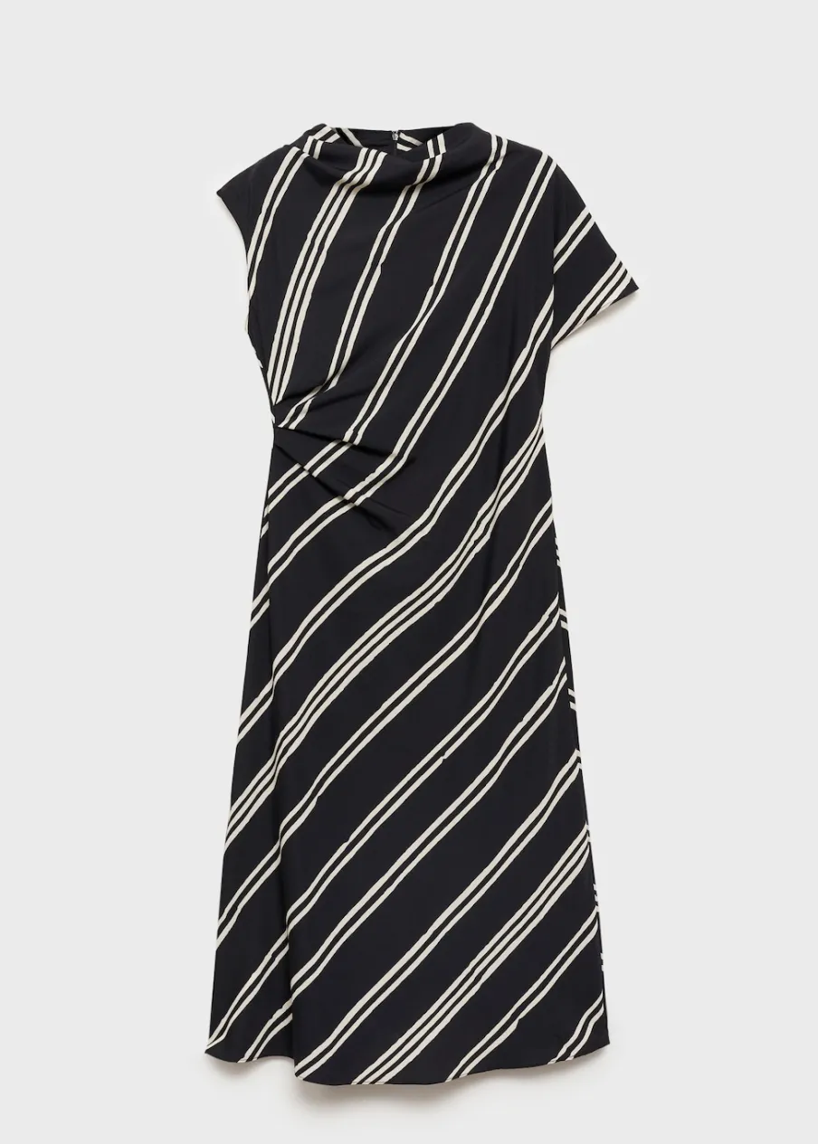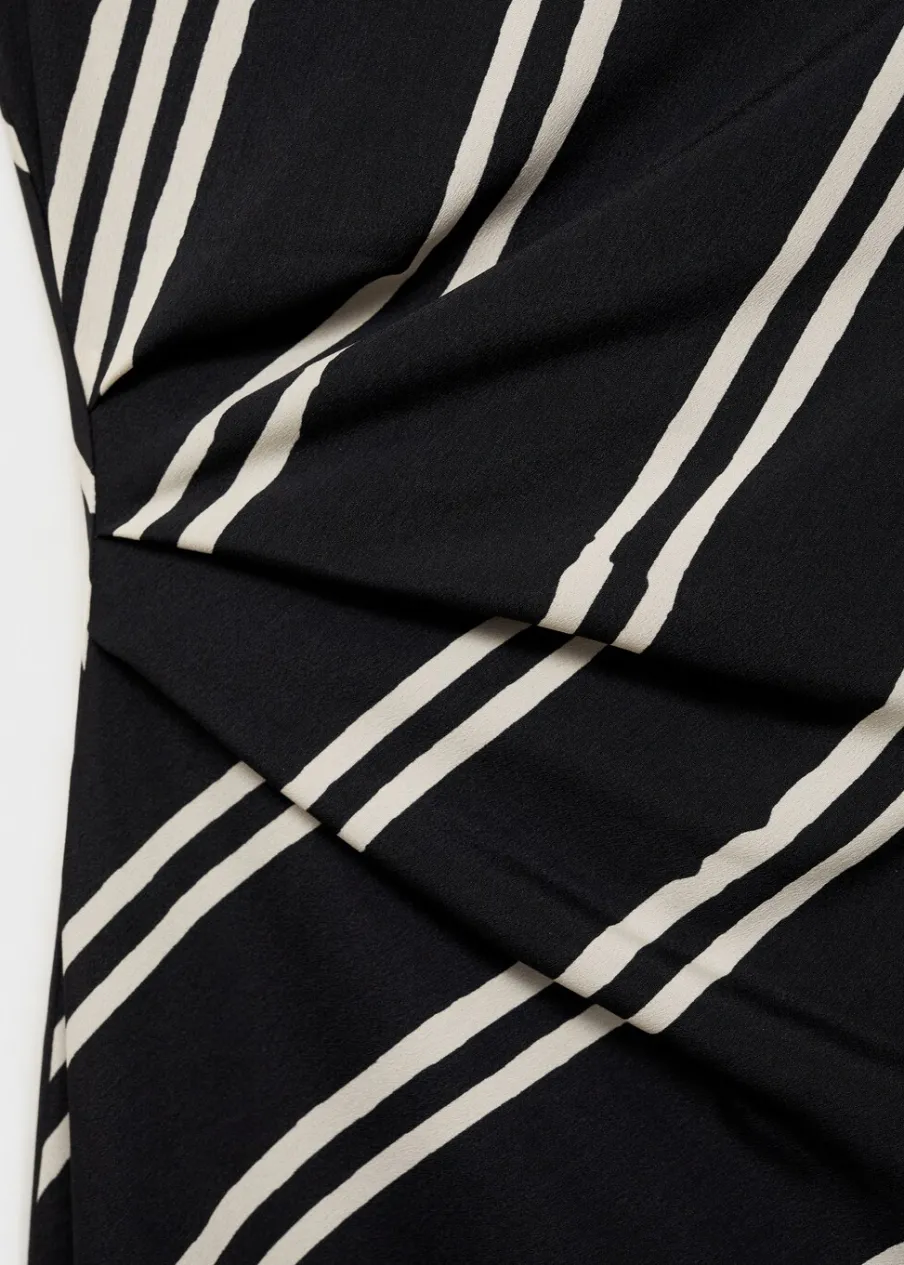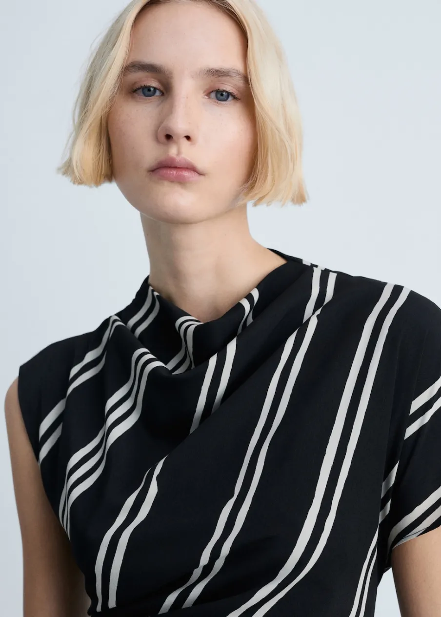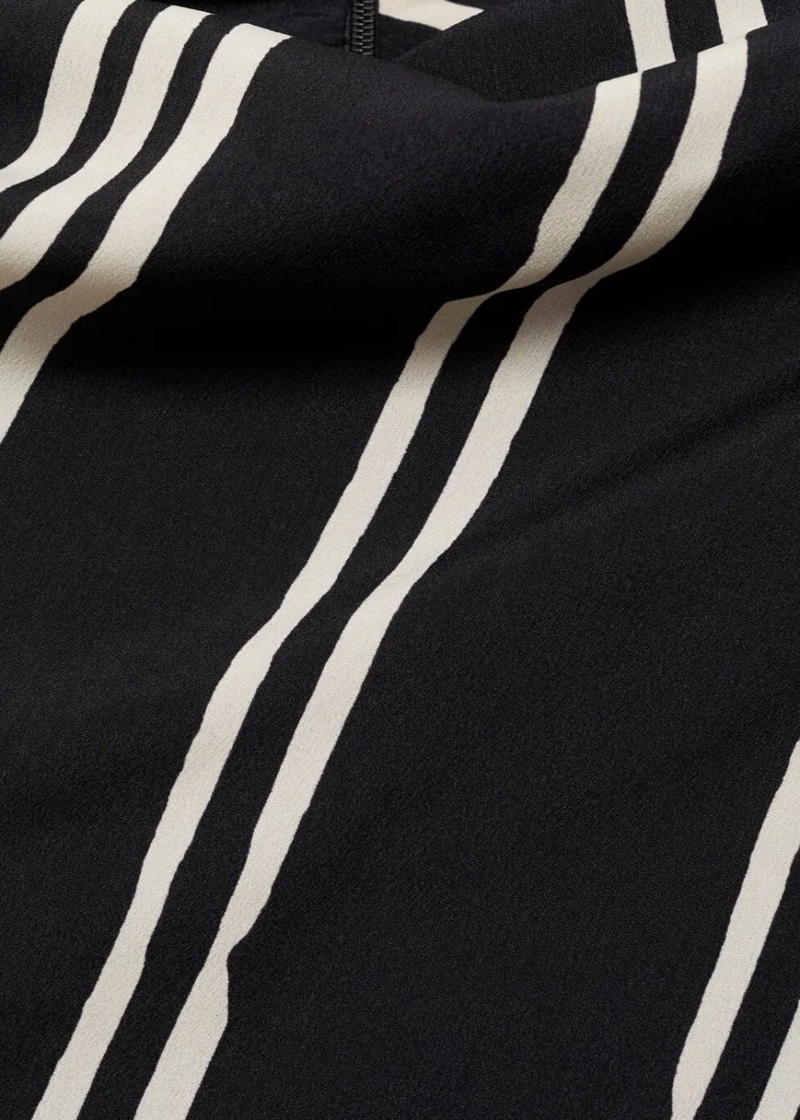 OpisLejąca tkanina z satynowym wykończeniem. Asymetryczny krój. Krój do kolan. Wzór w pasy. Półgolf. Krótki ręk…