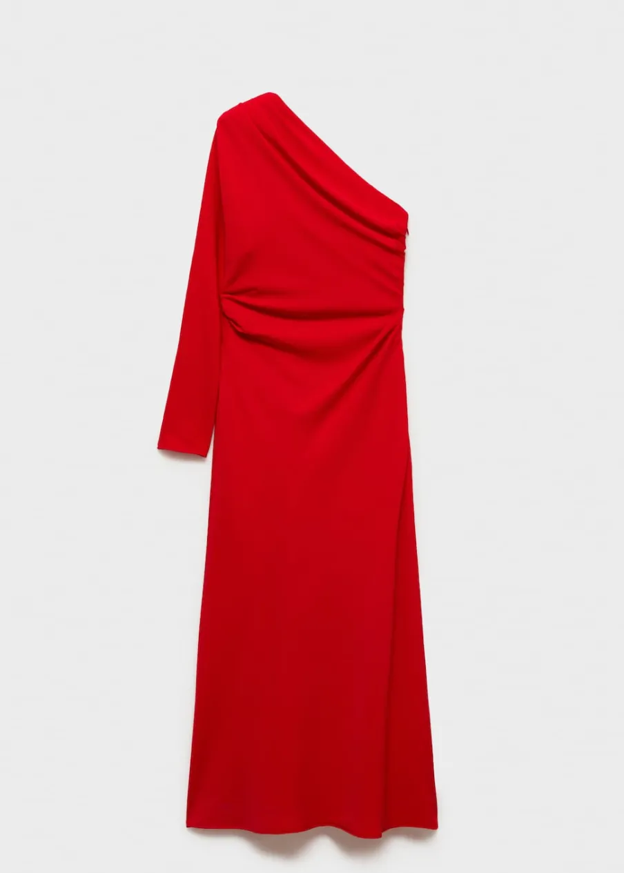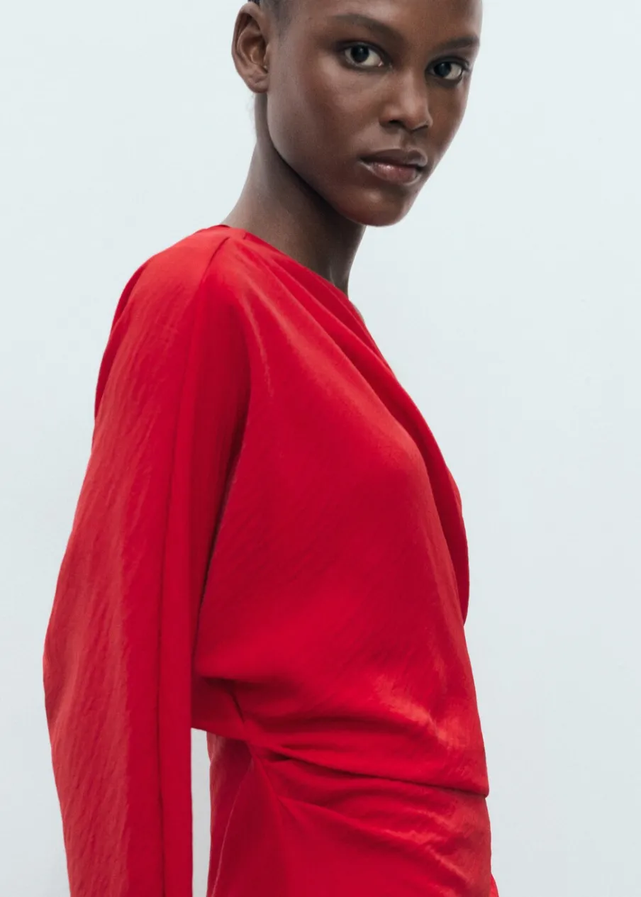 OpisLejąca tkanina. Asymetryczny krój. Krój do kolan. Slim-fit. Asymetryczny dekolt. Długi rękaw. Drapowana talia. …