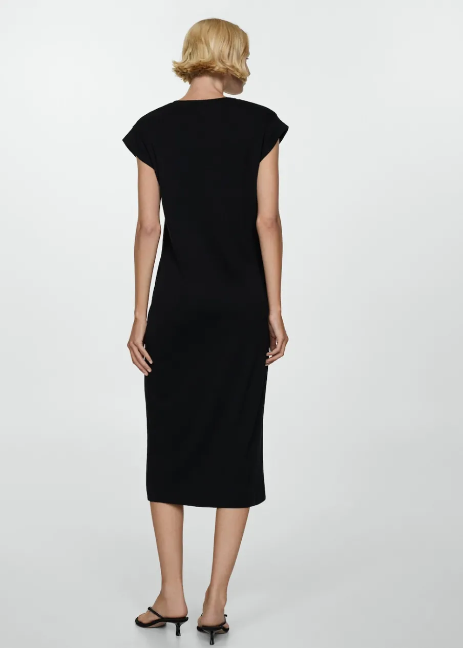 Krój do kolan. Model prosty. Okrągły dekolt. Krótki rękaw. Bez zapięcia. Tkanina z 100% bawełny.