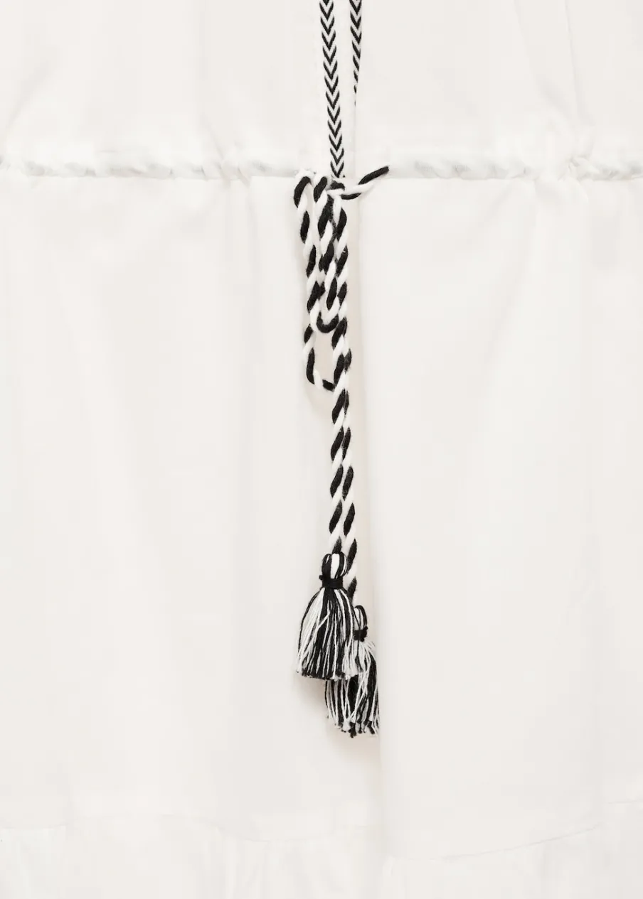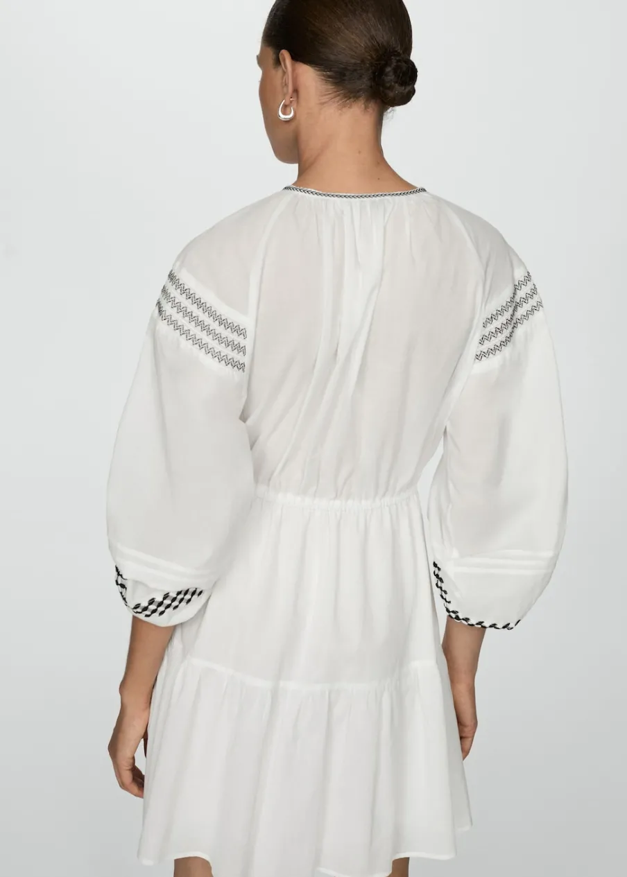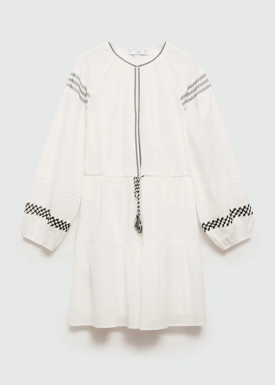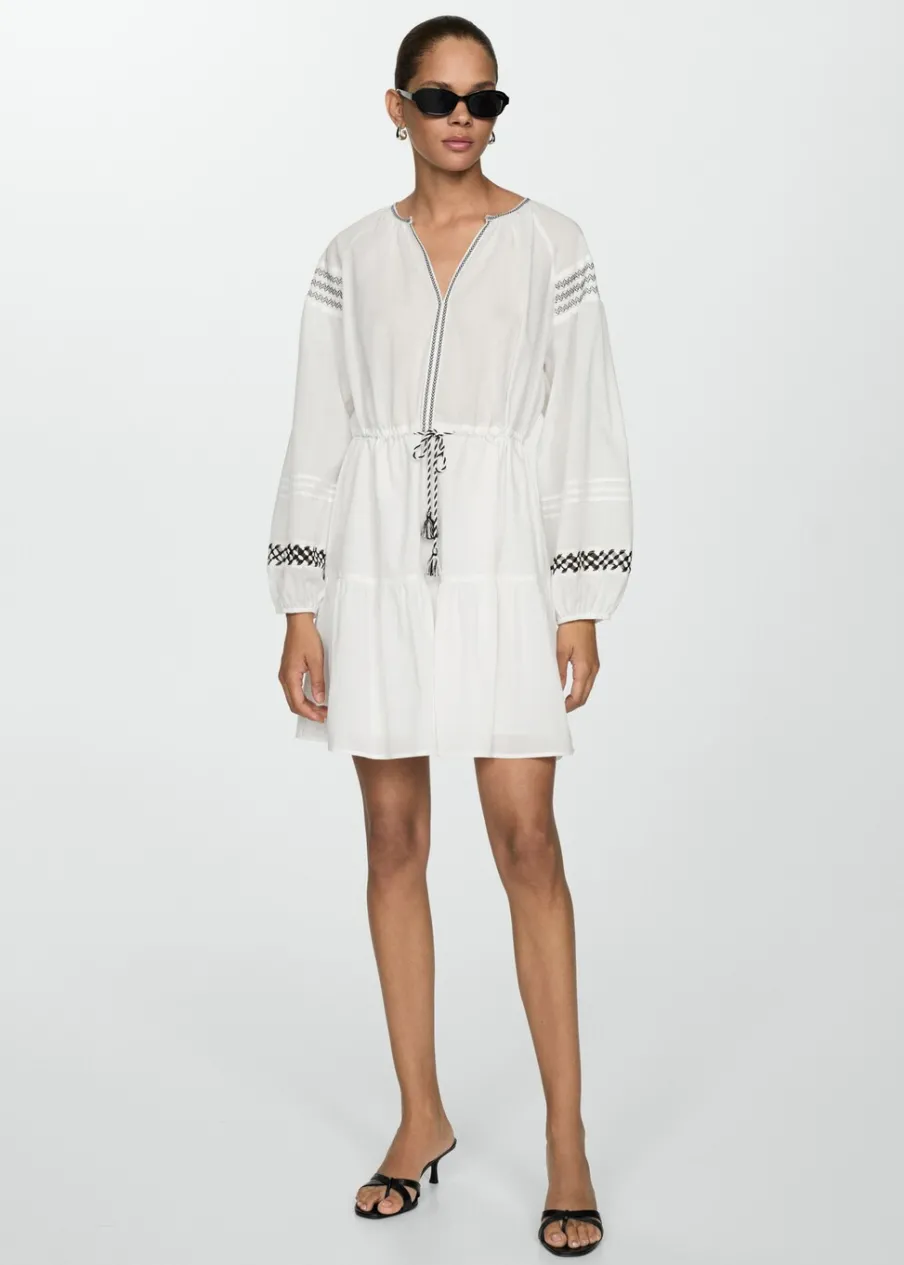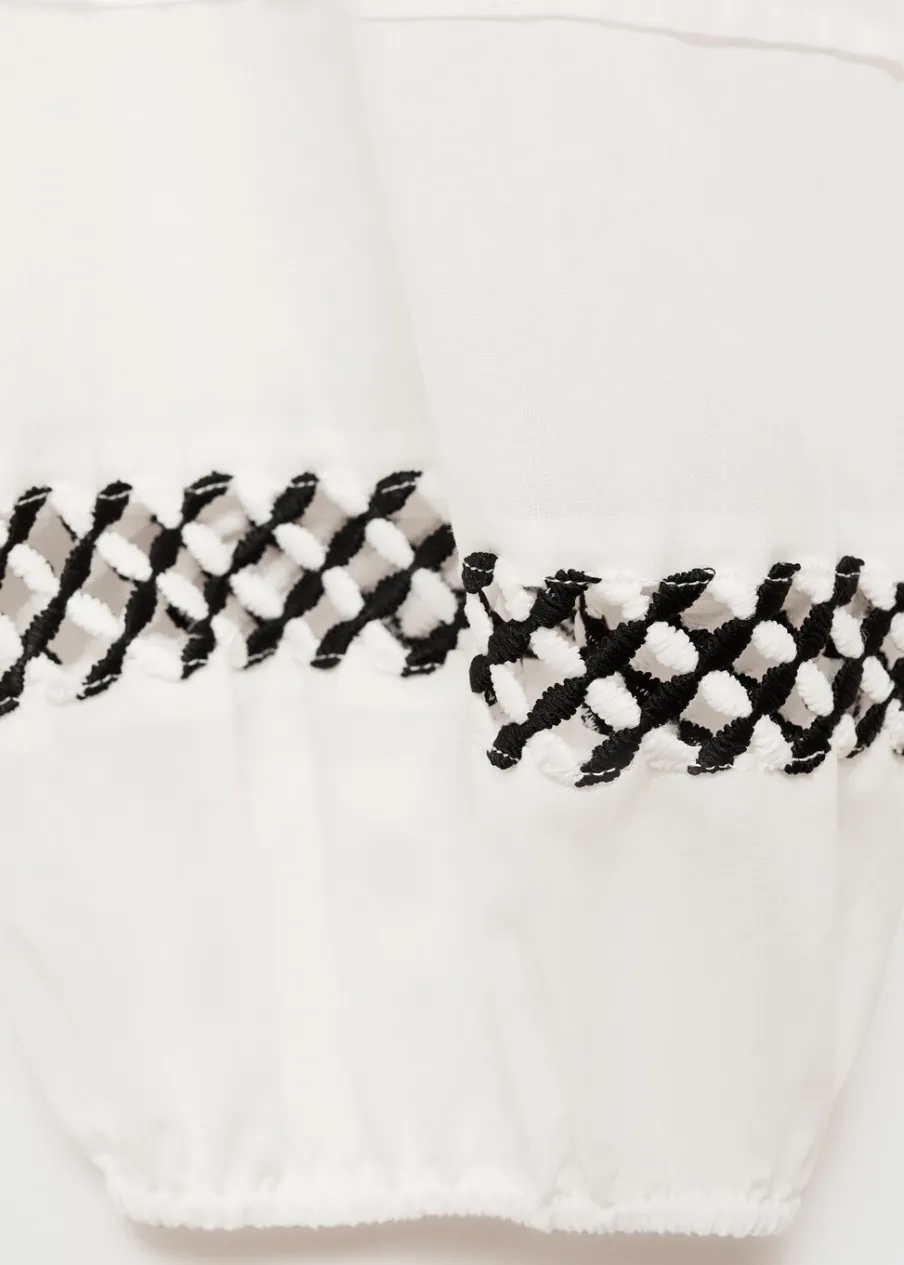 Krótki krój. Model evasé. Okrągły dekolt. Długi rękaw z elastycznymi mankietami. Elastyczny pas z wiązanym zapięciem. Haftowane detale. Ażurowe detale. Tkanina z 100% bawełny.
