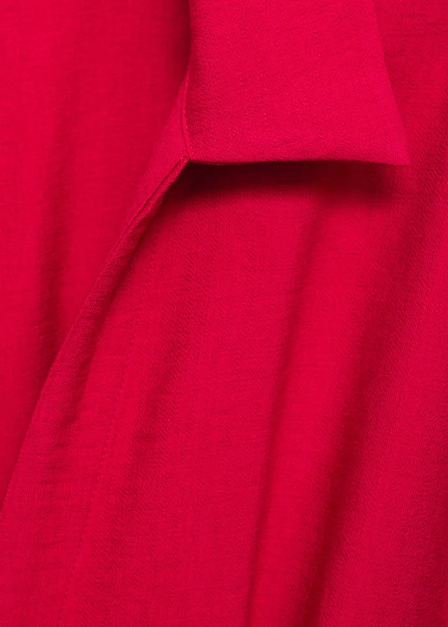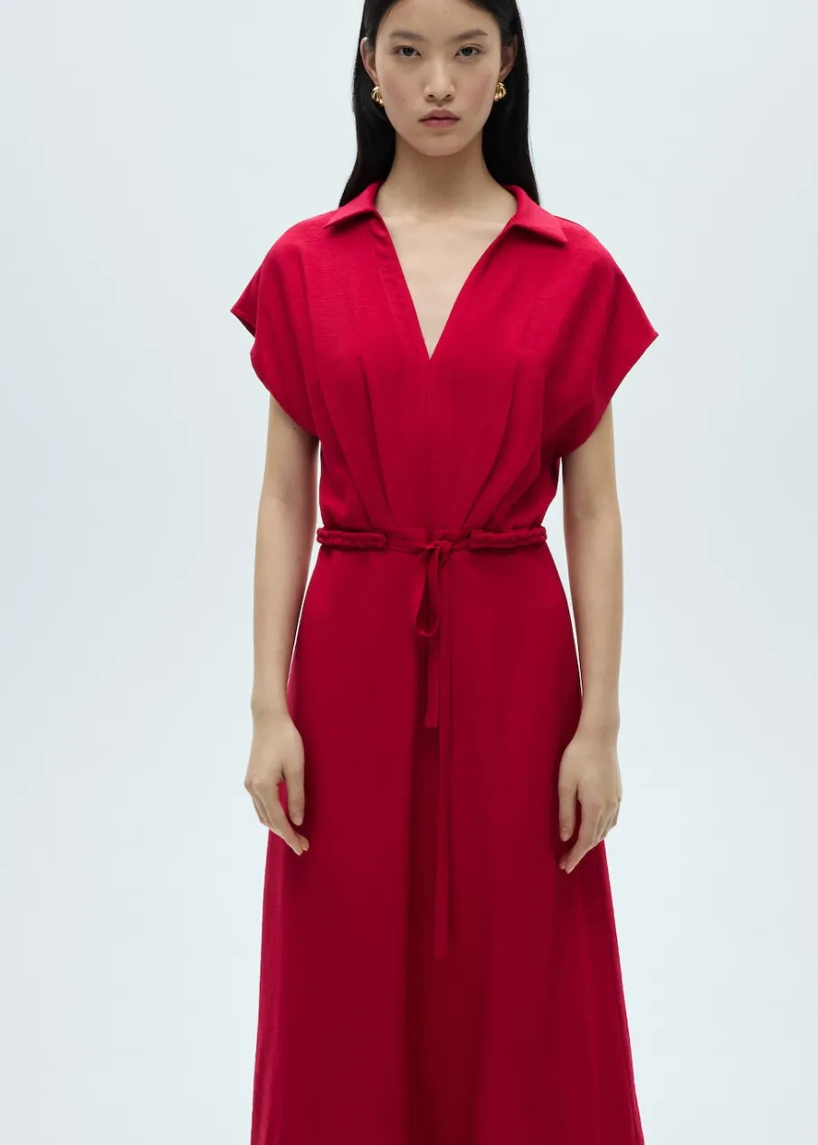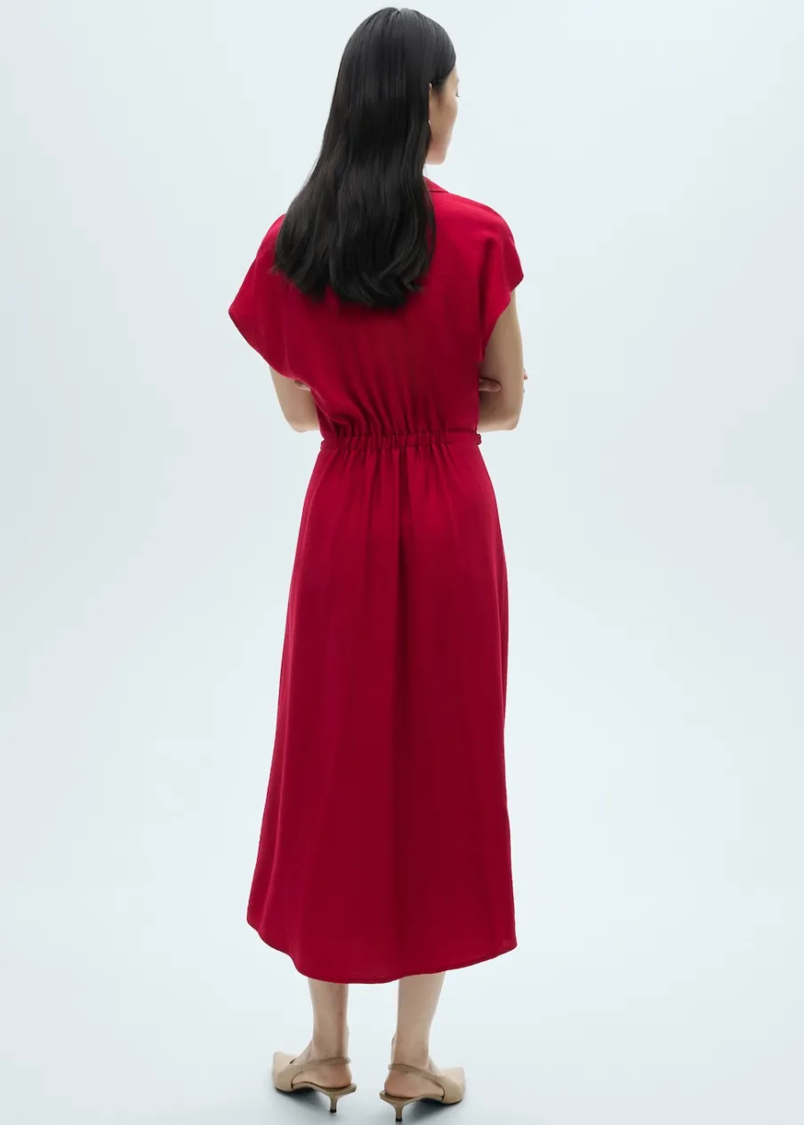 Cienka tkanina. Model evasé. Model prosty. Krój do kolan. Detal z zakładkami. Dekolt V. Krótki rękaw. Elastyczny pas ze sznurkiem. Bez zapięcia.
