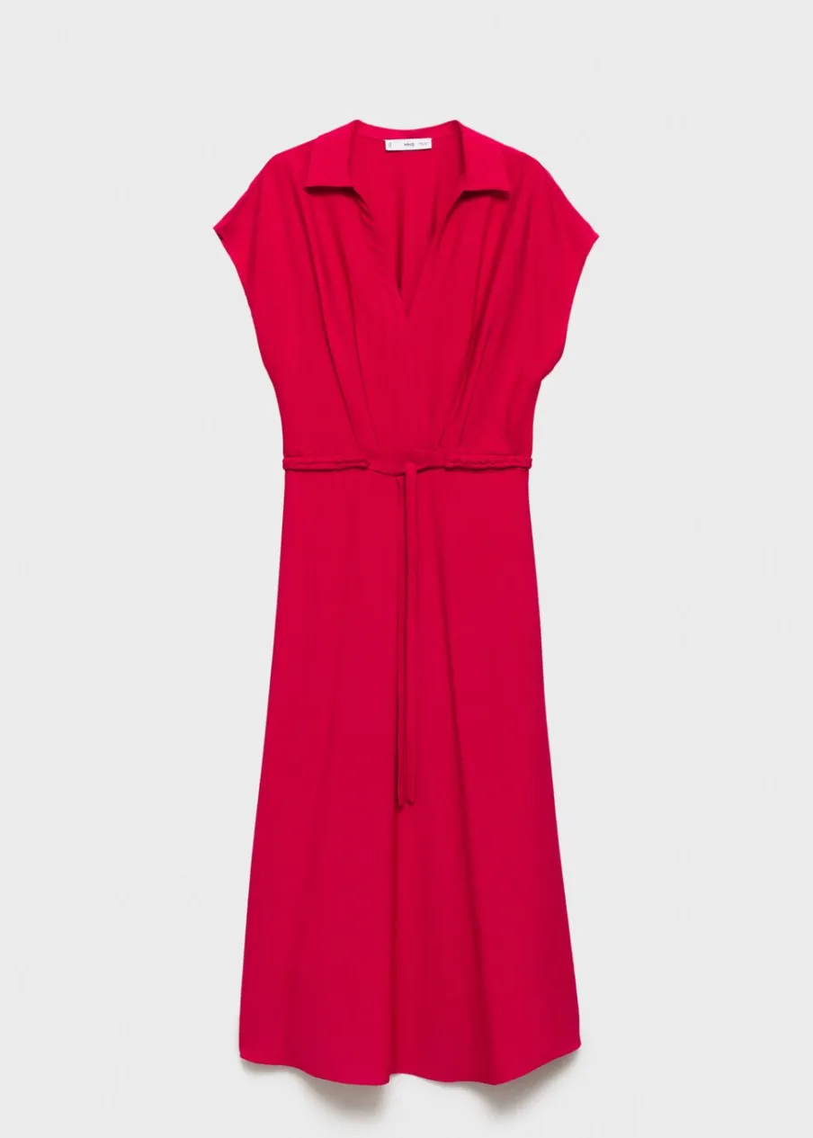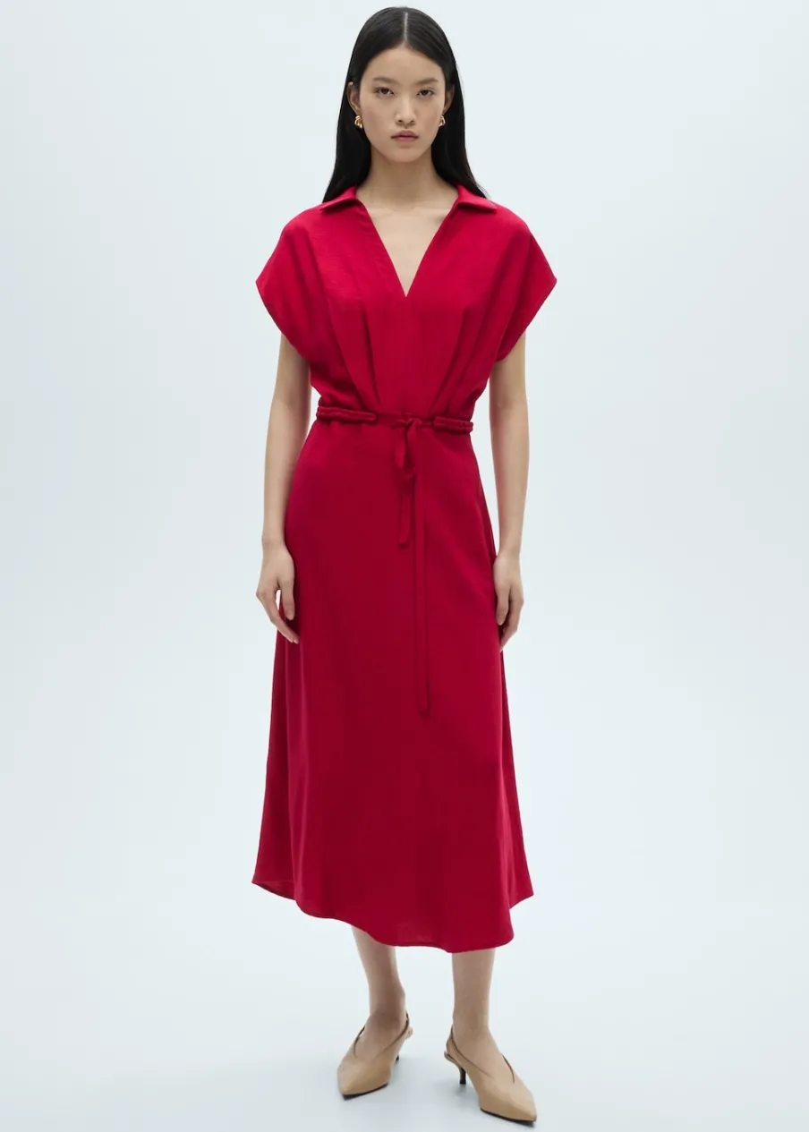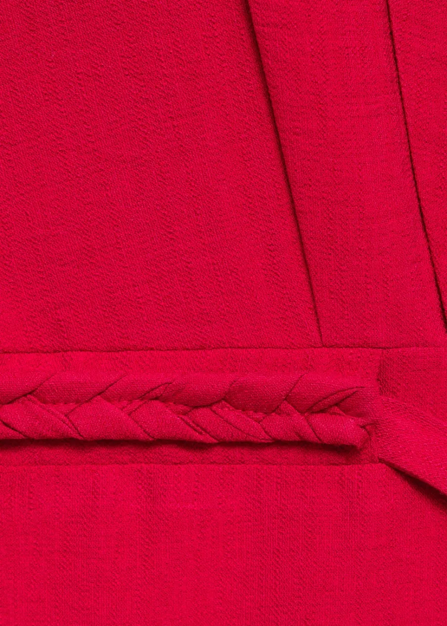 Cienka tkanina. Model evasé. Model prosty. Krój do kolan. Detal z zakładkami. Dekolt V. Krótki rękaw. Elastyczny pas ze sznurkiem. Bez zapięcia.