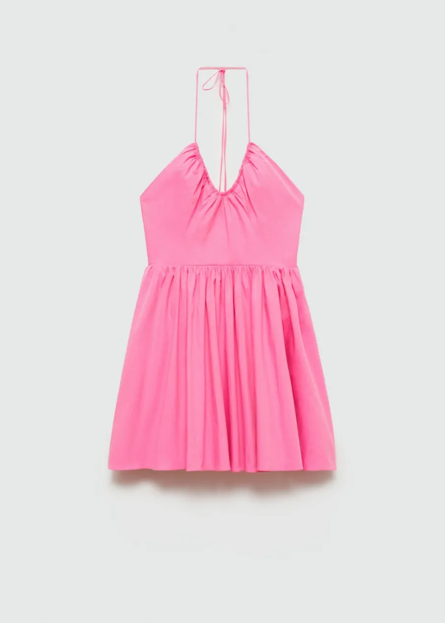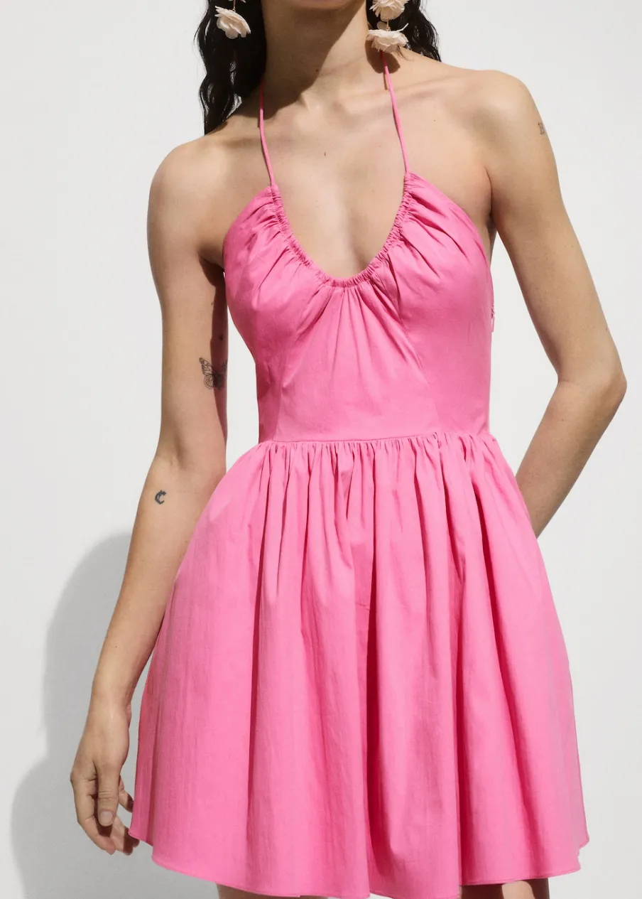 Model evasé. Krótki krój. Marszczenie na dekolcie. Cienkie ramiączka. Plecy z wycięciem. Elastyczne marszczenie. Boczne zapięcie na suwak. Tkanina z 100% bawełny.