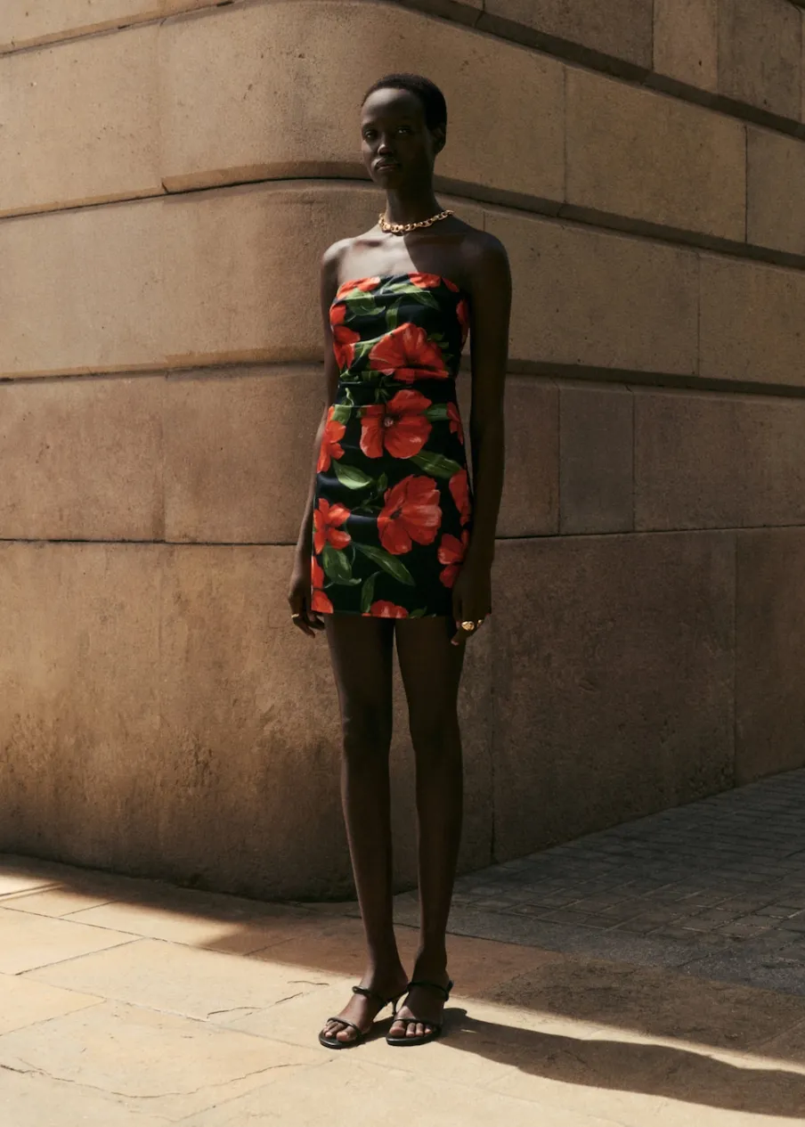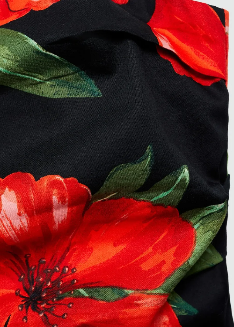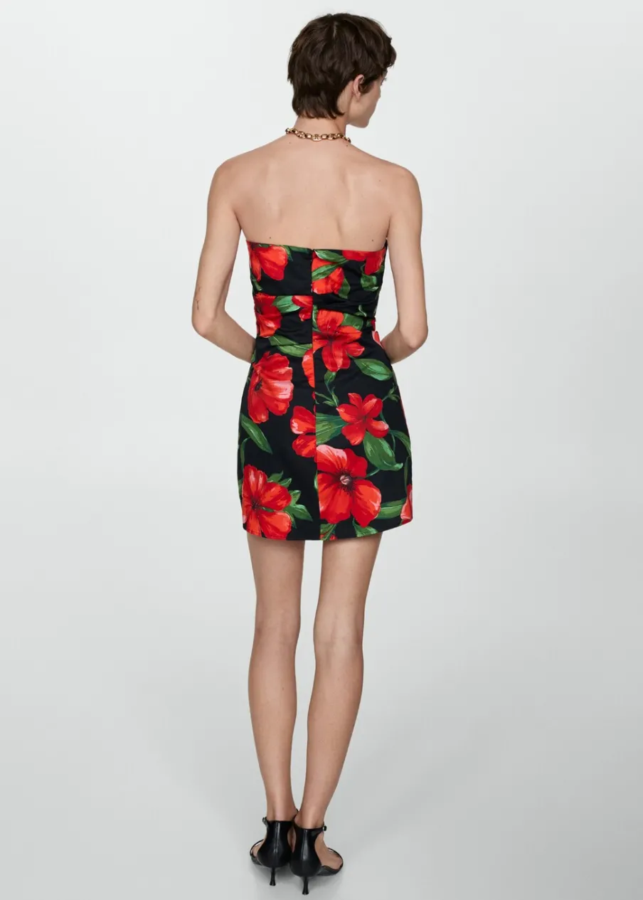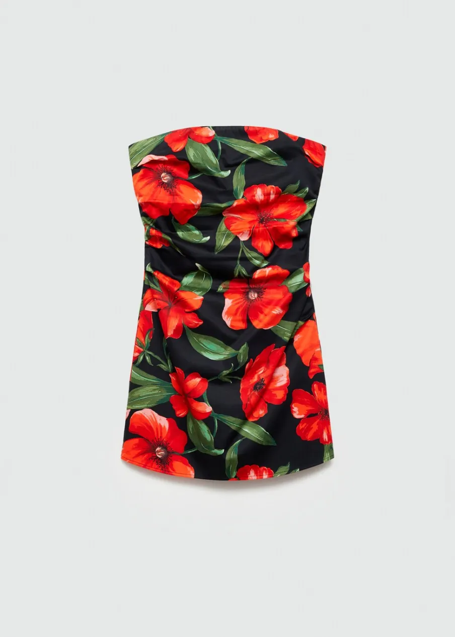 Krótki krój. Wzór w kwiaty. Dekolt bez ramiączek. Bez rękawów. Zapięcie z tyłu na kryty suwak. Wewnętrzna podszewka. Tkanina z 100% bawełny. Model wcięty.