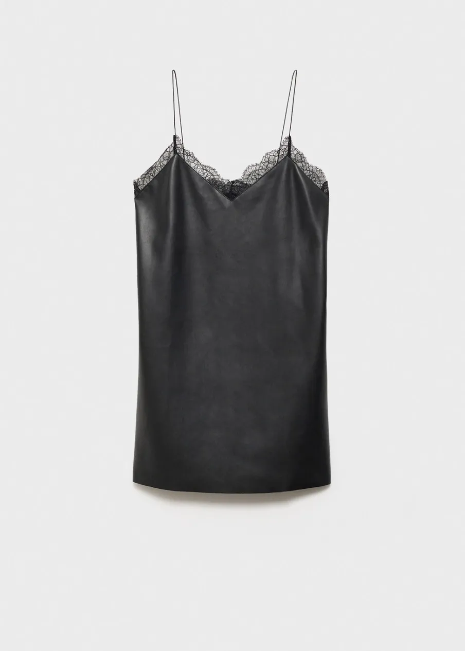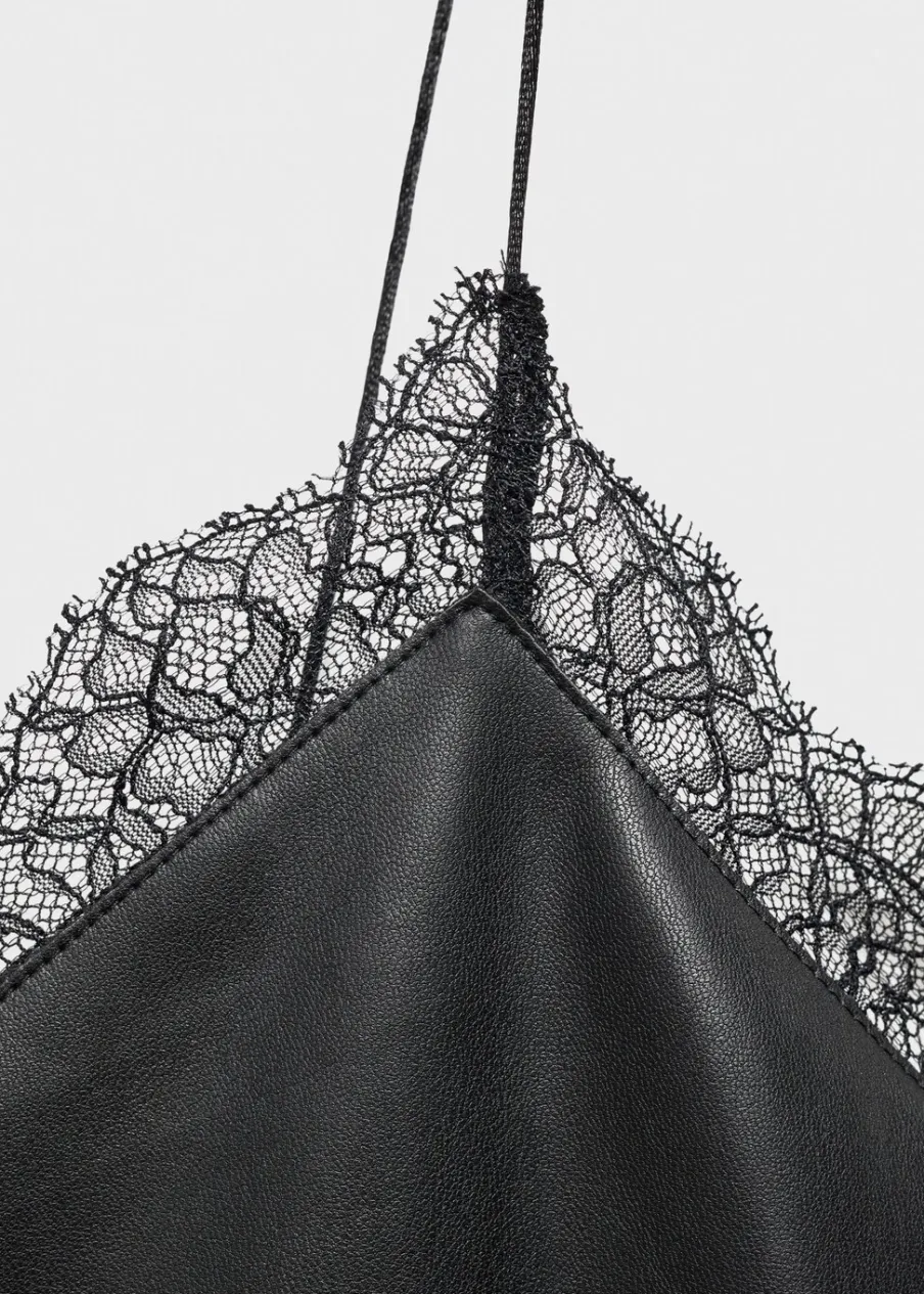 Efekt skóry. W bieliźnianym stylu. Krótki krój. Dekolt V. Cienkie ramiączka. Koronkowe elementy. Bez zapięcia. Modelka ma 179 cm wzrostu i nosi rozmiar S/36. Kolekcja wizytowa. Model prosty. Średnia wielkość.