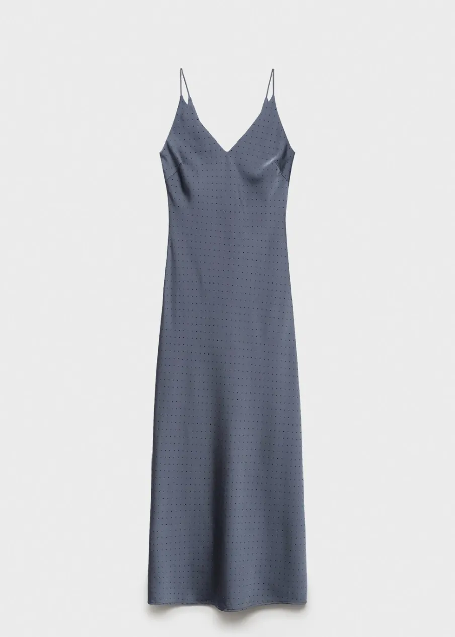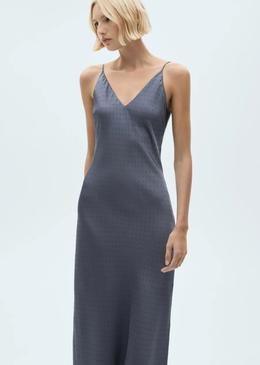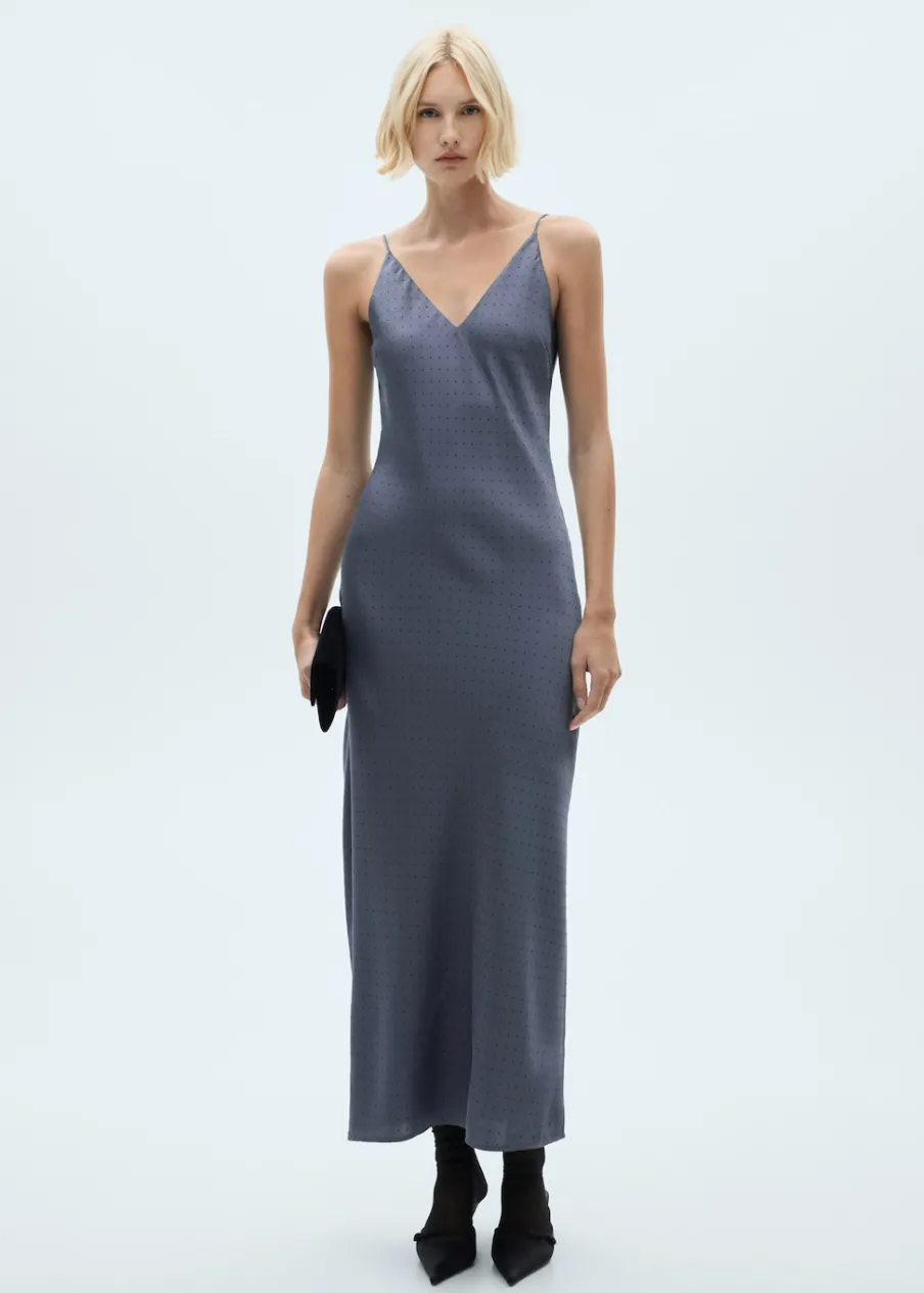 Satynowa tkanina. Lejąca tkanina. Model wcięty. Model długi. Dekolt V. Cienkie ramiączka. Detal strass. Bez zapięcia. Kolekcja wizytowa. Modelka ma 177 cm wzrostu i nosi rozmiar S/36. Modelka ma 178 cm wzrostu i nosi rozmiar S/36.