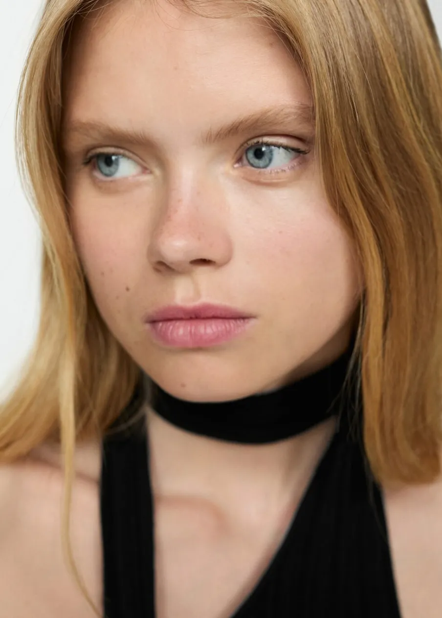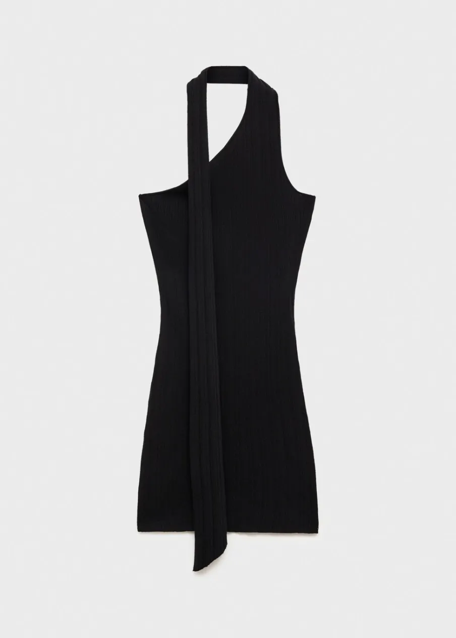 Tkanina z cienkiej dzianiny. Krótki krój. Asymetryczny dekolt. Bez rękawów. Szerokie ramiączko. Bez zapięcia. Wiązanie przy szyi. Bez podszewki. Model wcięty.