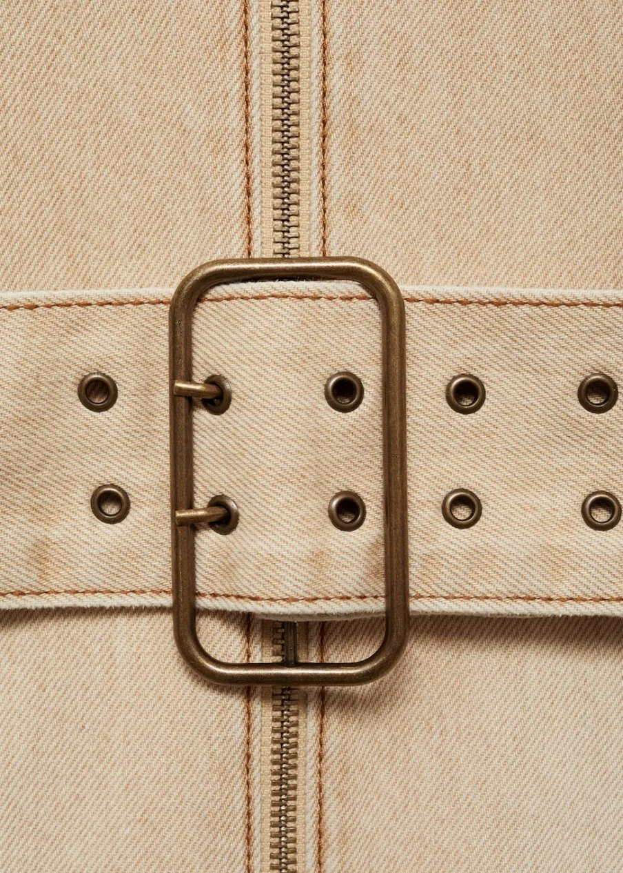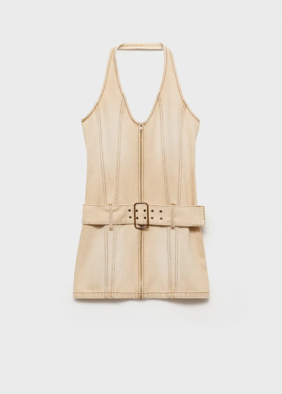 Tkanina bawełniana w dżinsowym stylu. Krótki krój. Dekolt w stylu halter. Bez rękawów. Szlufki. Zapięcie na zamek z przodu. Dekoracyjny pasek. Model wcięty.