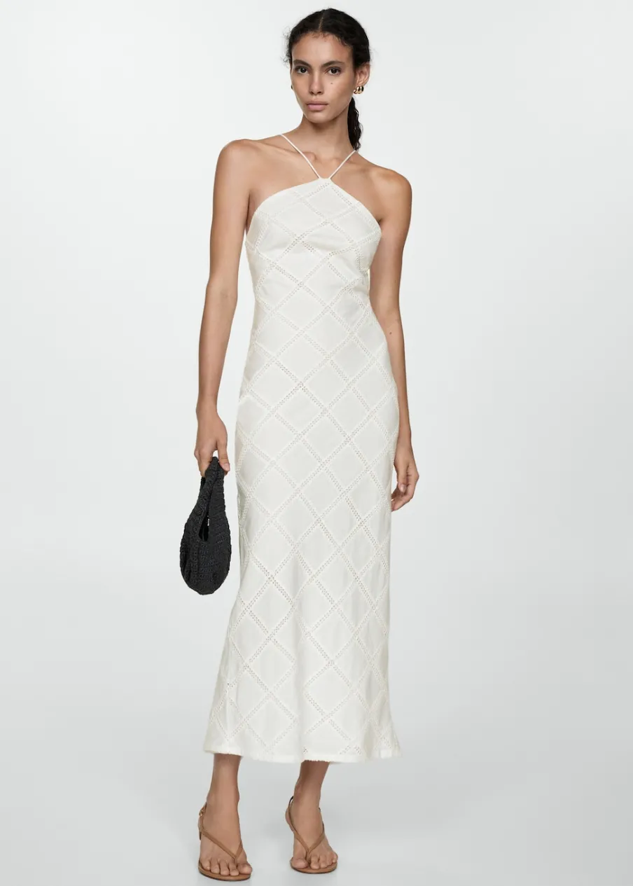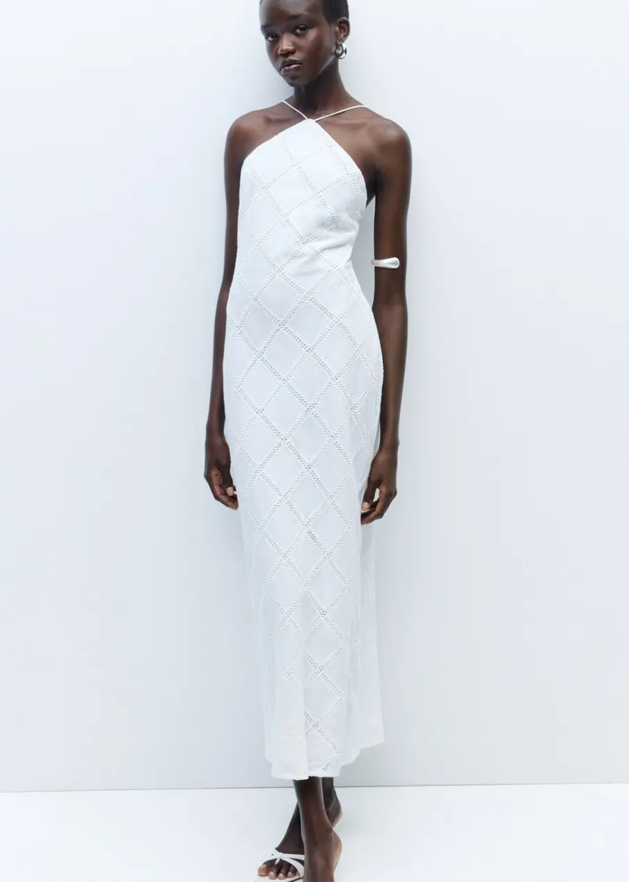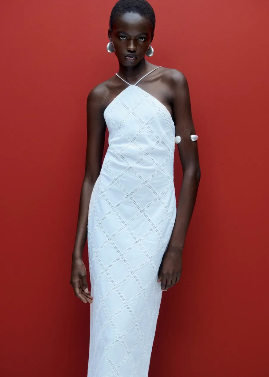 Tkanina mieszanka bawełny. Model prosty. Model długi. Dekolt w stylu halter. Bez rękawów. Cienkie ramiączka. Wiązanie z tyłu. Zapięcie z tyłu na kryty suwak. Detal z rozcięciem z tyłu. Wewnętrzna podszewka. Kolekcja wizytowa. Haftowany motyw.