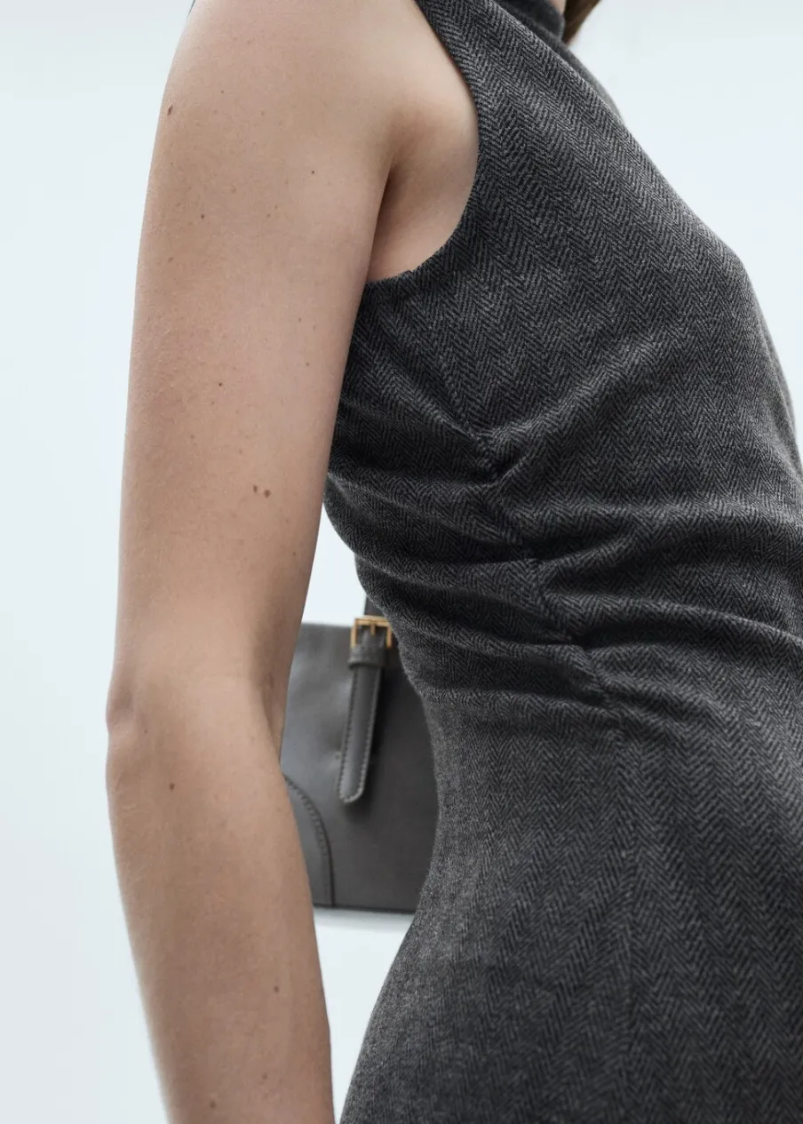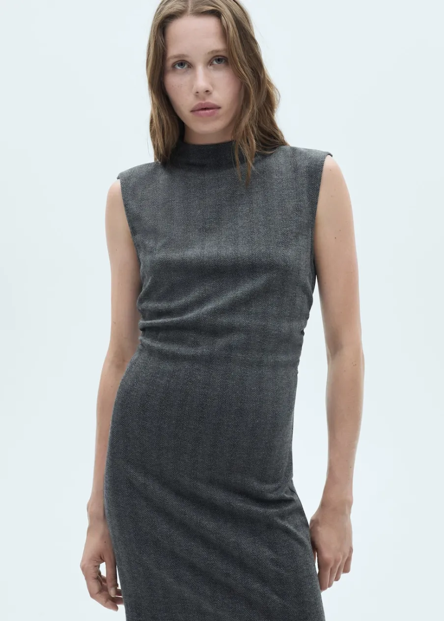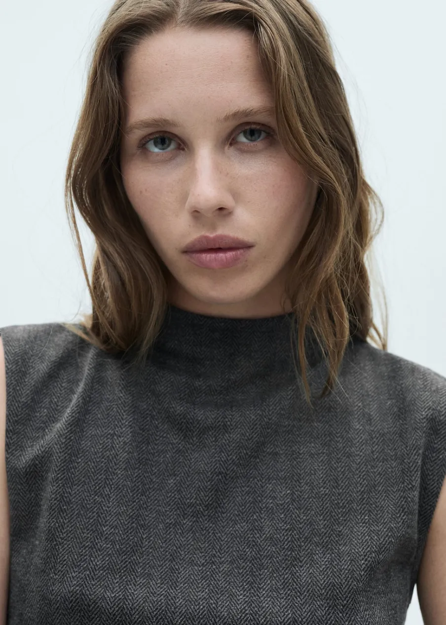 Jodełkowy deseń. Krótki krój. Bez rękawów. Półgolf. Modelka ma 175 cm wzrostu i nosi rozmiar S/36. Model wcięty.