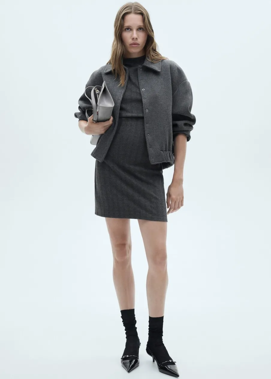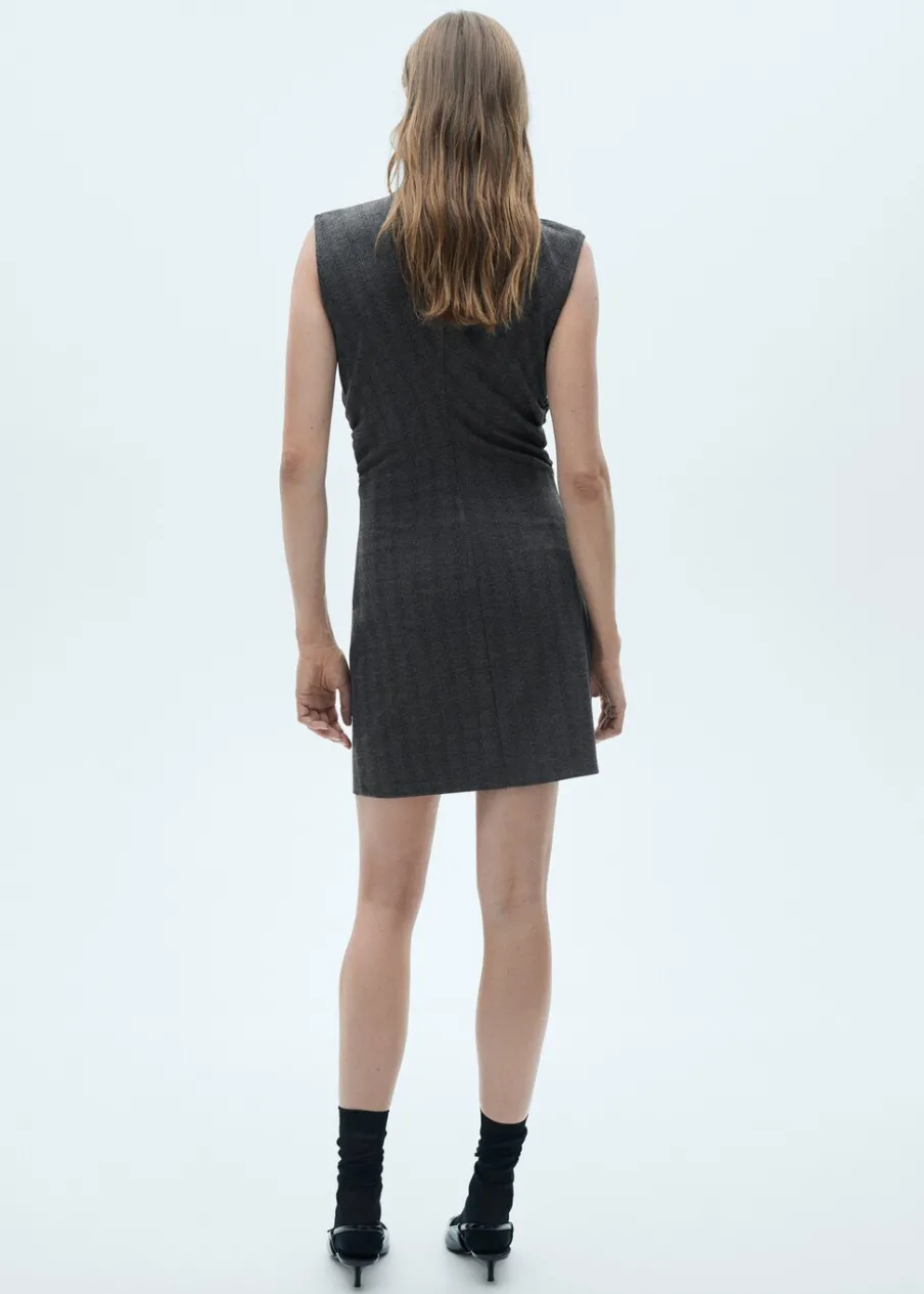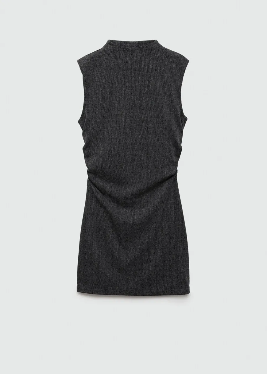 Jodełkowy deseń. Krótki krój. Bez rękawów. Półgolf. Modelka ma 175 cm wzrostu i nosi rozmiar S/36. Model wcięty.