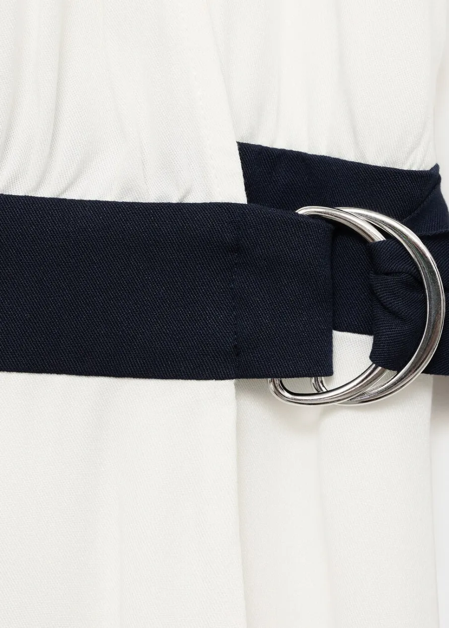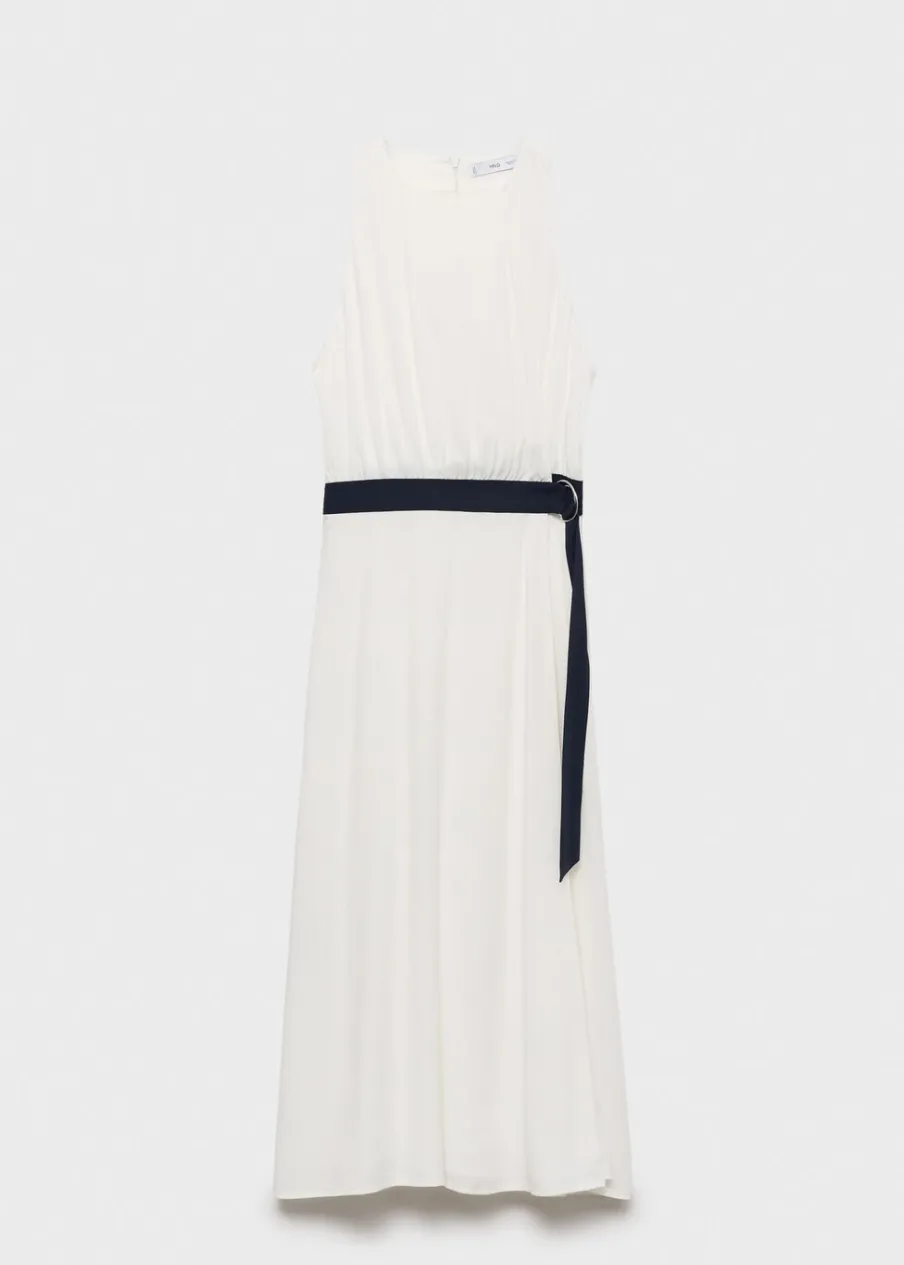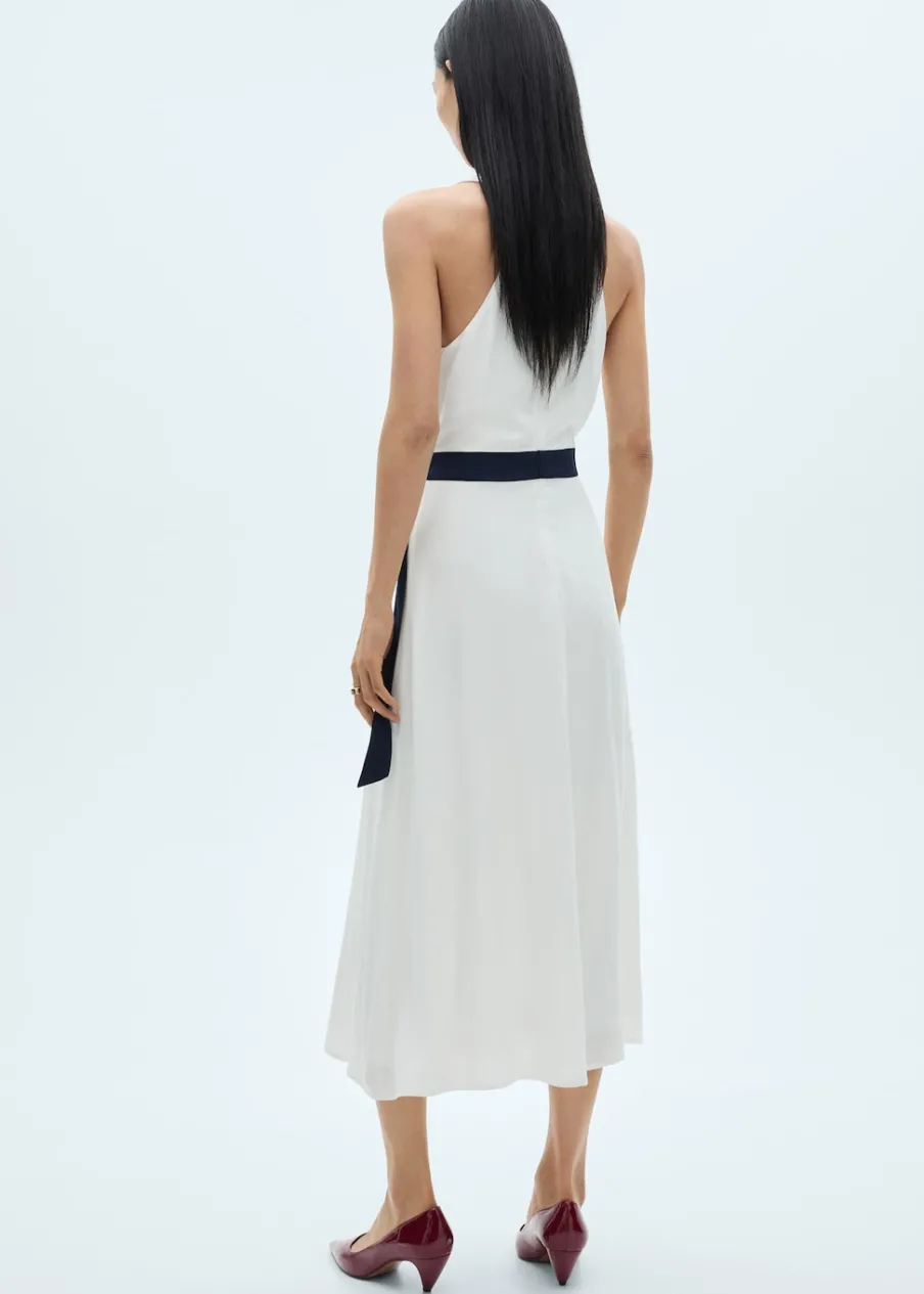 Lejąca tkanina. Krój do kolan. Model evasé. Bez rękawów. Okrągły dekolt. Zapięcie z tyłu na kryty suwak. Kontrastowy pas.