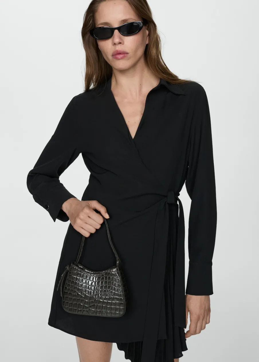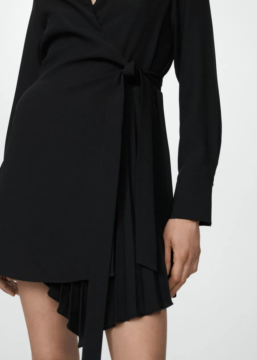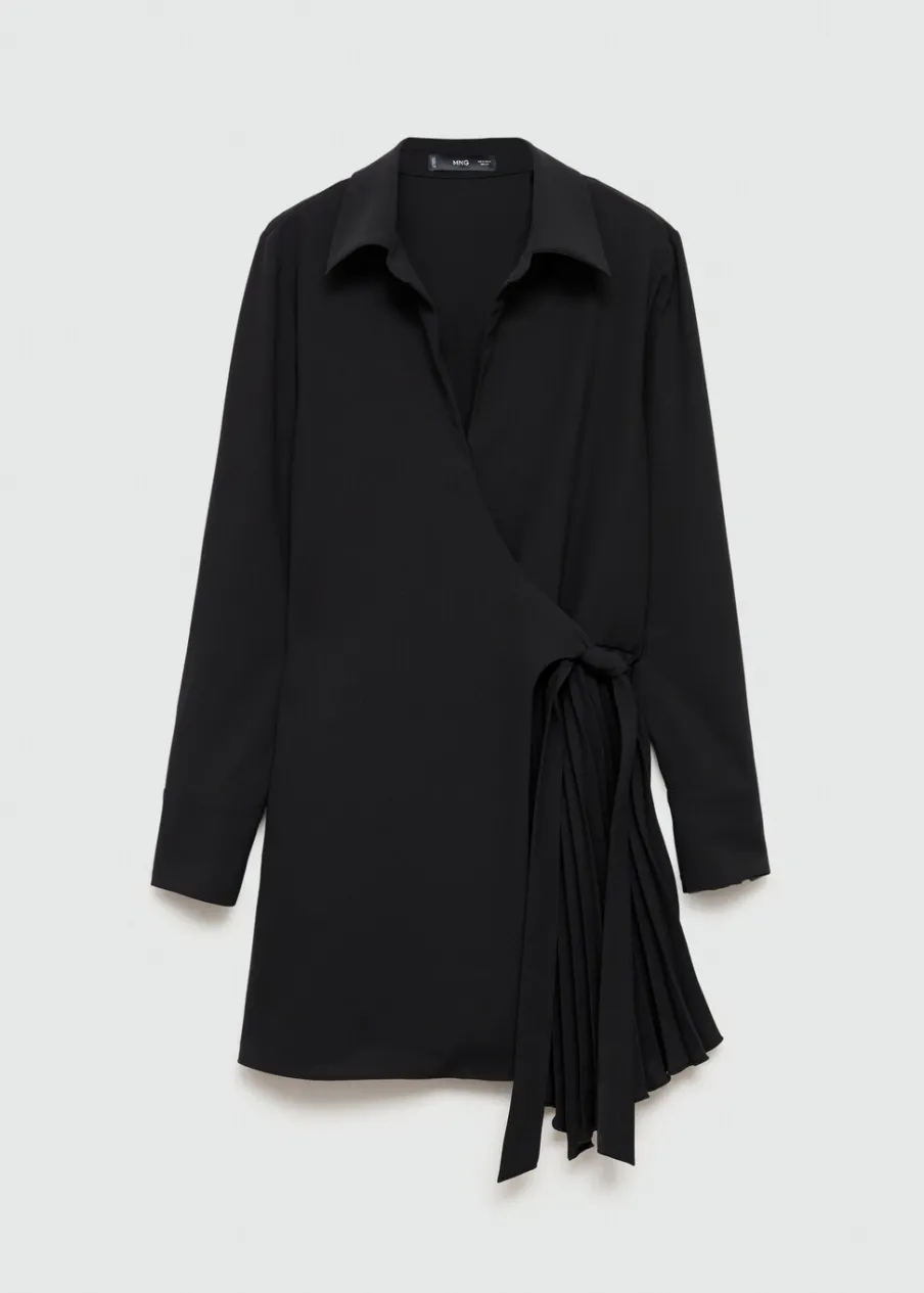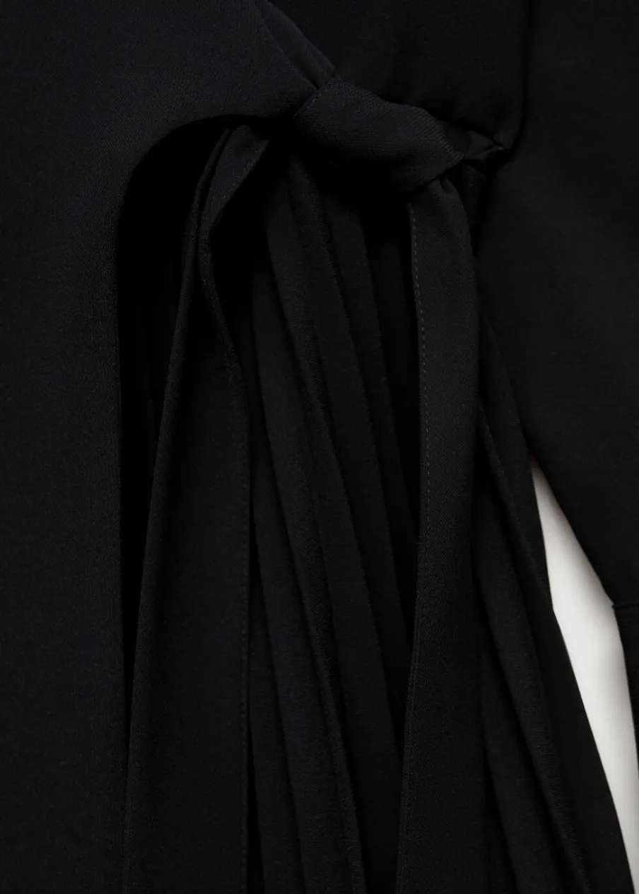Lejąca tkanina. Krótki krój. Model prosty. Model zakładany. Koszulowy kołnierz. Krótki rękaw. Wiązanie z boku. Plisowany detal.
