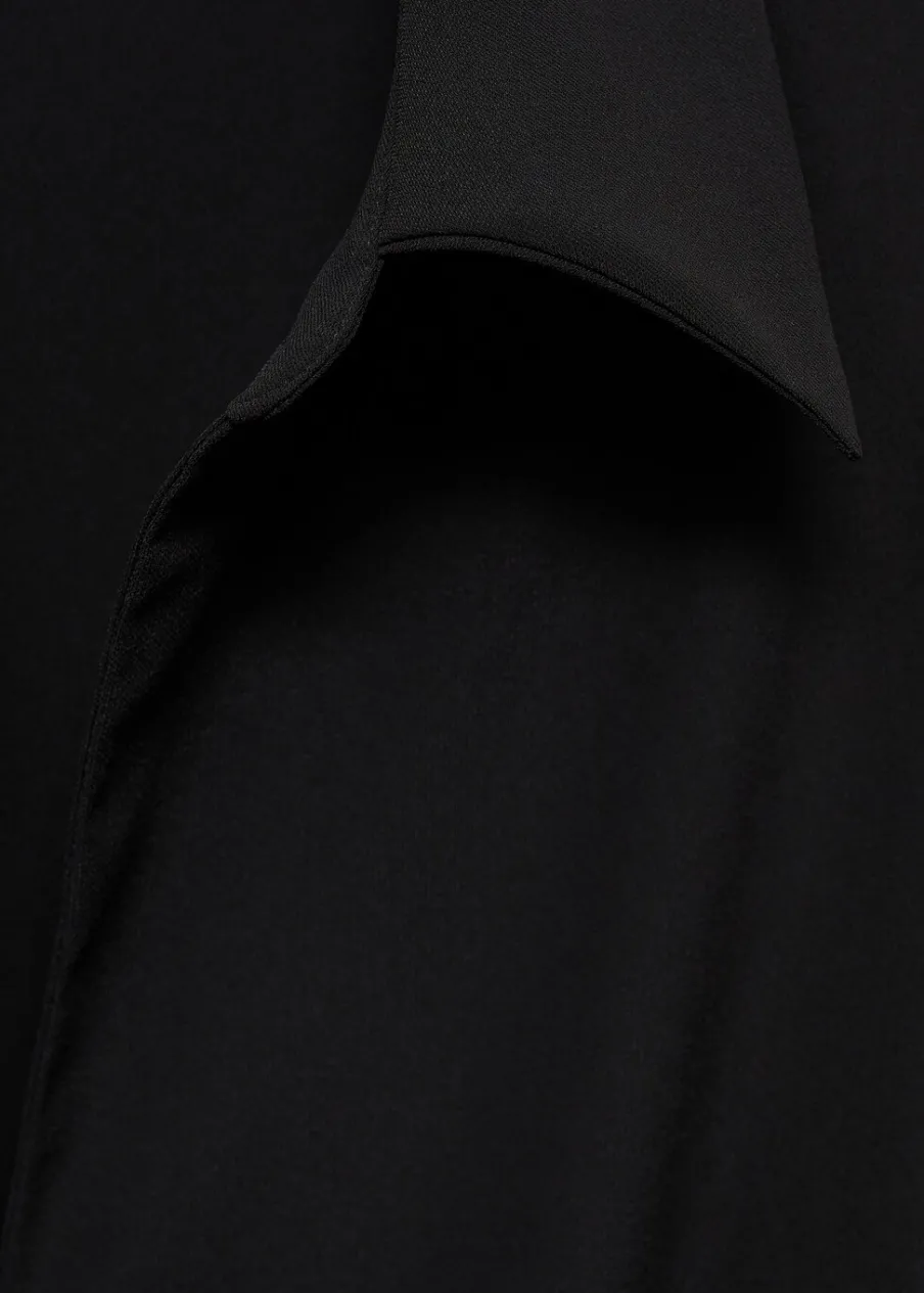 OpisLejąca tkanina. Krótki krój. Model prosty. Model zakładany. Koszulowy kołnierz. Krótki rękaw. Wiązanie z bok…