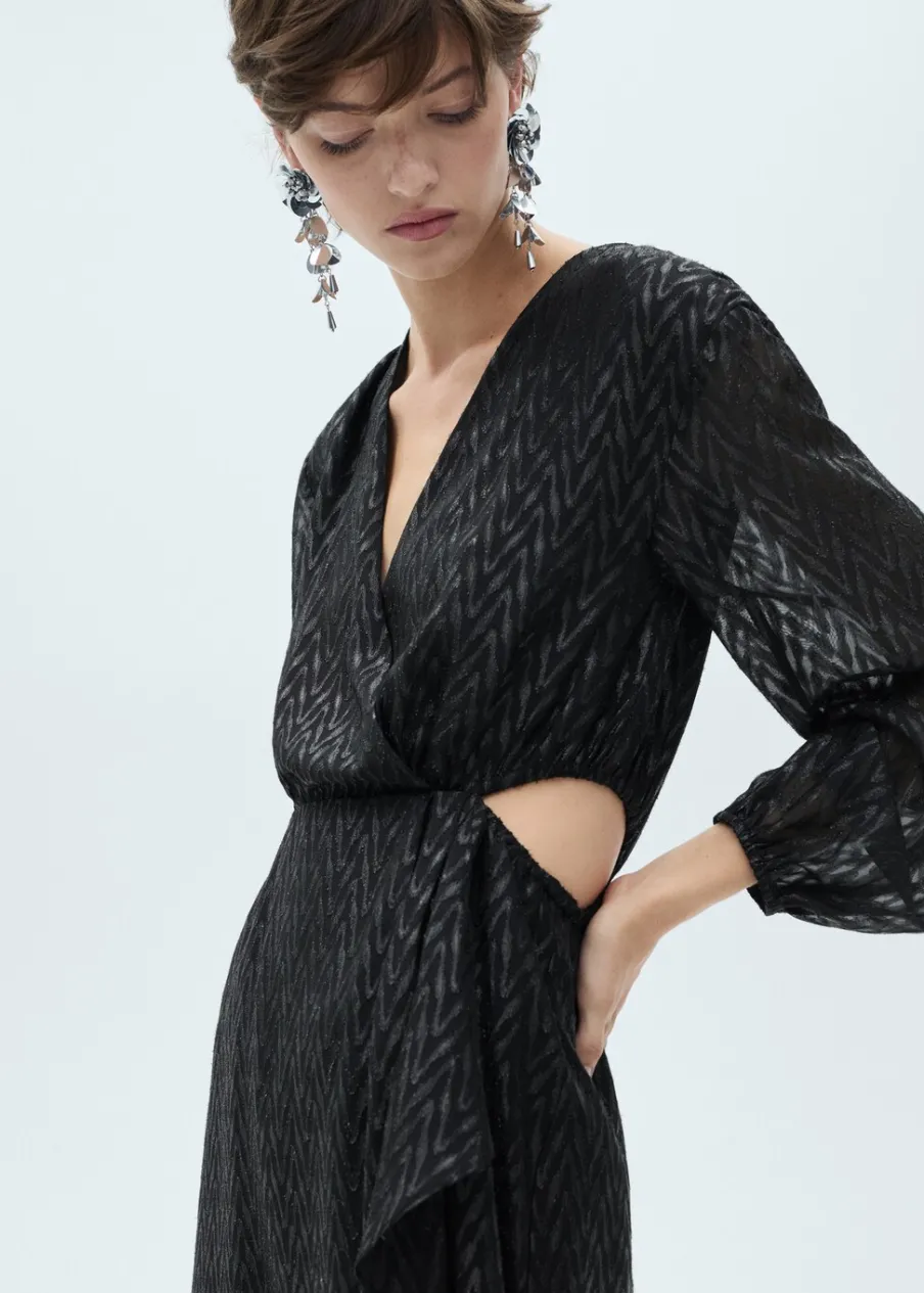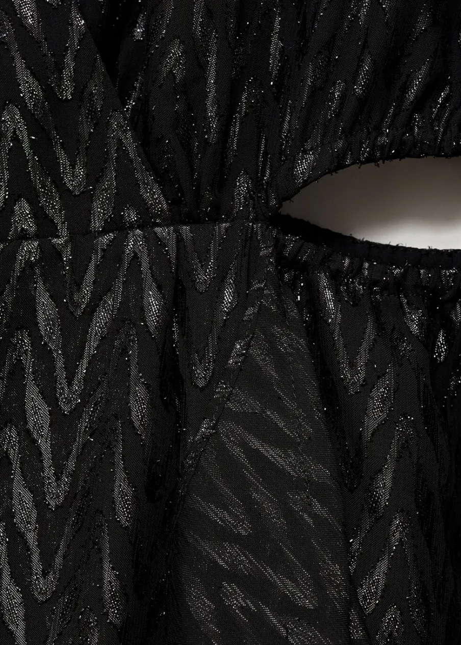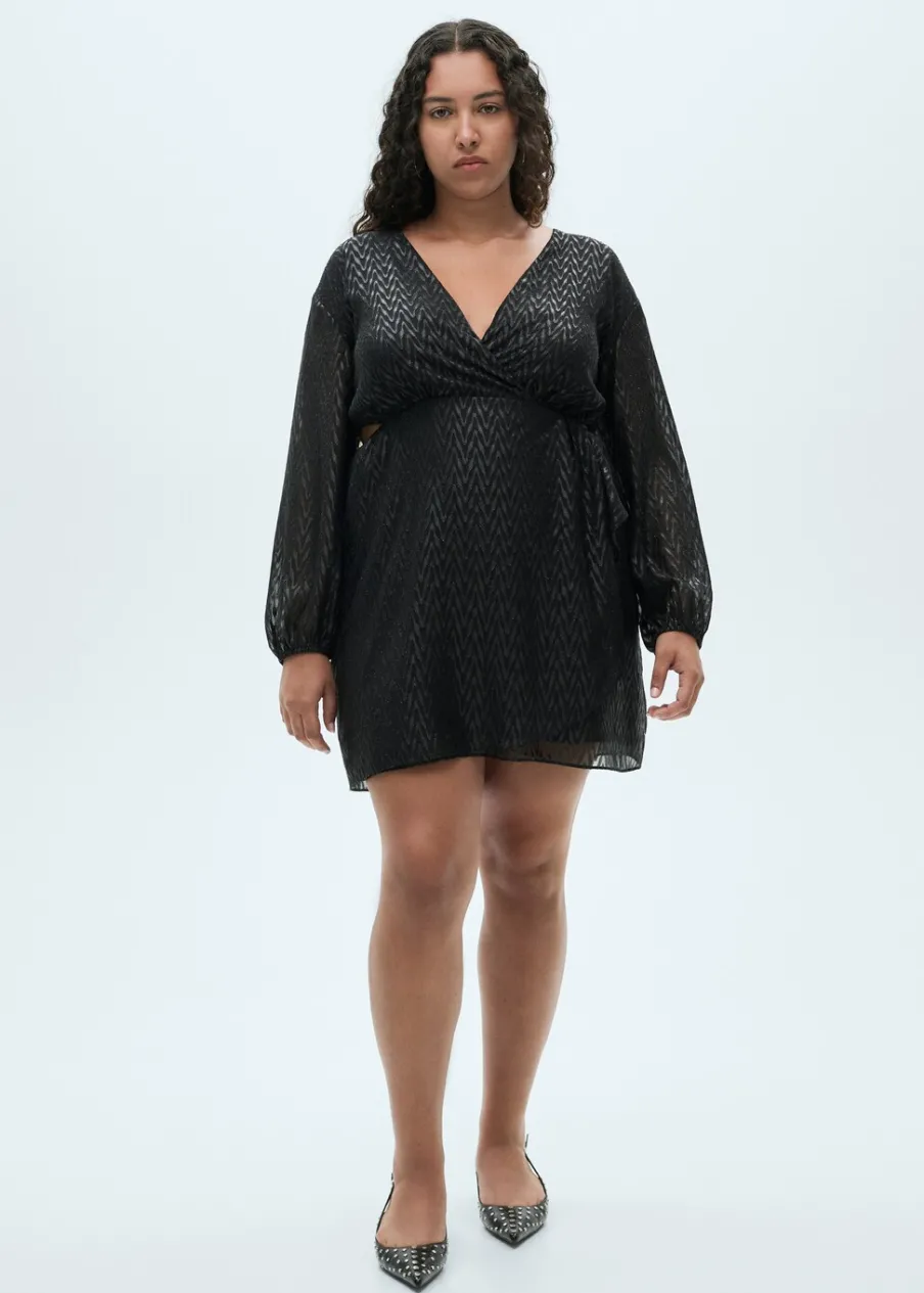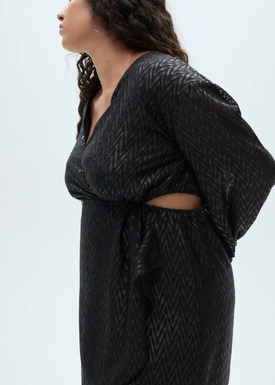 Lejąca tkanina. Model zakładany. Model evasé. Krótki krój. Zakładany kołnierz. Długi bufiasty rękaw. Zapięcie z tyłu na suwak. Błyszczące zdobienie. Wycięcie. Rozcięcia po bokach. Dostępne w Plus Size. Kolekcja wizytowa.